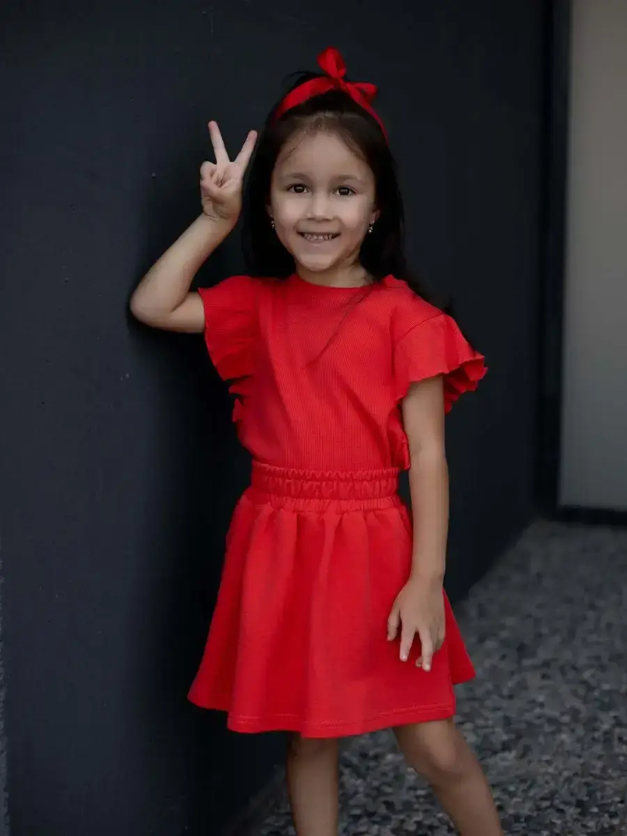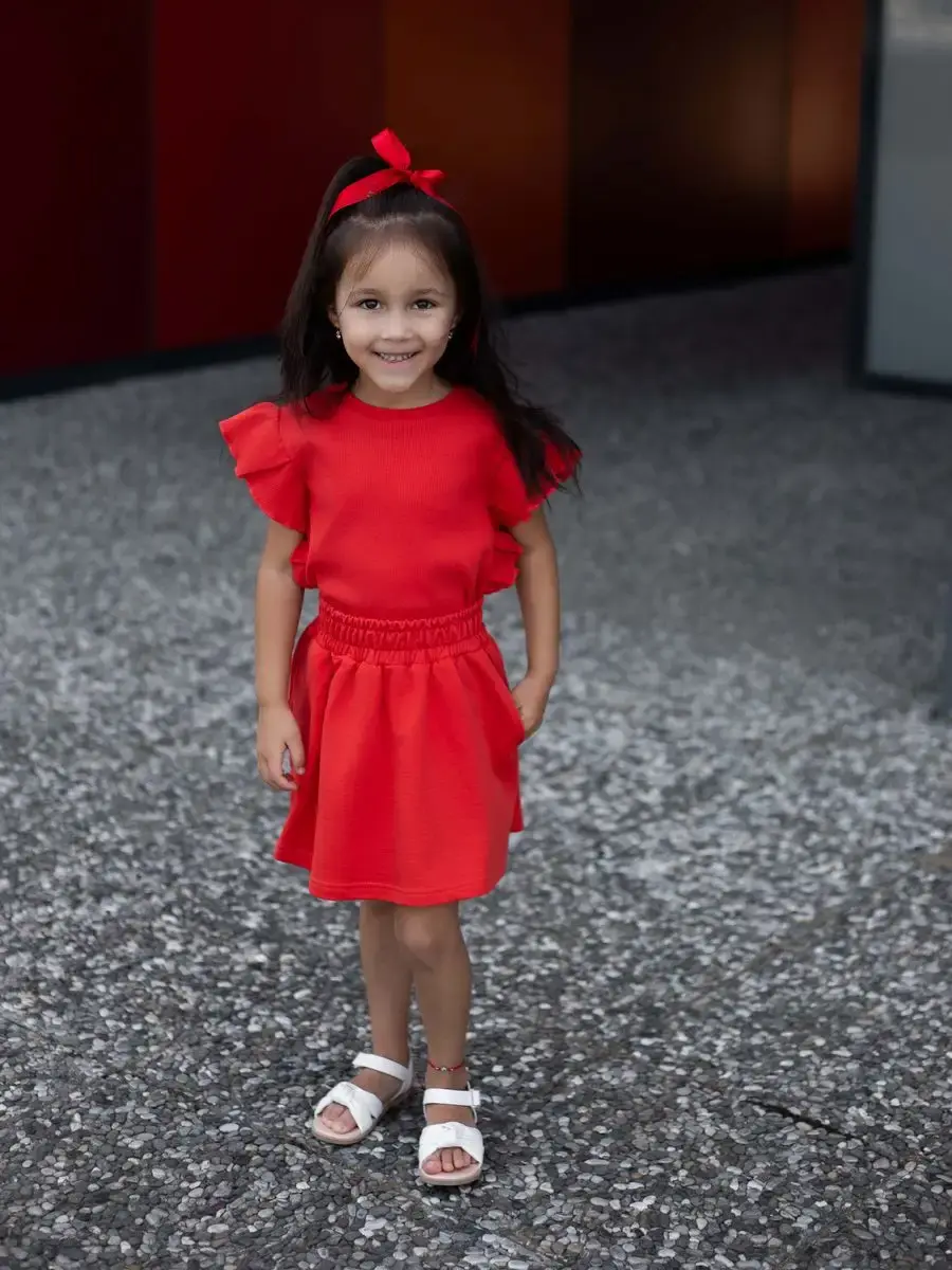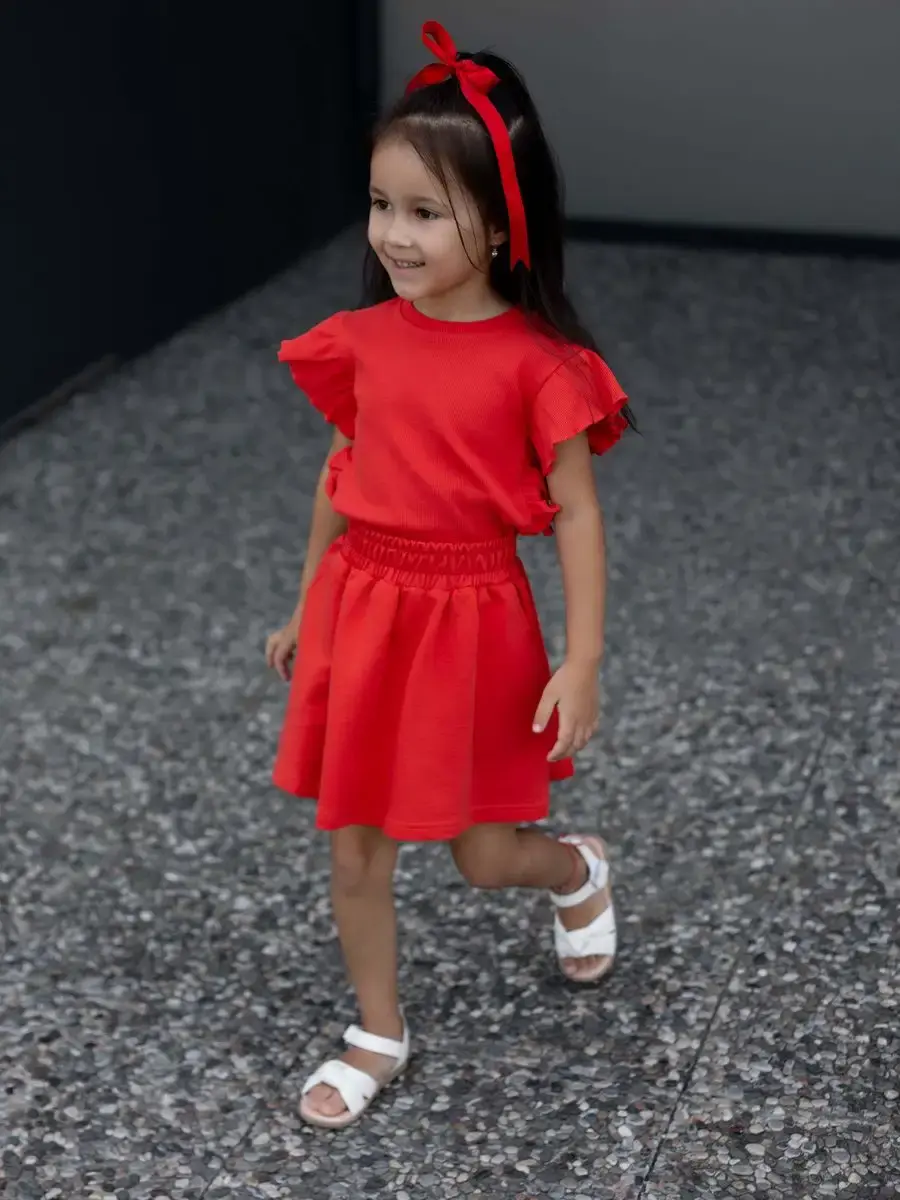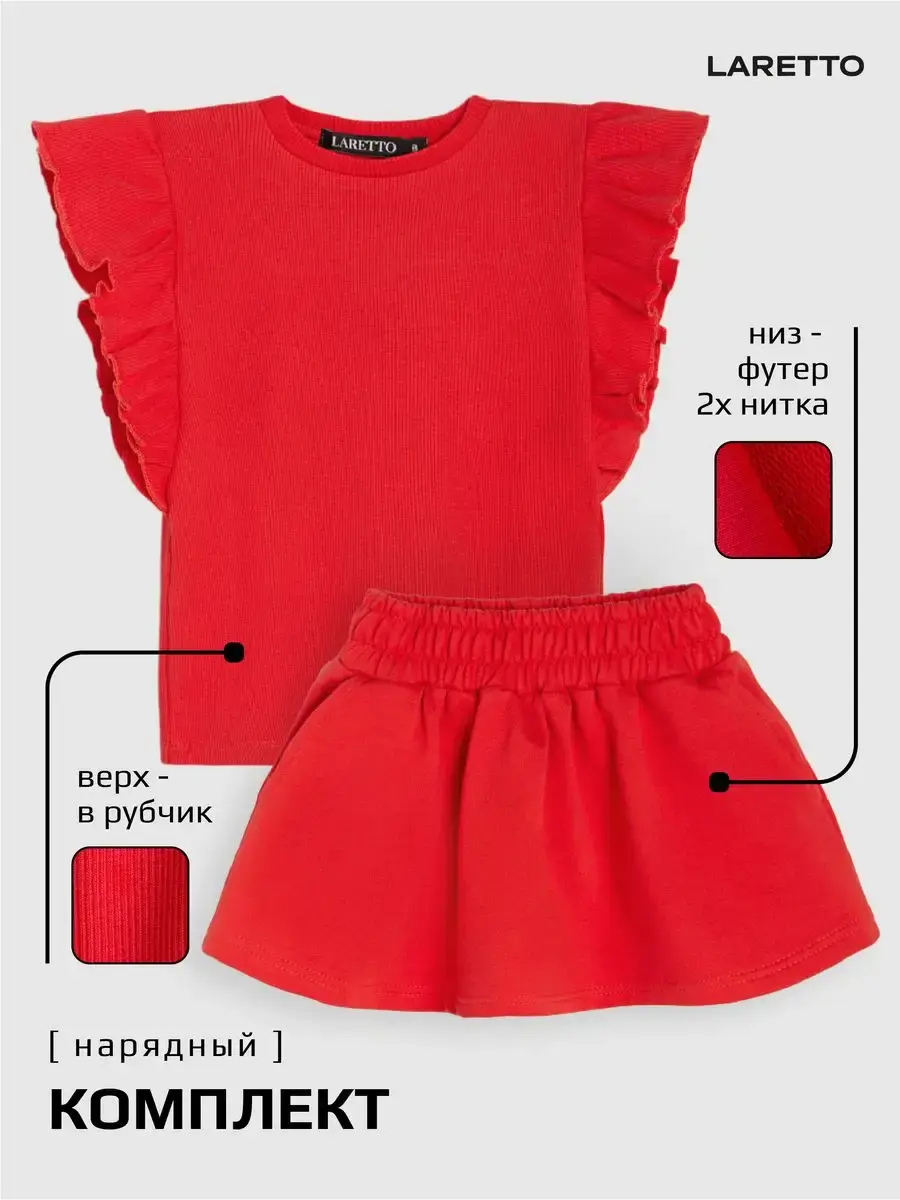 Костюм летний трикотажный непременно станет самым любимым в гардеробе каждой юной модницы! Майка детская в рубчик с рукавами рюшами и юбка мини выше колена - это подходящий вариант для садика, активного отдыха на природе, путешествий, похода в кино, гости или на праздник. Топик для девочки выполнен из нежнейшего трикотажа кашкорсе, невероятно мягкой и эластичной и ткани, которая практически не ощутима во время носки. Юбочка на резинке из футера хорошо сидит, держит форму и подчеркивают силуэт. Футболка хорошо сочетается с любым низом и верхом в одежде. Нарядный костюм идеален для праздничного торжества или фотосессии. Комплект не имеет застежек, поэтому Ваш ребенок сможет легко одеваться самостоятельно. Модель подойдет как малышкам, так и подросткам. Вся коллекция вещей для детей отшивается из натуральных, дышащих материалов Премиум качества и поэтом не вызывает раздражения и дискомфорта на коже. Не упустите возможность приобрести этот качественный товар уже сегодня! Он станет чудесным подарком дочке, сестре, внучке, племяннице без повода и на любое событие. Порадуйте своего ребенка красивой и стильной одеждой от российского бренда LARETTO. Приятных Вам покупок!