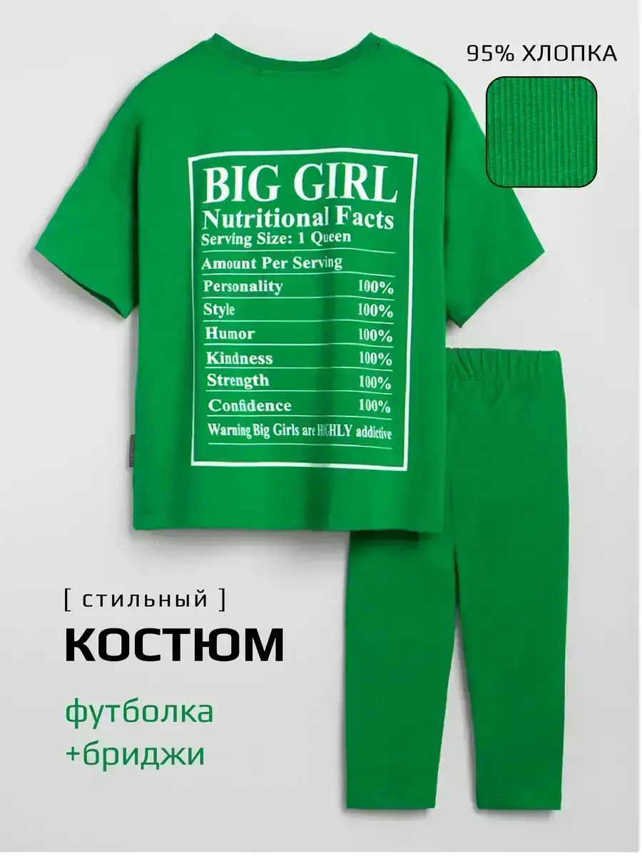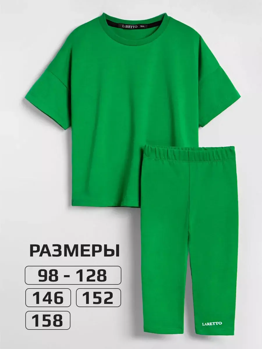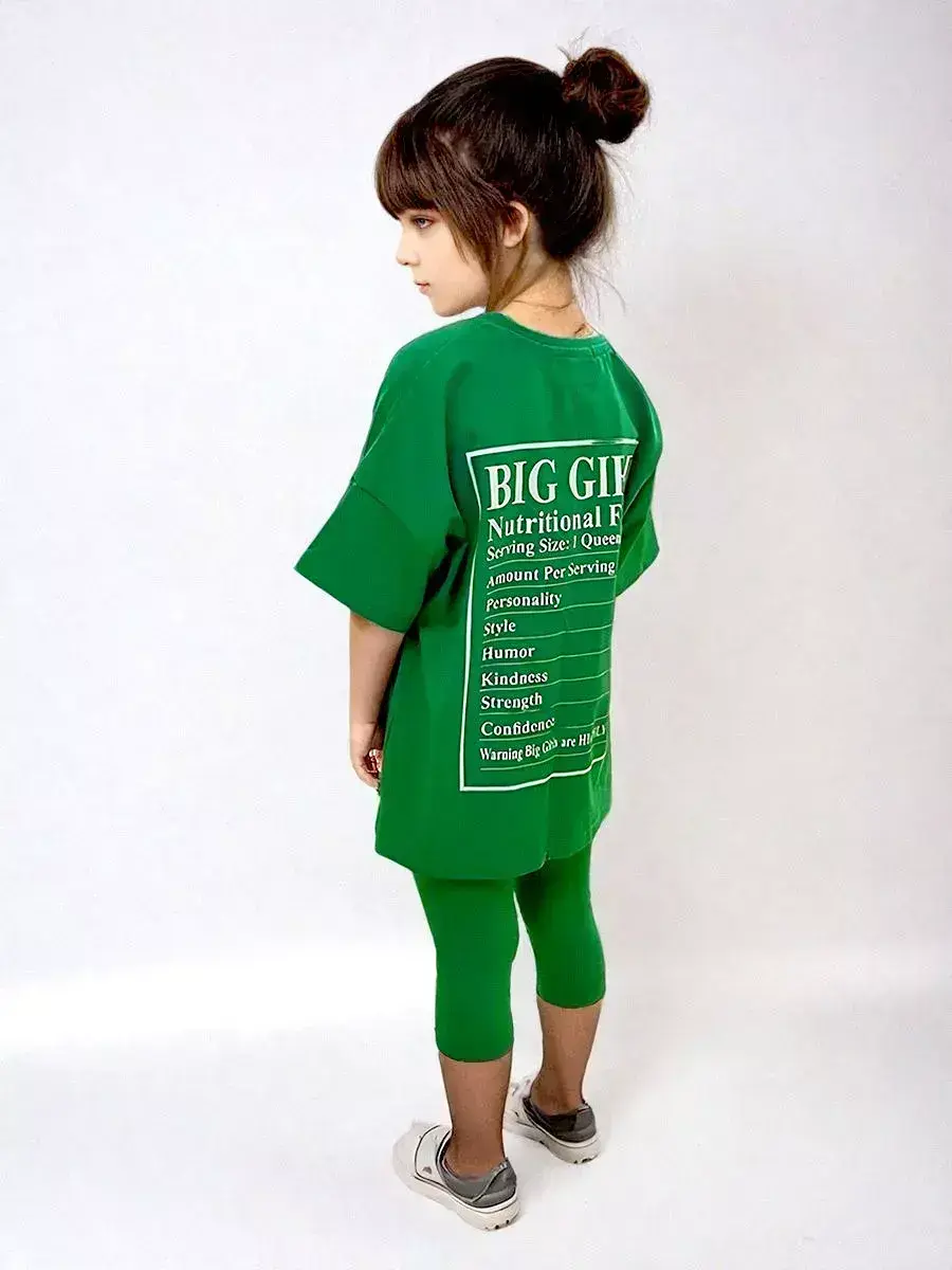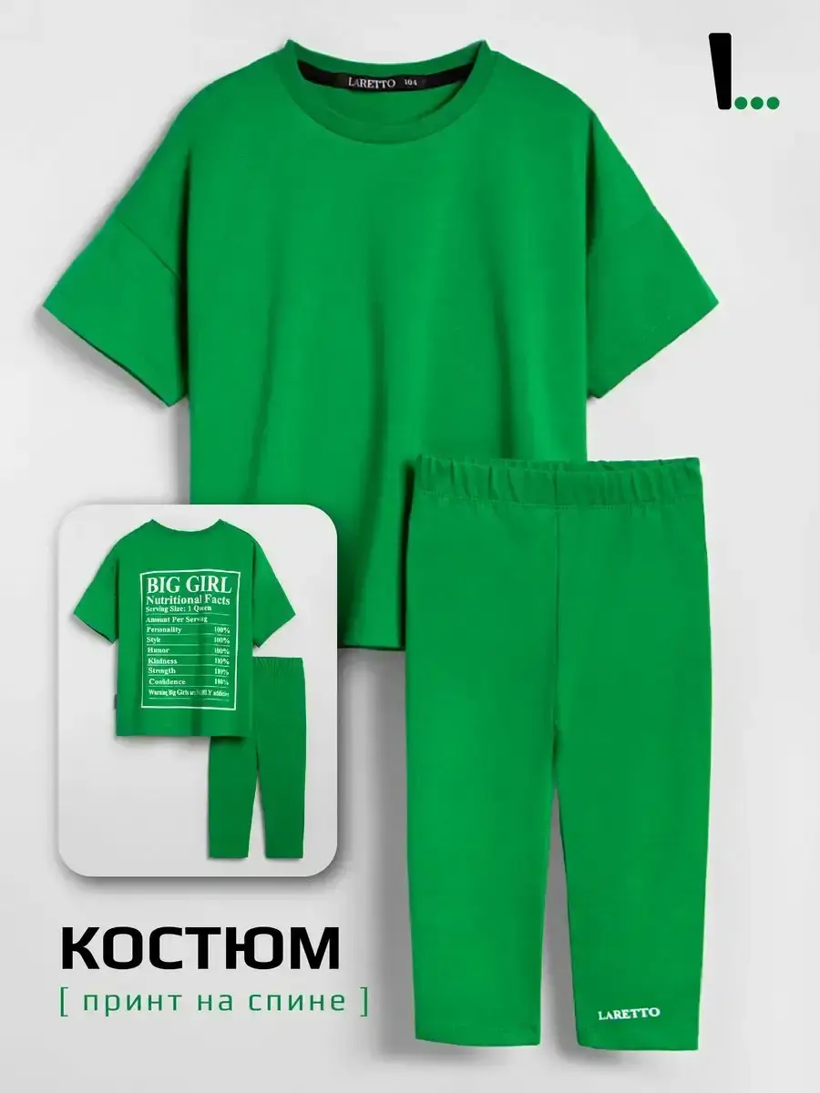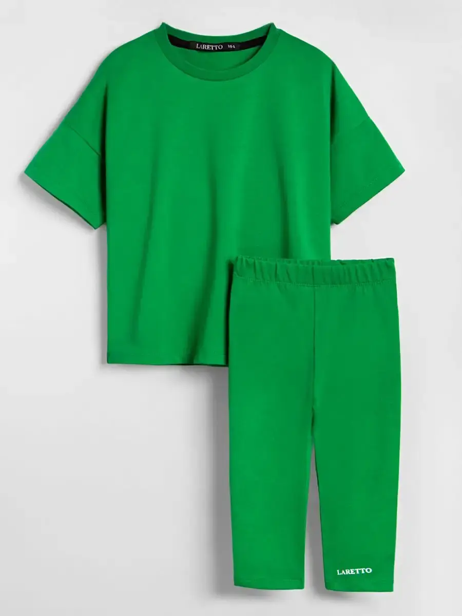 Костюм для девочки летний от российского бренда LARETTO - это стильный и практичный вариант как на лето так и на осень. Он выполнен из Премиум трикотажа, который обеспечивает комфорт и удобство в течении всего дня. Бриджи детские имеют плотную мягкую резинку, которая дает хорошую посадку и подчеркивает силуэт. Футболка оверсайз для детей свободного кроя со слегка приспущенным рукавом - тренд в этом сезоне! Необычный принт и зелёный цвет добавляют индивидуальности. Спортивный наряд незаменим для садика, активного отдыха на природе и секций, а также для уроков физкультуры в школе. Благодаря натуральному составу он хорошо впитывают влагу и быстро сохнут, что помогает коже дышать и чувствовать себя комфортно как летом так и осенью. Идеально подходит для танцев, гимнастики, лёгкой атлетики. Они рассчитаны для малышек с двух лет и подростков. Трендовые расцветки позволяют сочетать верх и низ с любыми вещами, создавая яркие образы каждый день! Для того чтобы изделие радовало вас дольше, обратите внимание на рекомендации об уходе (бережная стирка при t не более 30C). В нашем магазине представлен большой ассортимент модных и качественных комплектов.