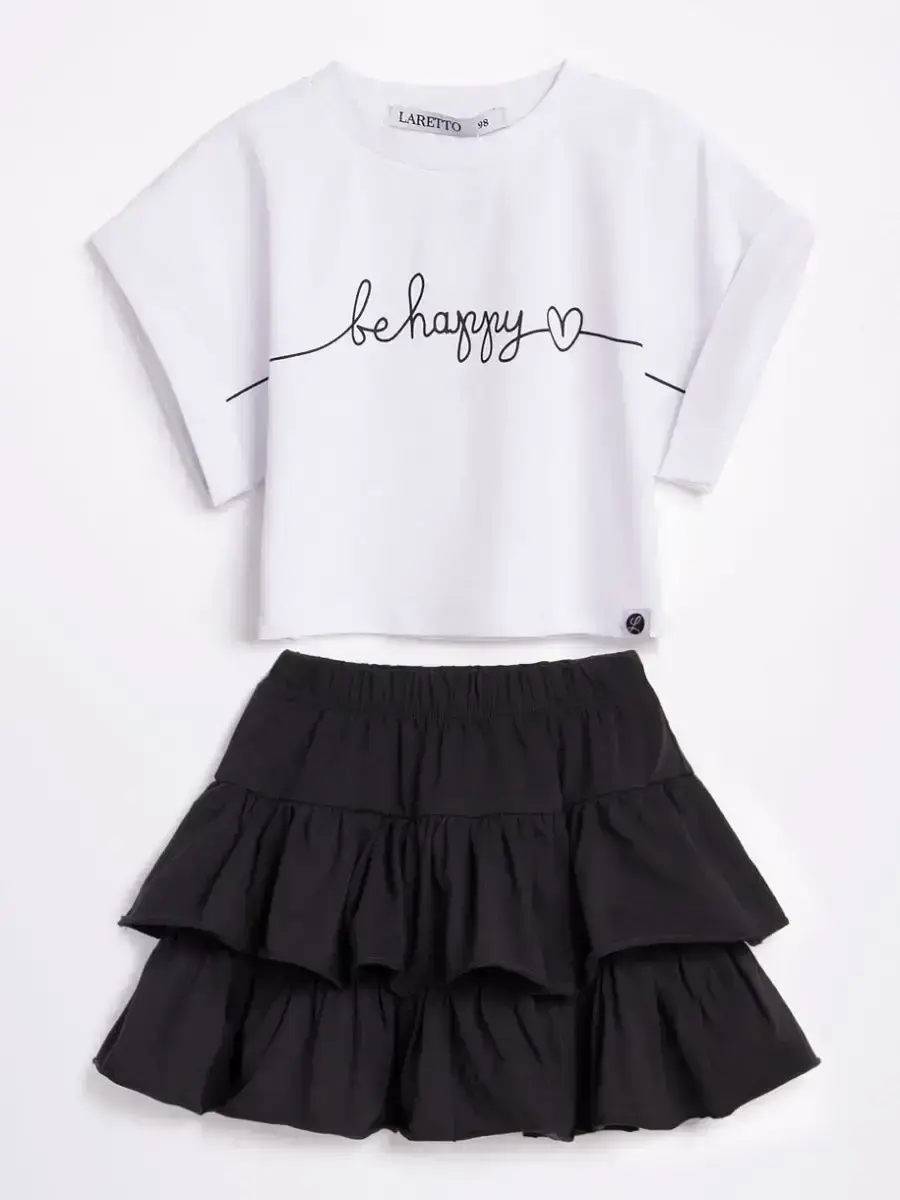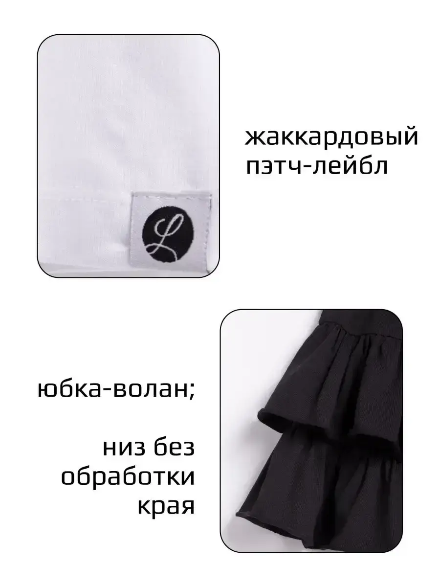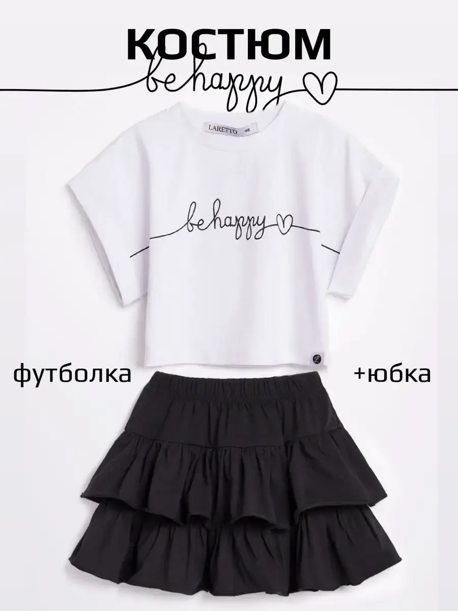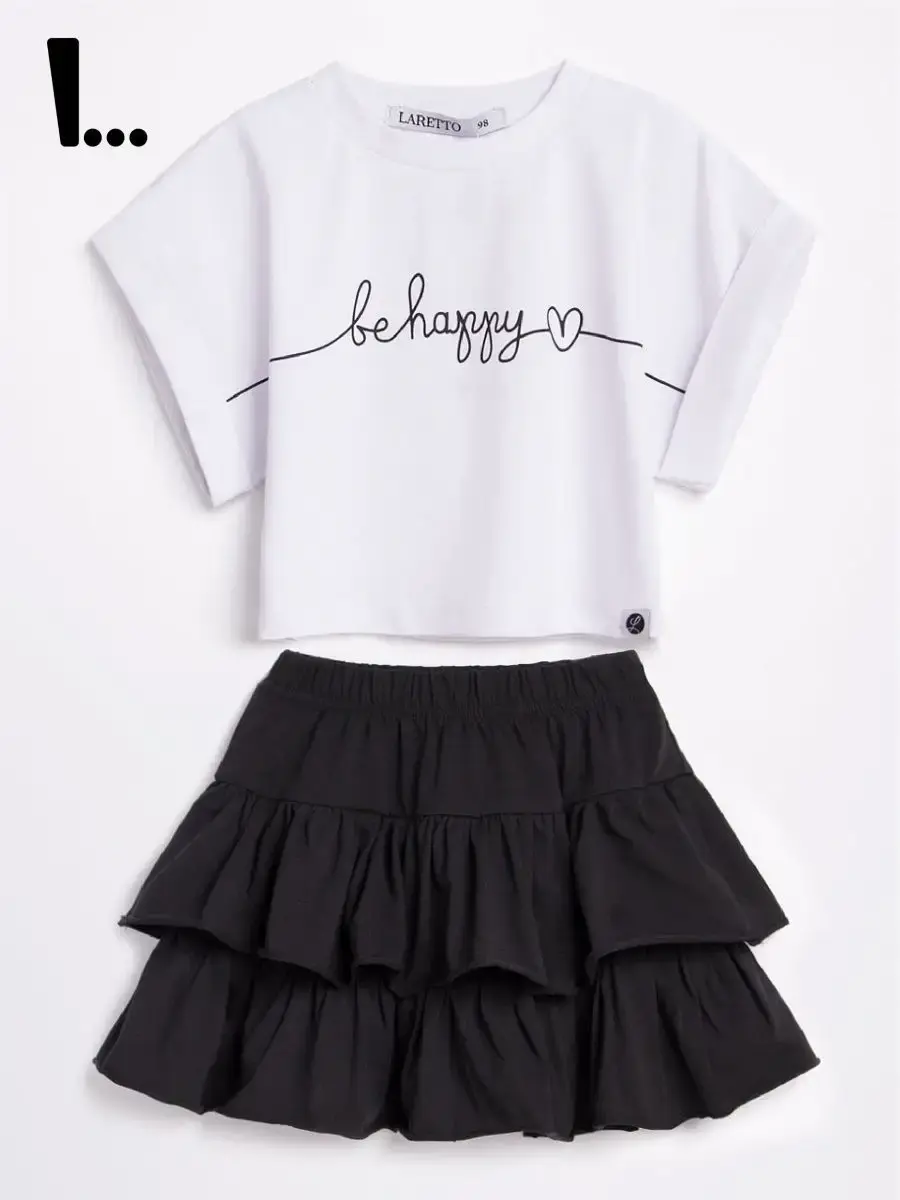 Костюм для девочки трикотажный от бренда LARETTO непременно станет фаворитом в гардеробе Вашего ребенка! Костюм белый верх черный низ для девочки идеально подойдет для любых формальных мероприятияй в школе или садике. Топ укороченный и пышная юбка с воланами-прекрасный вариант в жаркую погоду для повседневной носки в садик, похода в кафе, поездки на море и путешествий. Летний костюм выполнен из хлопкового трикотажа (кулирная гладь), который не раздражает кожу и позволяет ей дышать. Топ детский свободного кроя не сковывает движения, легкий и стильный, хорошо сочетается также с джинсами, лосинами, шортами или велосипедками. Юбка для девочки с рюшами подчеркнет индивидуальность и добавит игривости модному образу малышки. Костюм трикотажный хорошо подходит и в качестве домашней одежды, благодаря качественному крою он очень приятный и комфортный. Костюм для девочки с юбкой легко совмещать с различными аксессуарами и обувью. Комплект идеально садится по фигуре. Большой размерный ряд позволит выбрать стильную юбку и топ не только для малышек, но и для подростков. В нашей коллекции костюмы детские представлены в широкой цветовой гамме, поэтому их так просто сочетать с любыми образами как на каждый день, так и на торжество. При соблюдении рекомендаций по уходу (бережная стирка при t не более 30С) изделие надолго сохранит свой первоначальный цвет и форму. Нарядный костюм создаст эффектный образ для фотосессии.