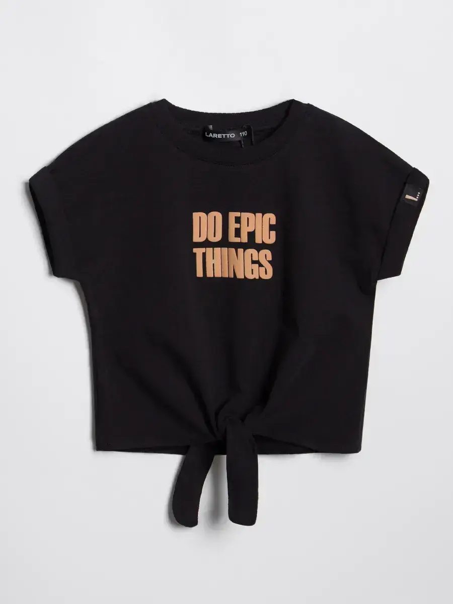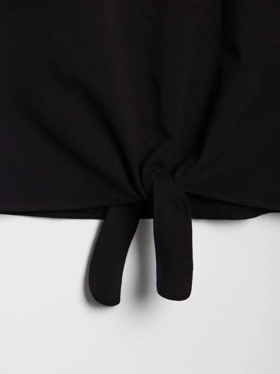 Черная футболка с завязками и леопардовые велосипедки станут самым практичным повседневным вариантом.