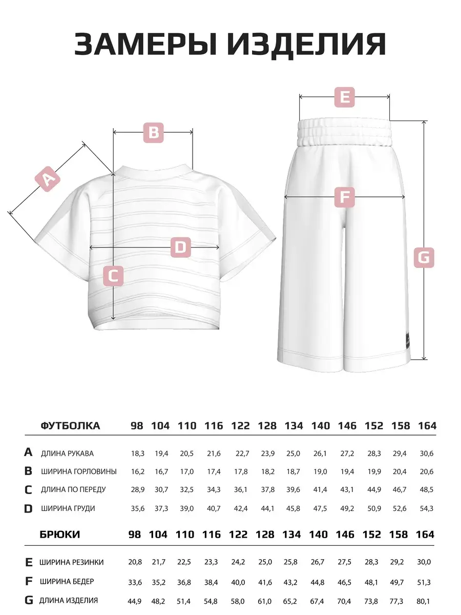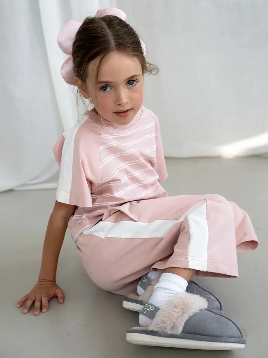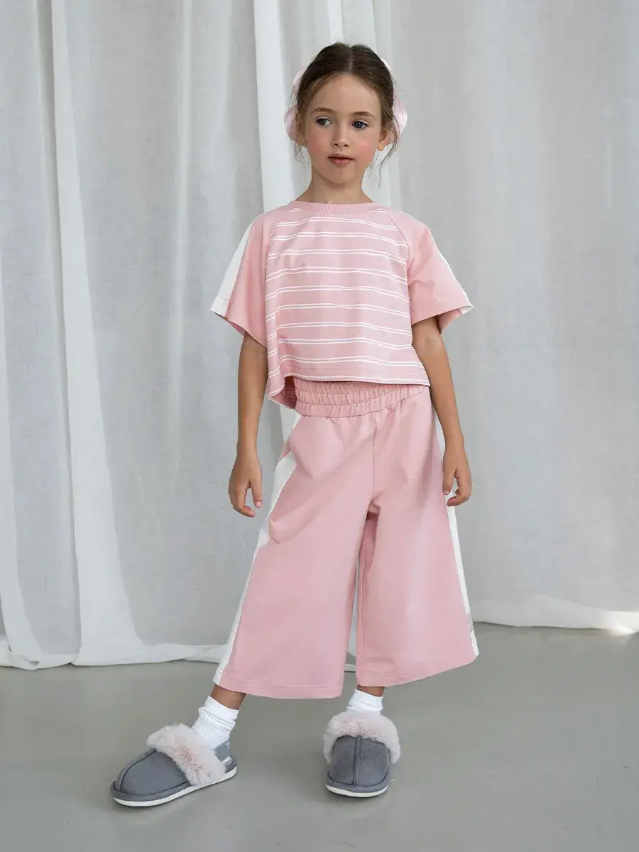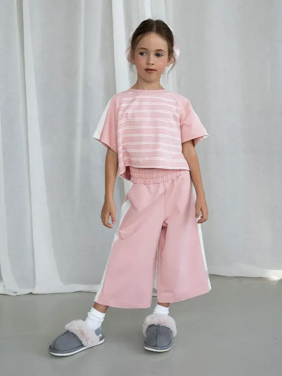 Пудровый костюм штаны и футболка для девочки - это стильный и комфортный комплект, который станет отличным выбором на каждый день. Укороченная футболка оверсайз и брюки кюлоты станут практичным вариантом для дома, отдыха, повседневной носки в садик и занятий спортом. Детская одежда с модным принтом выполнена из качественного хлопкового материала, который обеспечивает удобство, не стесняет движений и позволяет коже дышать.