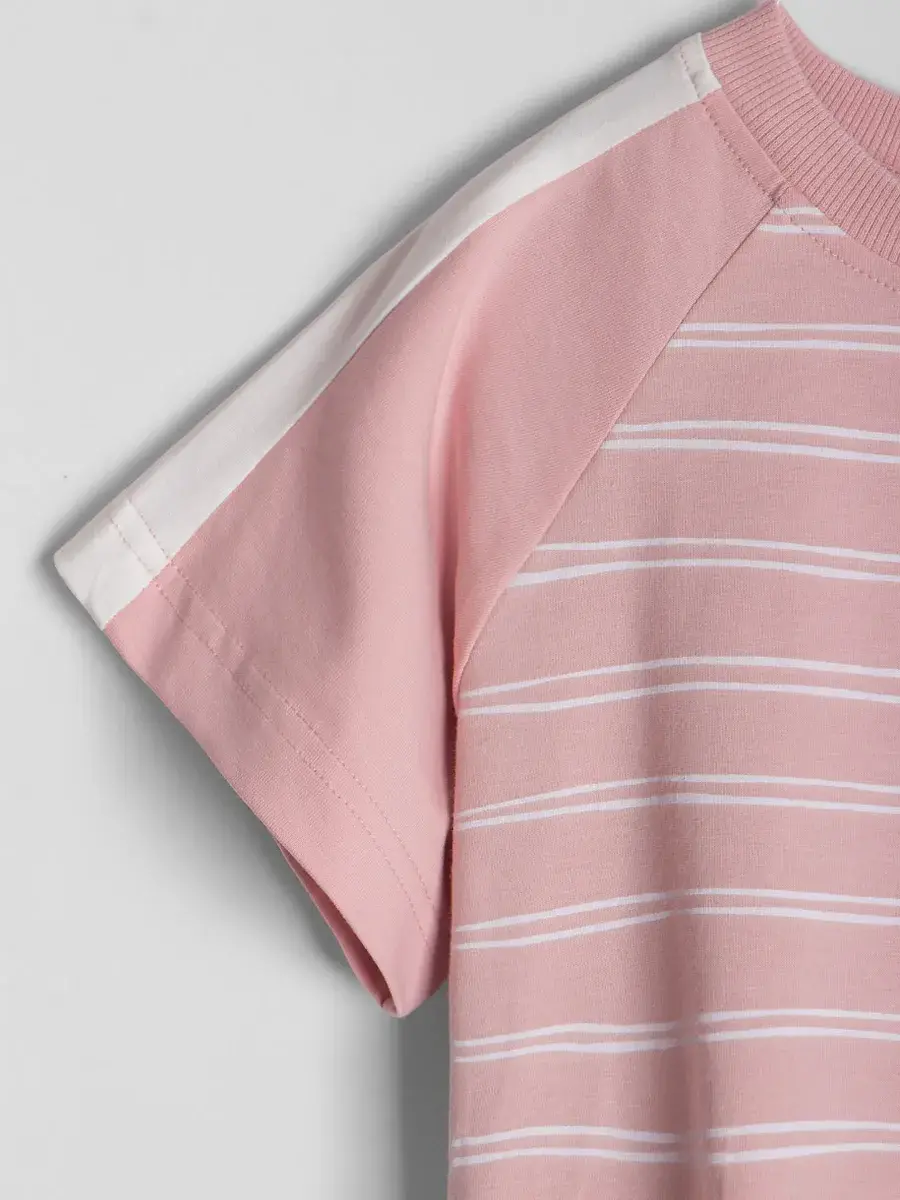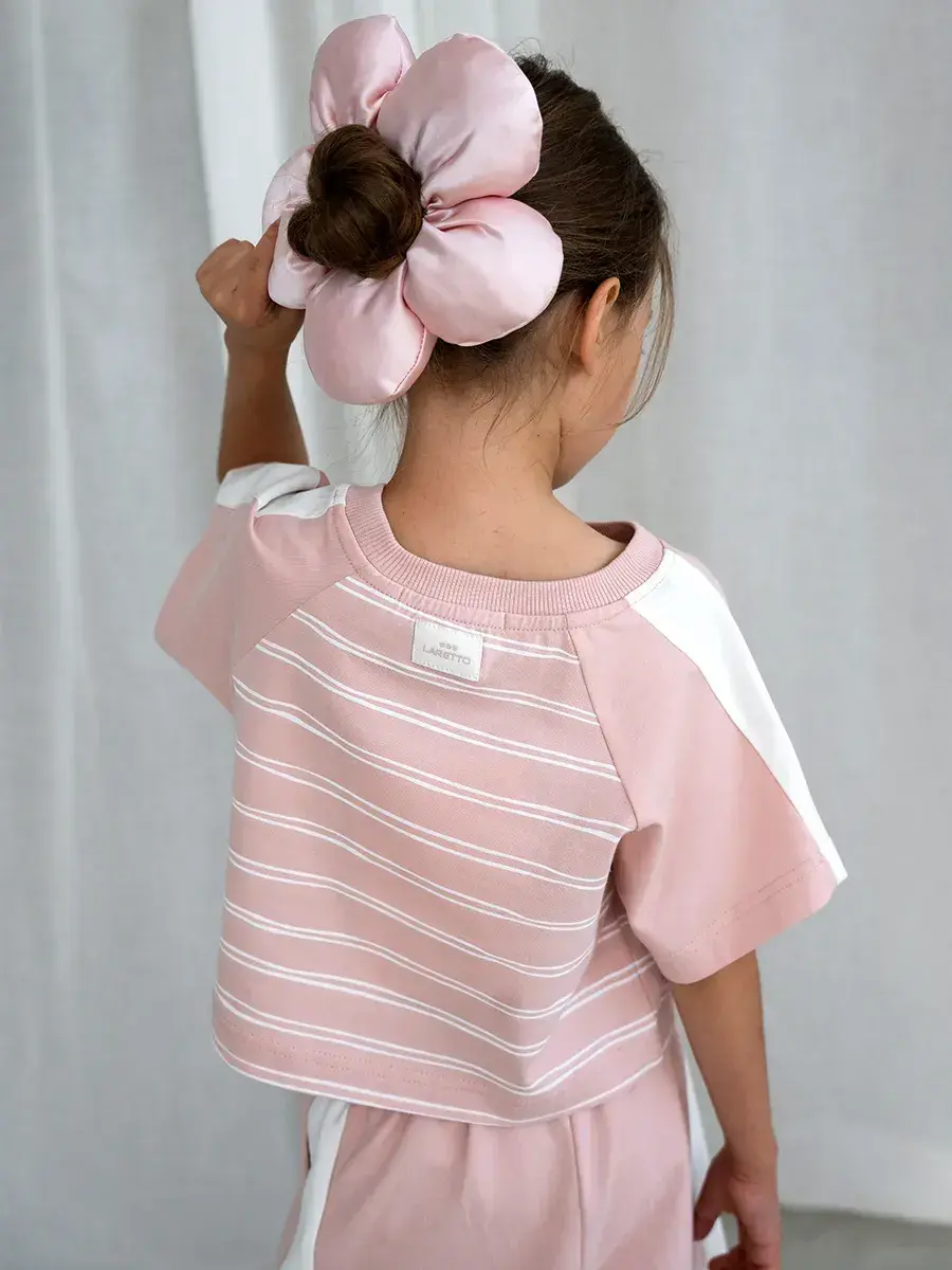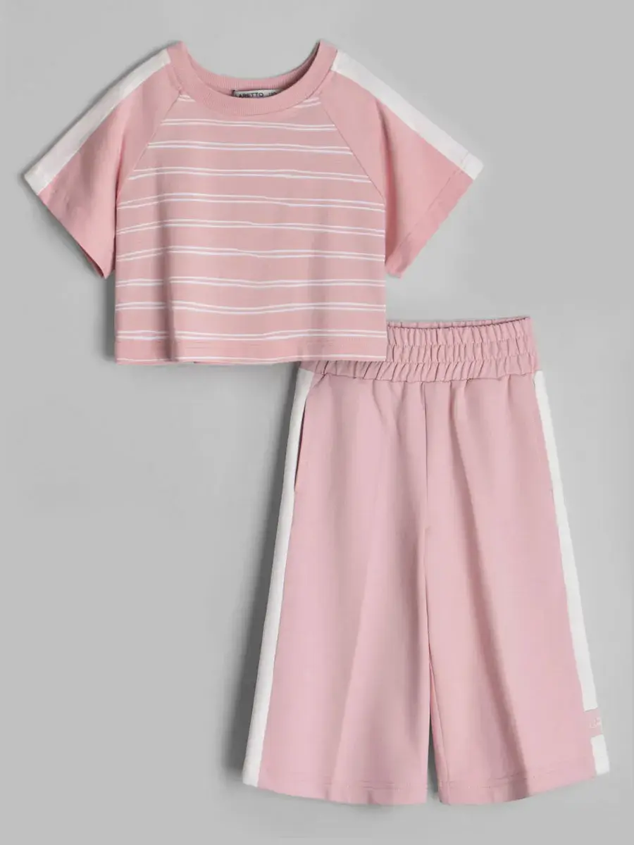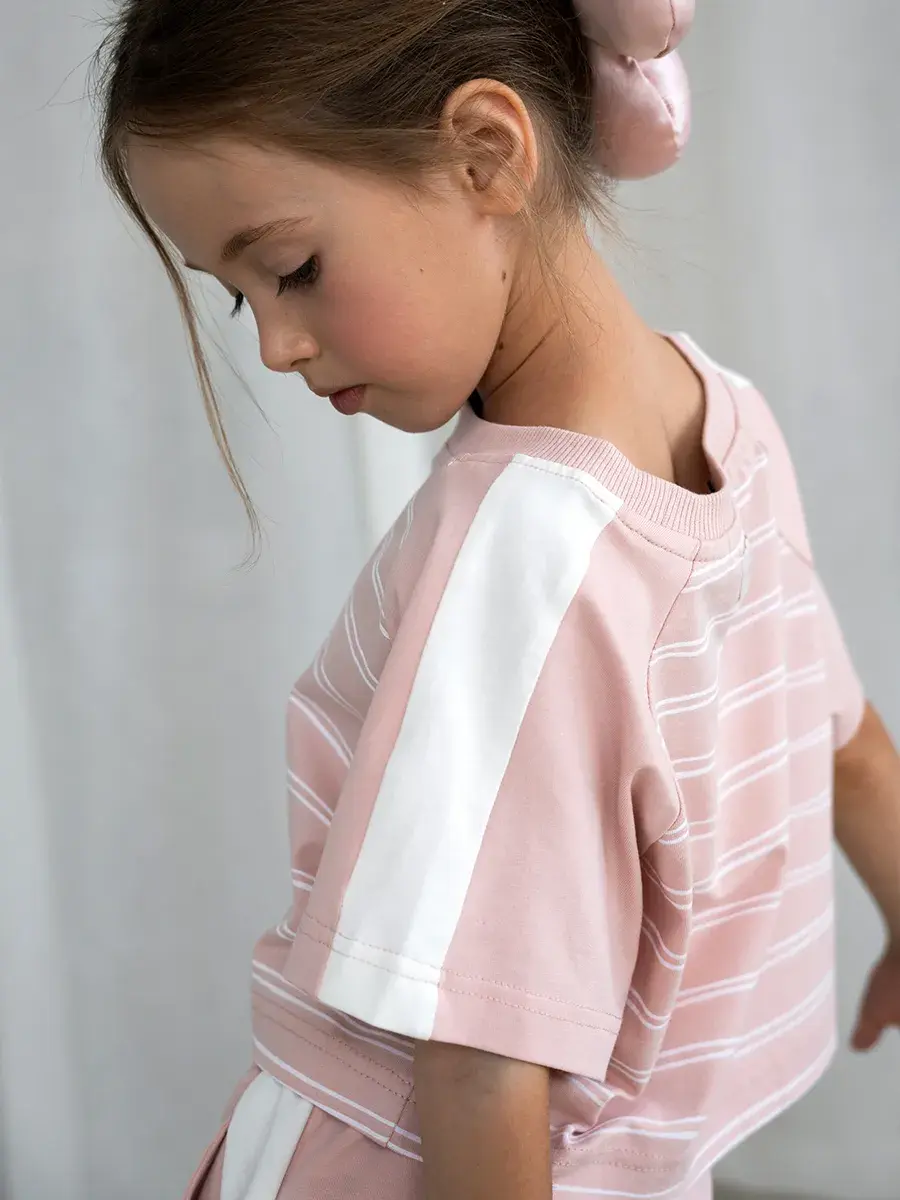 Пудровый костюм штаны и футболка для девочки - это стильный и комфортный комплект, который станет отличным выбором на каждый день. Укороченная футболка оверсайз и брюки кюлоты станут практичным вариантом для дома, отдыха, повседневной носки в садик и занятий спортом. Детская одежда с модным принтом выполнена из качественного хлопкового материала, который обеспечивает удобство, не стесняет движений и позволяет коже дышать.