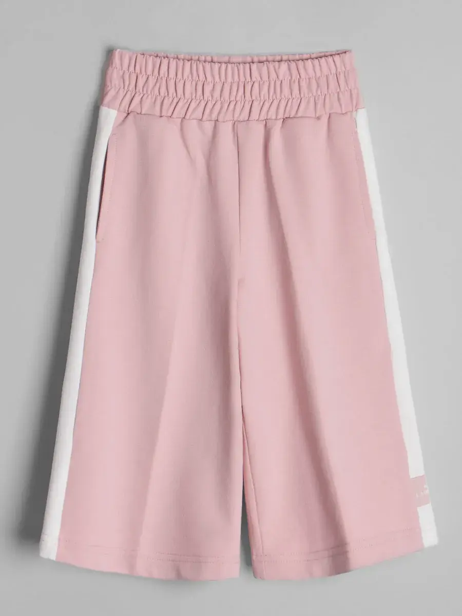 Верх представлен топом с коротким рукавом, что делает его удобным для носки в теплую погоду. Штаны кюлоты для девочки хорошо держат форму, подчеркивают фигуру и придают образу игривость.