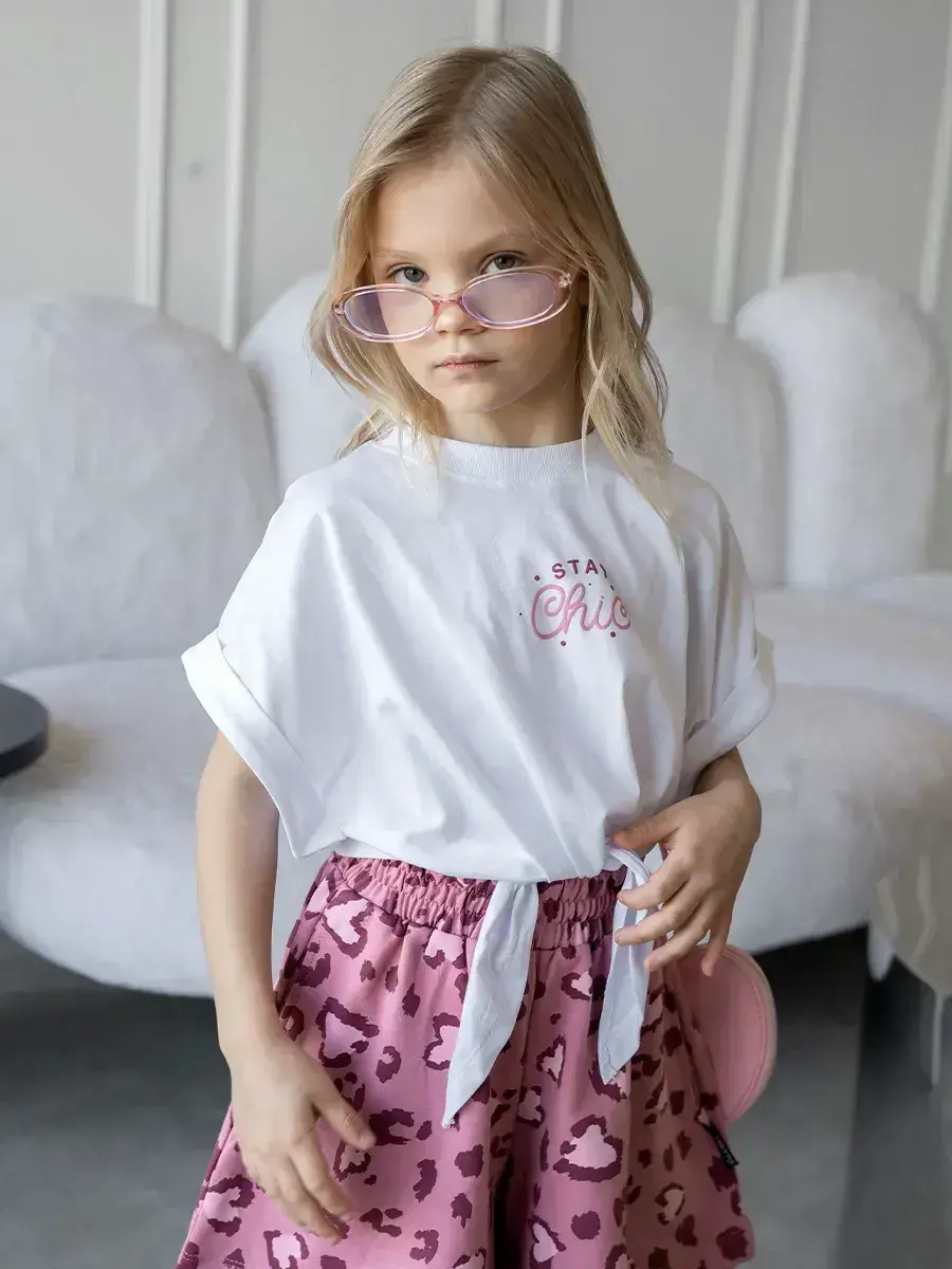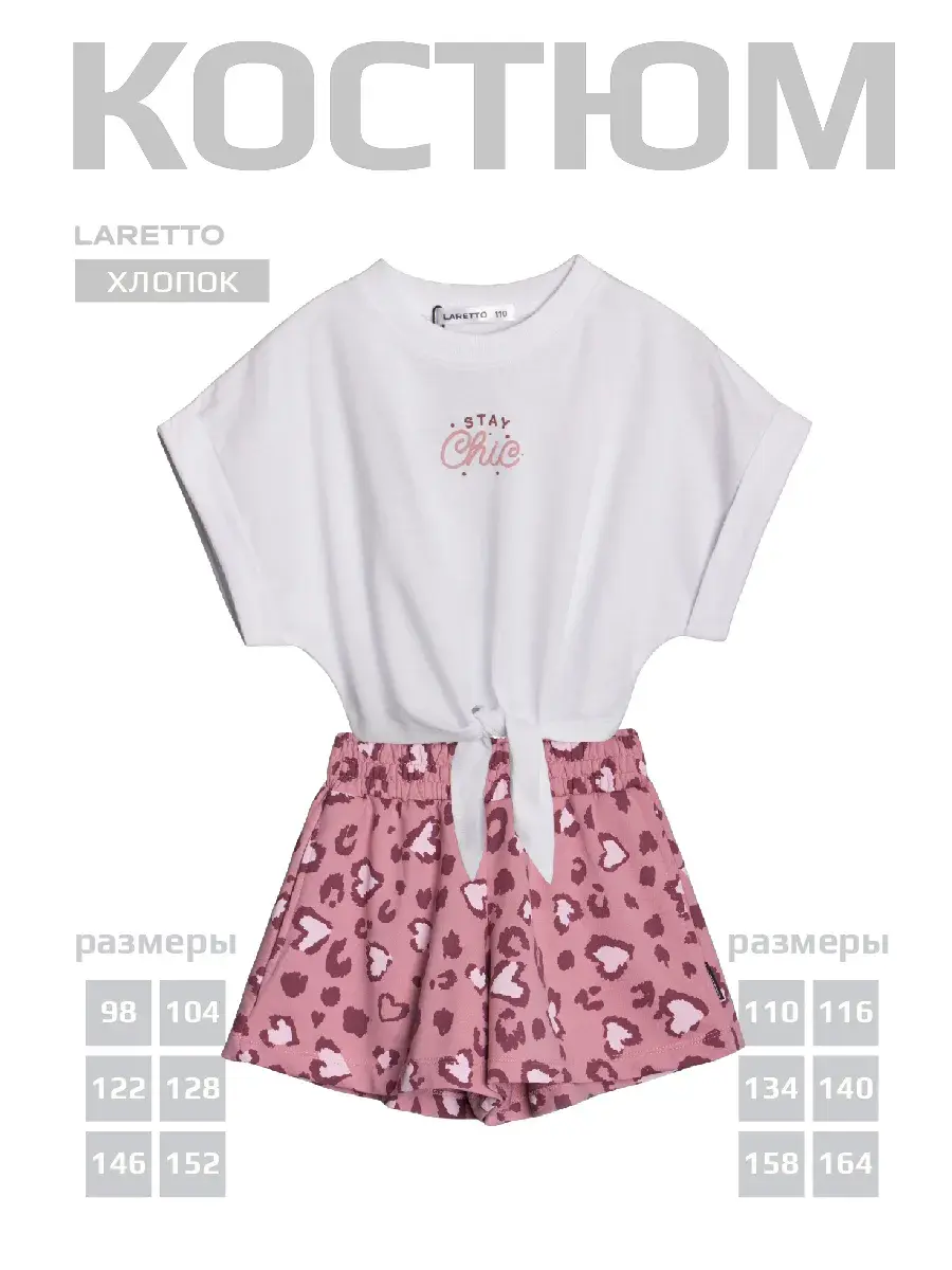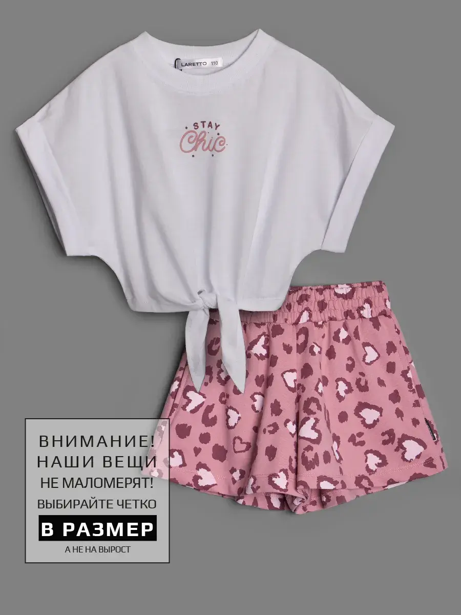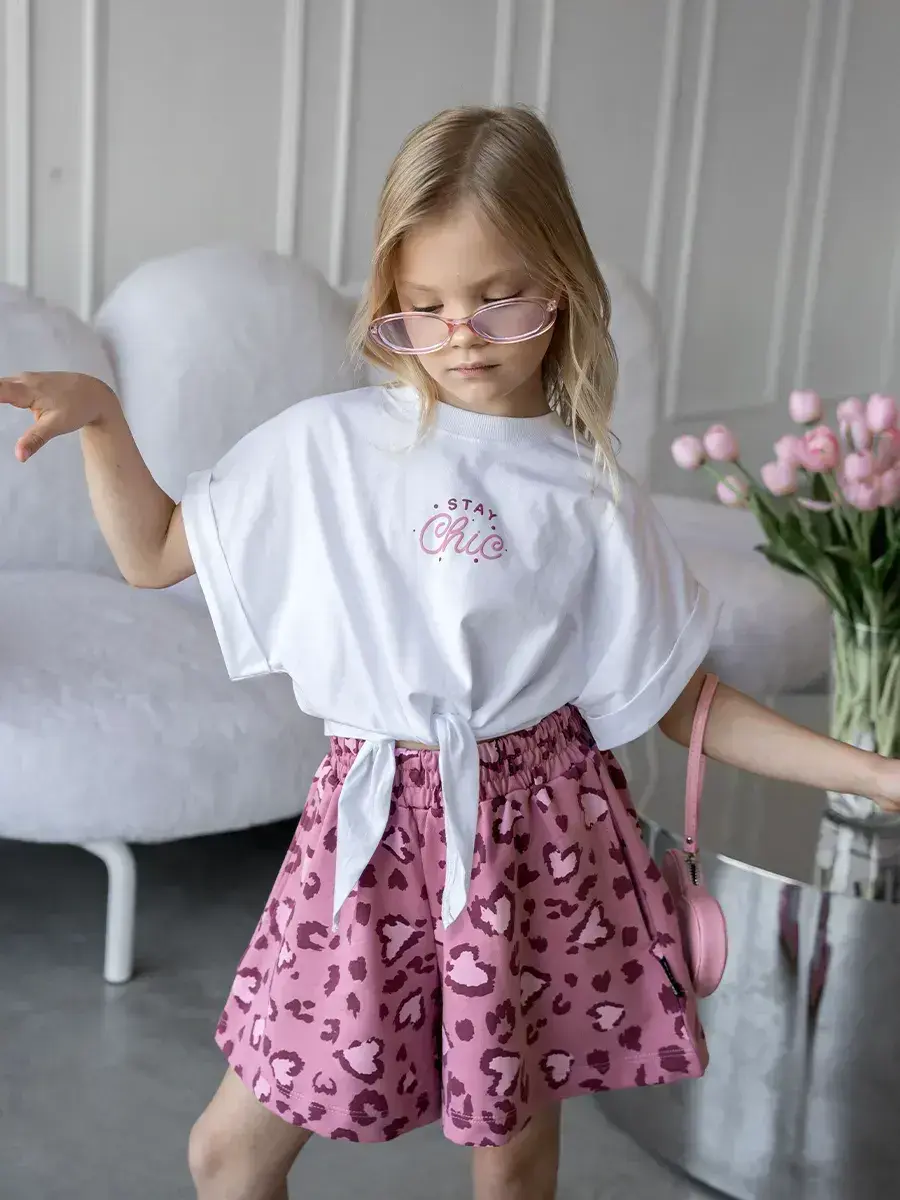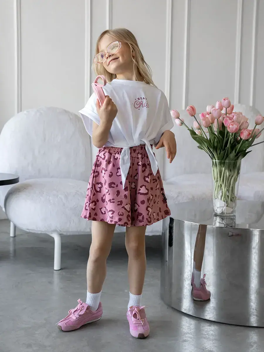 Костюм для девочек включает в себя модную футболку и комфортные шорты, которые подойдут как для активного отдыха, так и для повседневной носки. Идеально подходит для маленьких модниц и юных спортсменок.