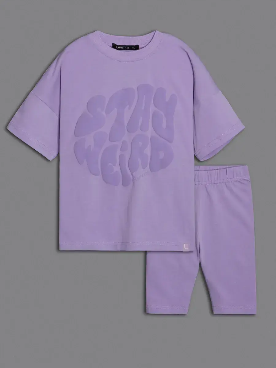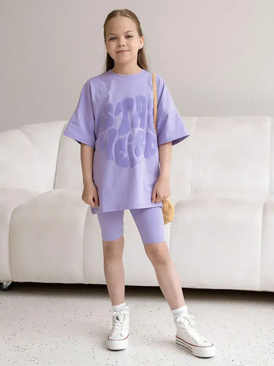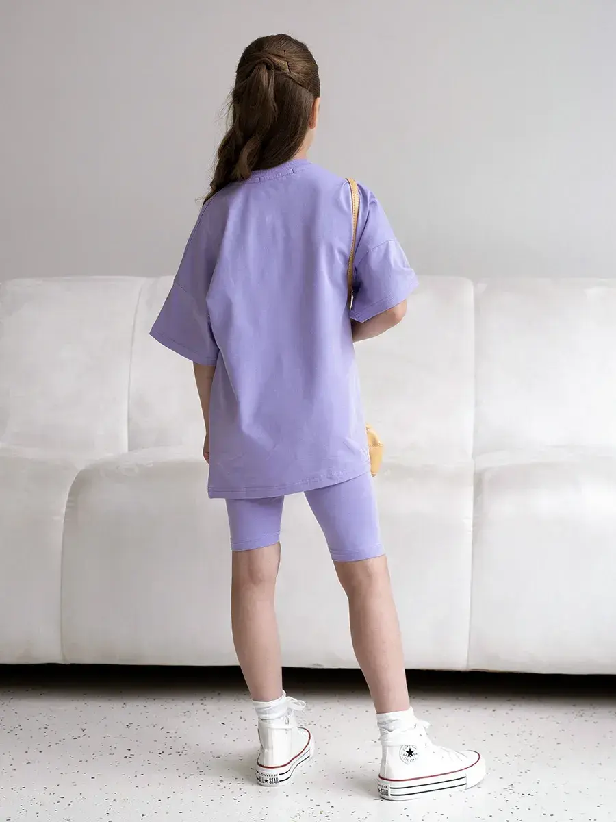 Костюм для девочки включает в себя стильную футболку и велосипедки. Детский костюм для девочки на лето идеально подойдет для летних прогулок или как домашний костюм для девочки подростка.