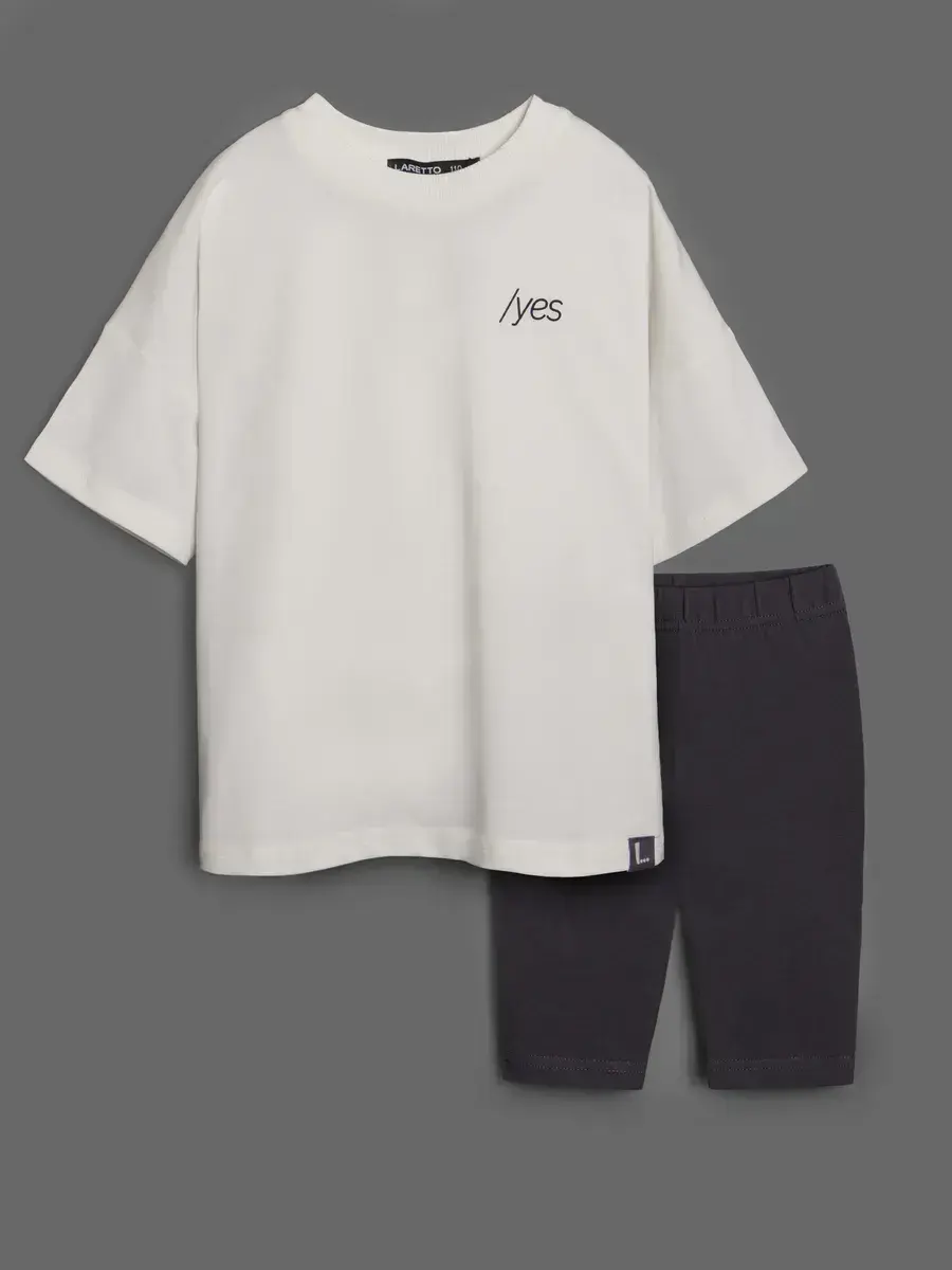 Детский костюм для девочки на лето включает в себя стильную футболку и велосипедки. Он идеально подойдет для летних прогулок или как домашний костюм для девочки подростка.