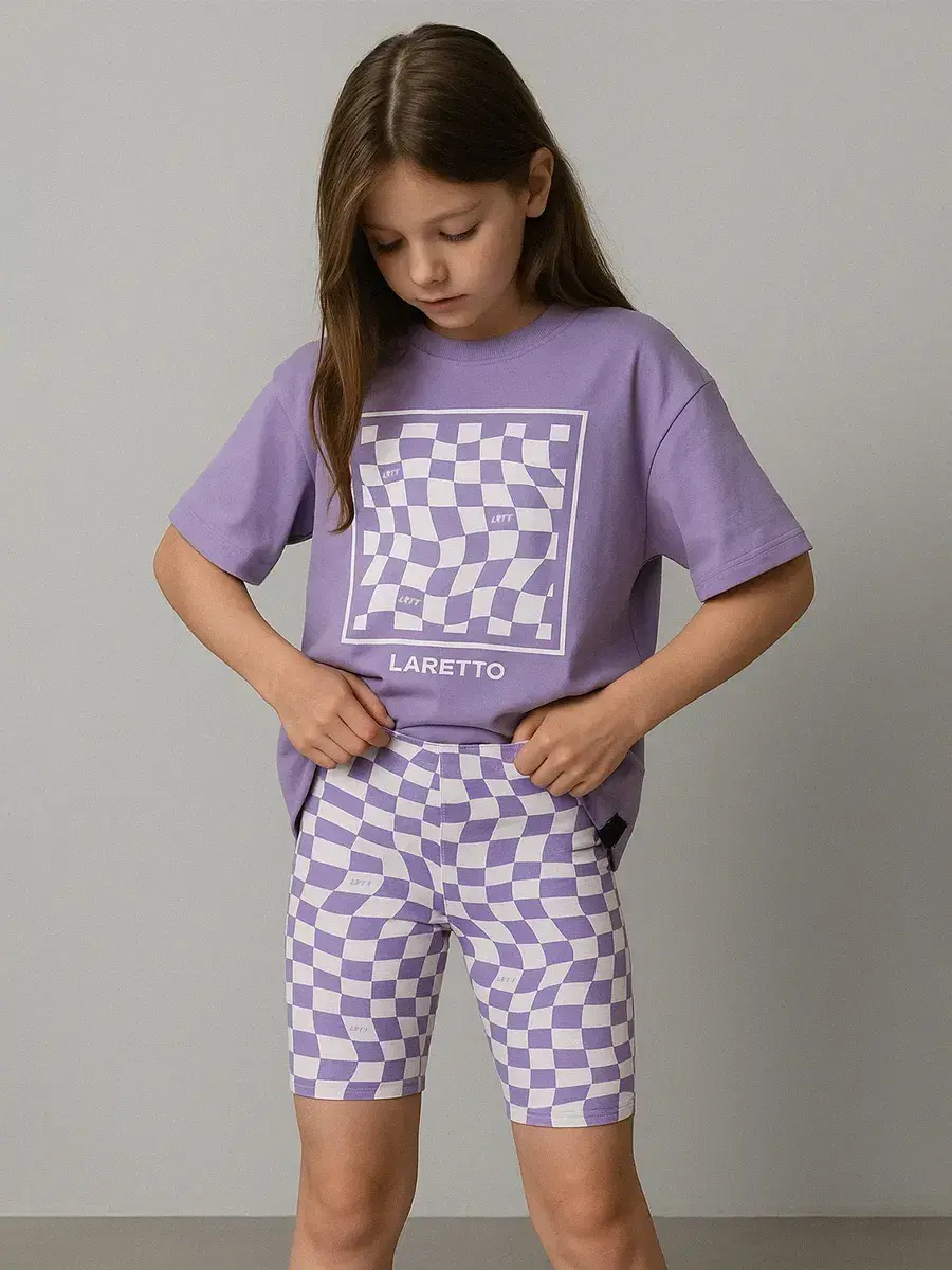 Детский костюм для девочки на лето включает в себя стильную футболку и велосипедки. Он идеально подойдет для летних прогулок или как домашний костюм для девочки подростка.