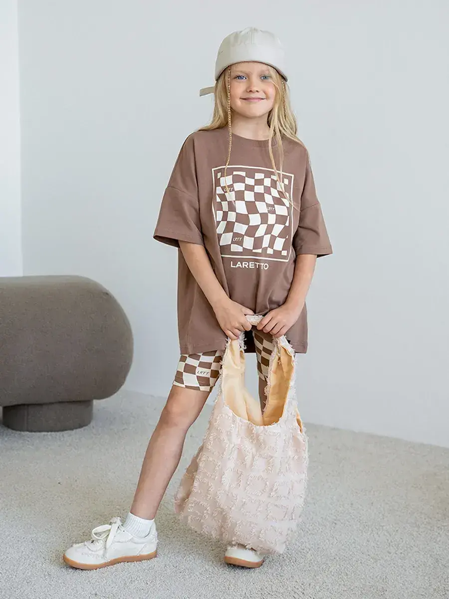 Детский костюм для девочки на лето включает в себя стильную футболку и велосипедки. Он идеально подойдет для летних прогулок или как домашний костюм для девочки подростка.