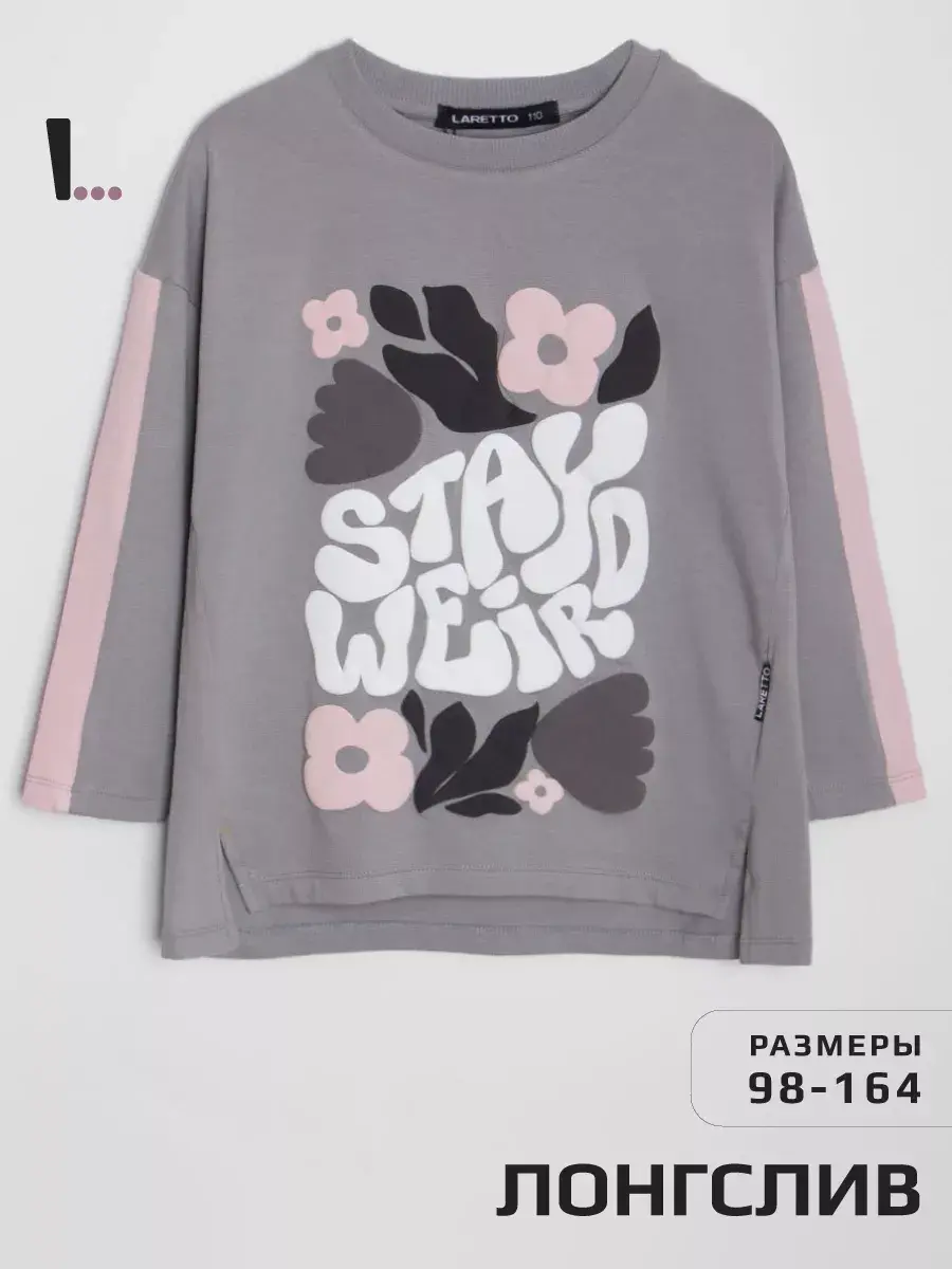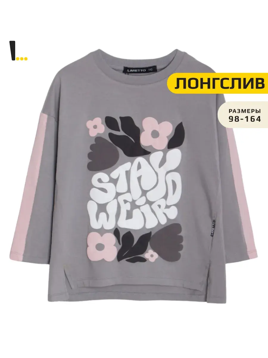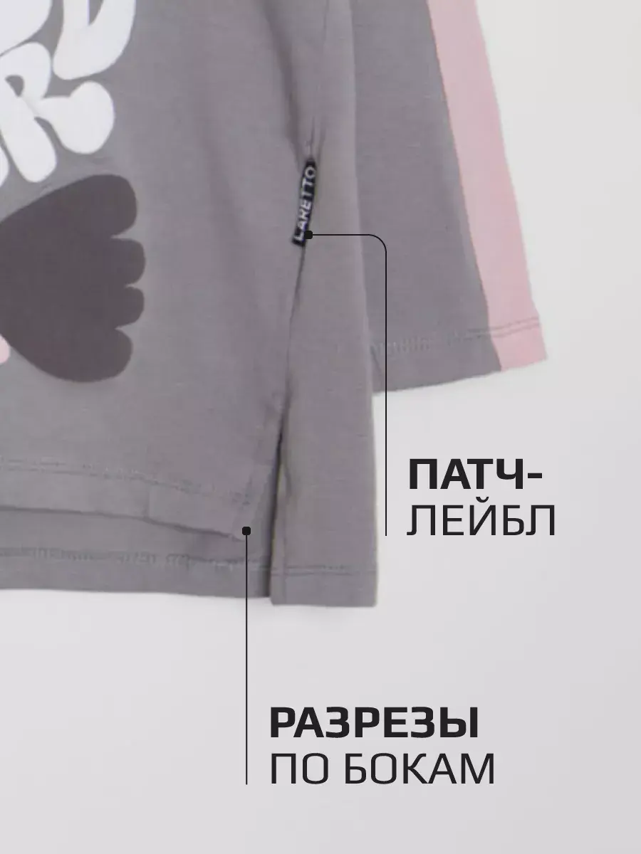 Яркий красочный принт на груди добавляет образу весёлое настроение и индивидуальность, подчеркивая вкус и стиль юной модницы. Благодаря универсальному дизайну, лонгслив легко сочетается с джинсами, лосинами, юбками, спортивными штанами и другой детской одеждой.
