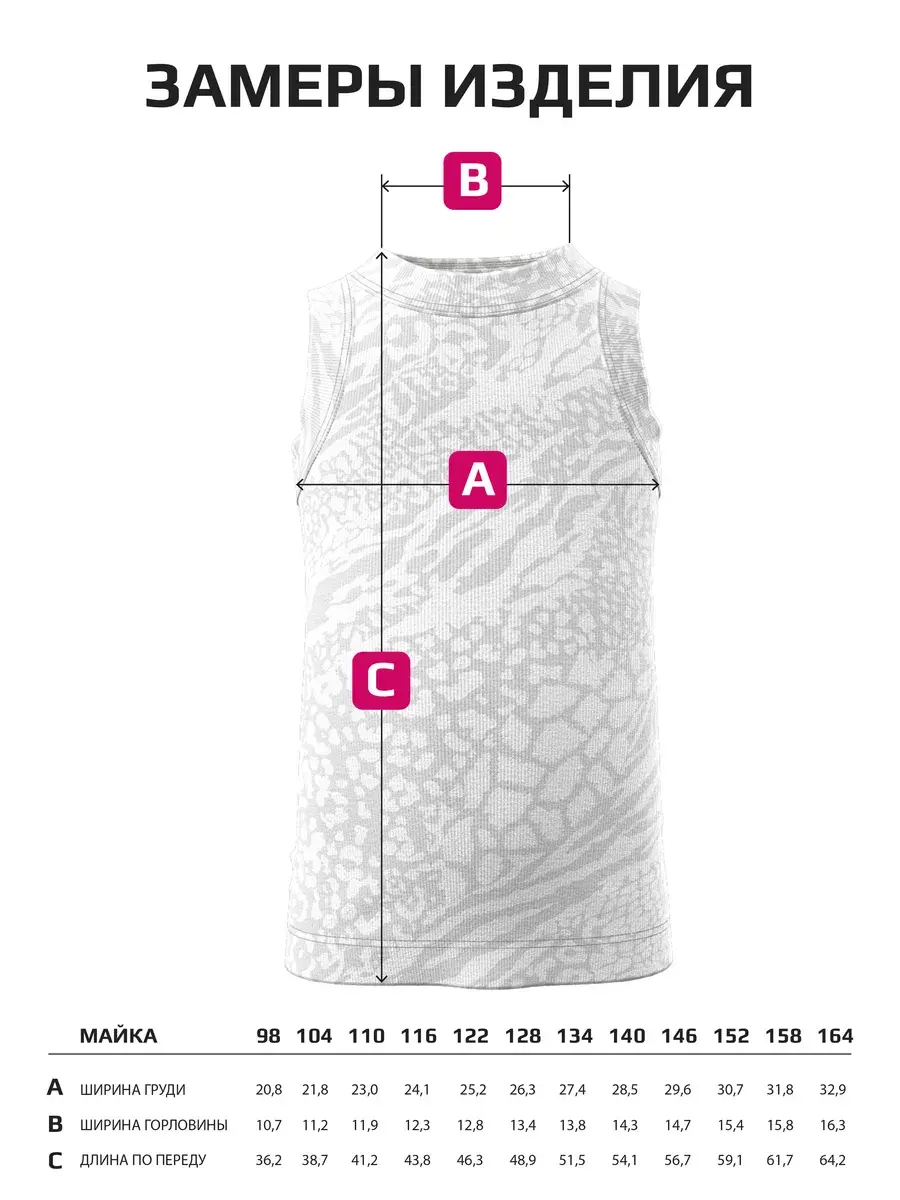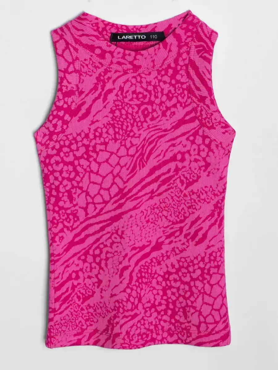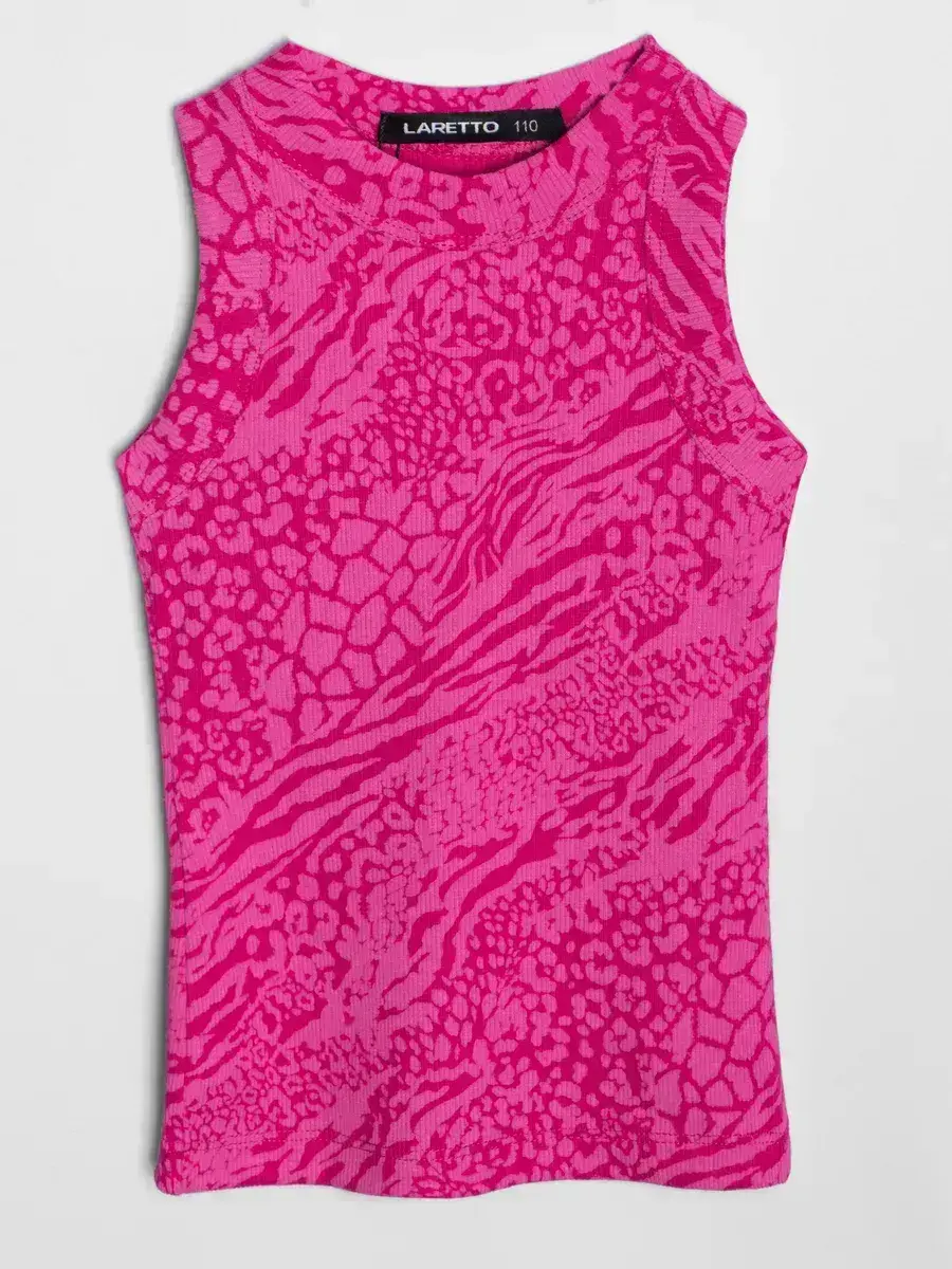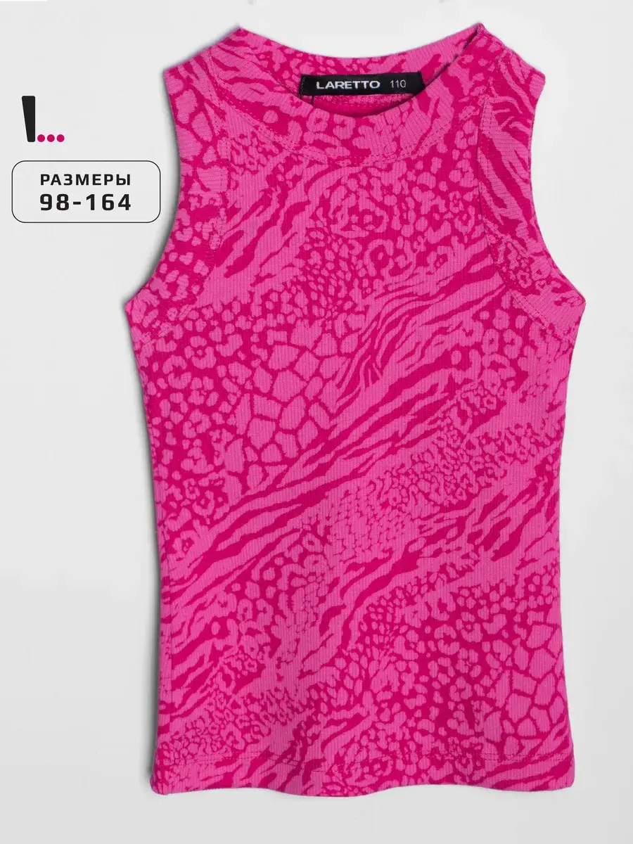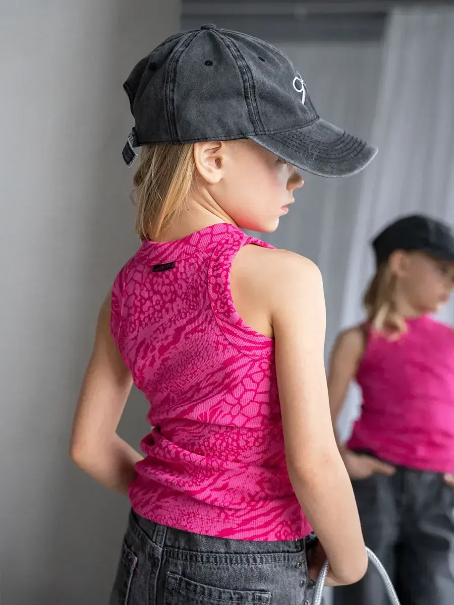 Главная особенность модели – насыщенный розовый узор с анималистическими мотивами, который делает майку стильной и выразительной. Такой дерзкий и современный дизайн подойдёт как для юных модниц, так и для подростков, позволяя подчеркнуть индивидуальность и создать смелый образ.