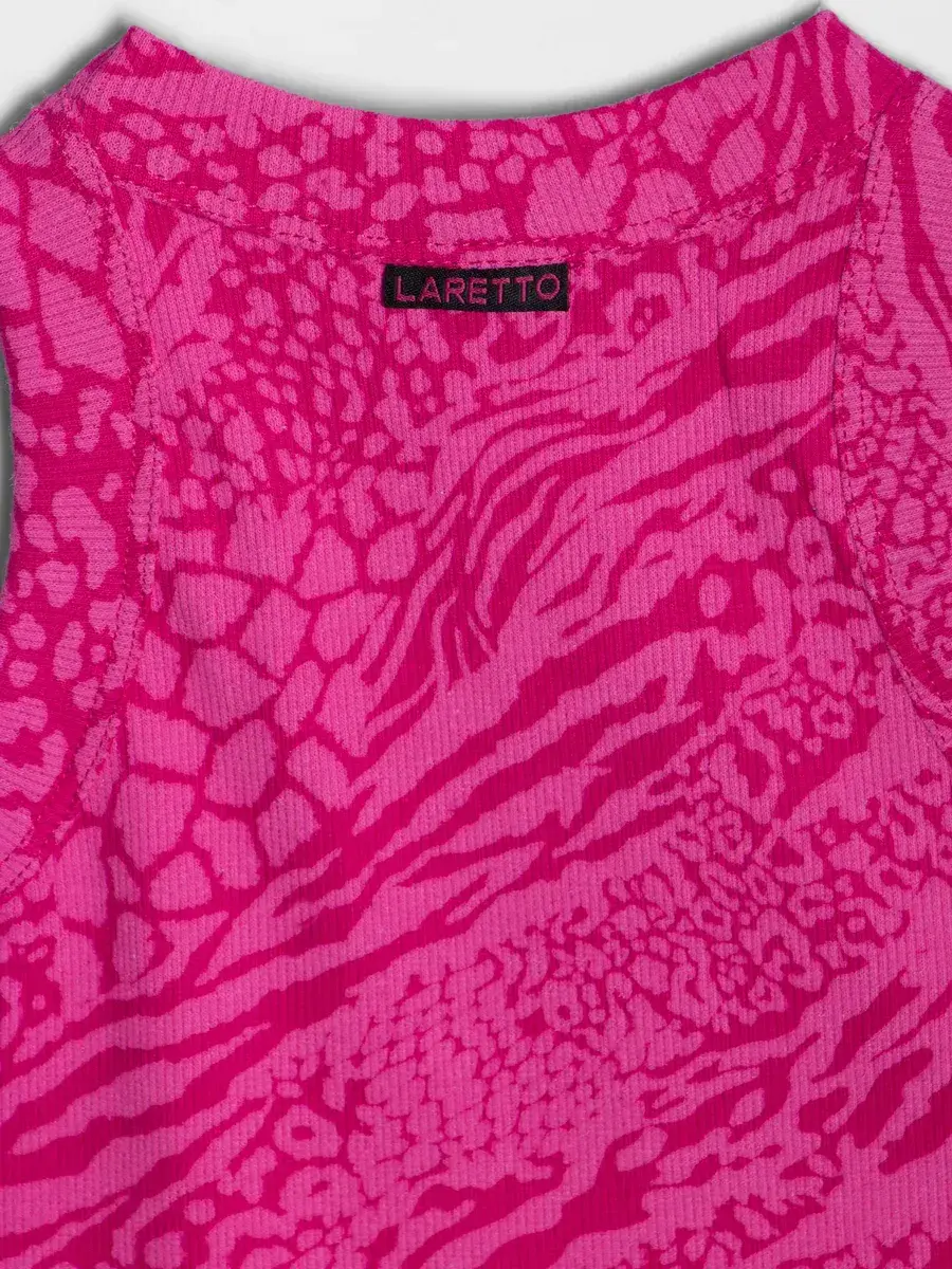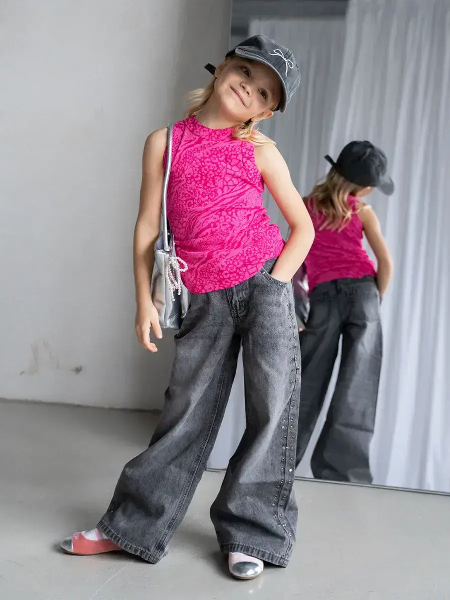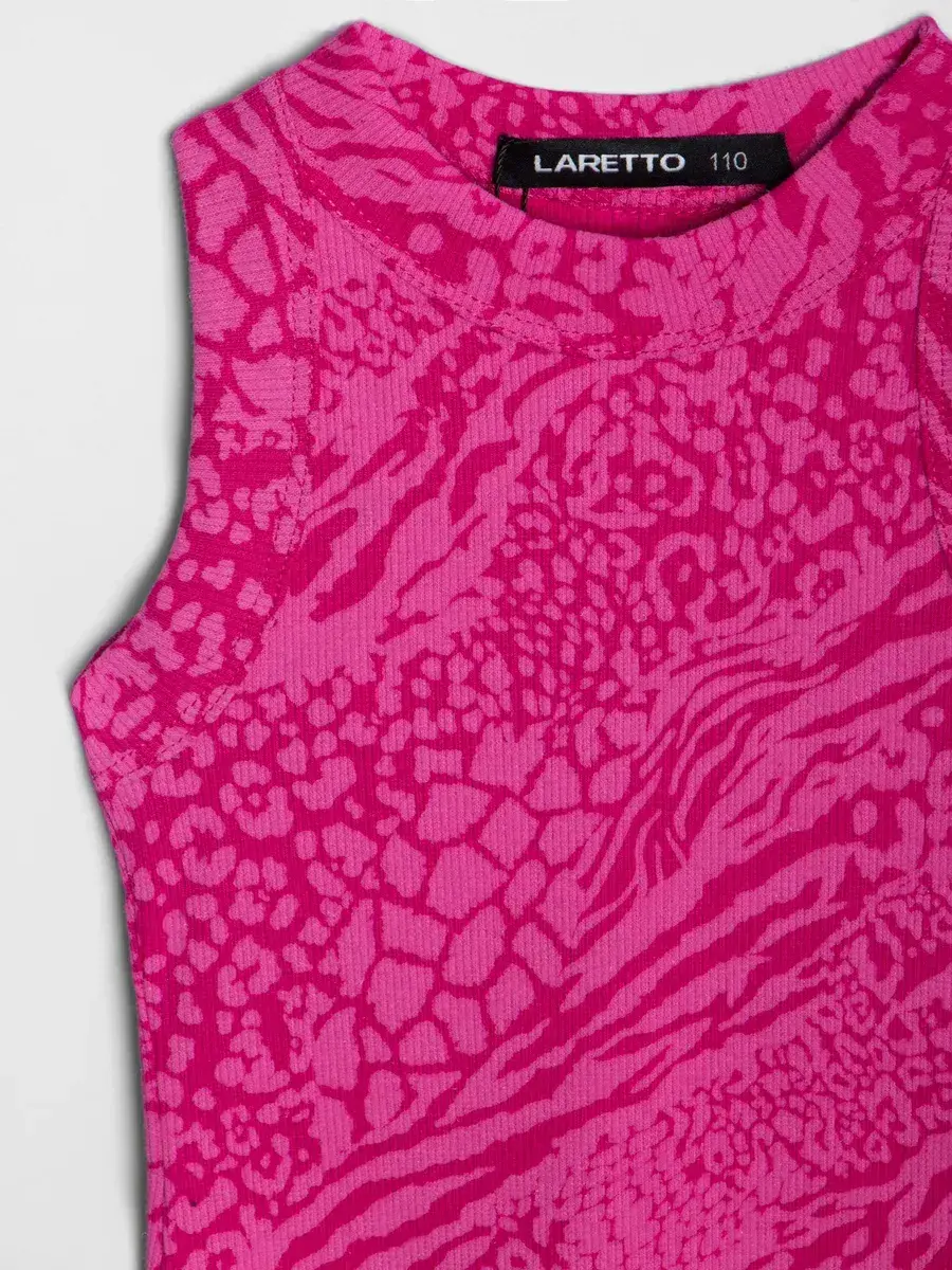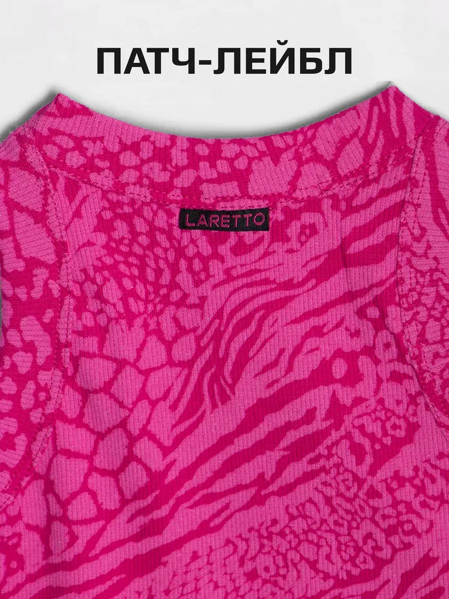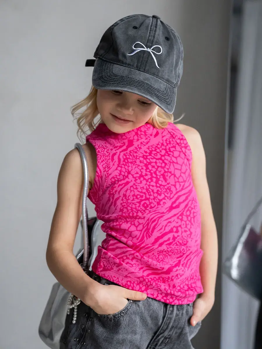 Главная особенность модели – насыщенный розовый узор с анималистическими мотивами, который делает майку стильной и выразительной. Такой дерзкий и современный дизайн подойдёт как для юных модниц, так и для подростков, позволяя подчеркнуть индивидуальность и создать смелый образ.