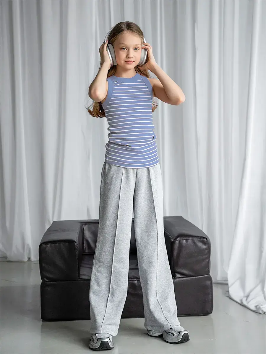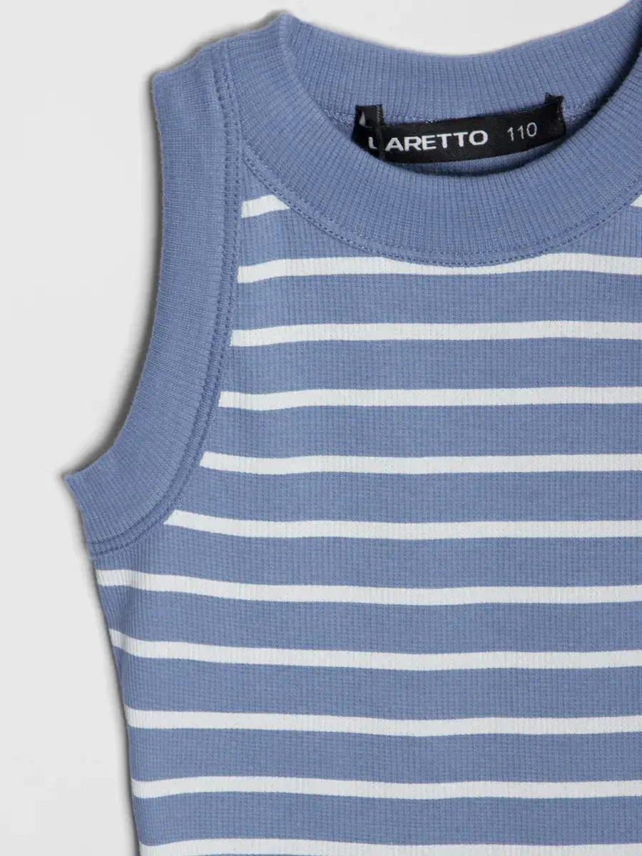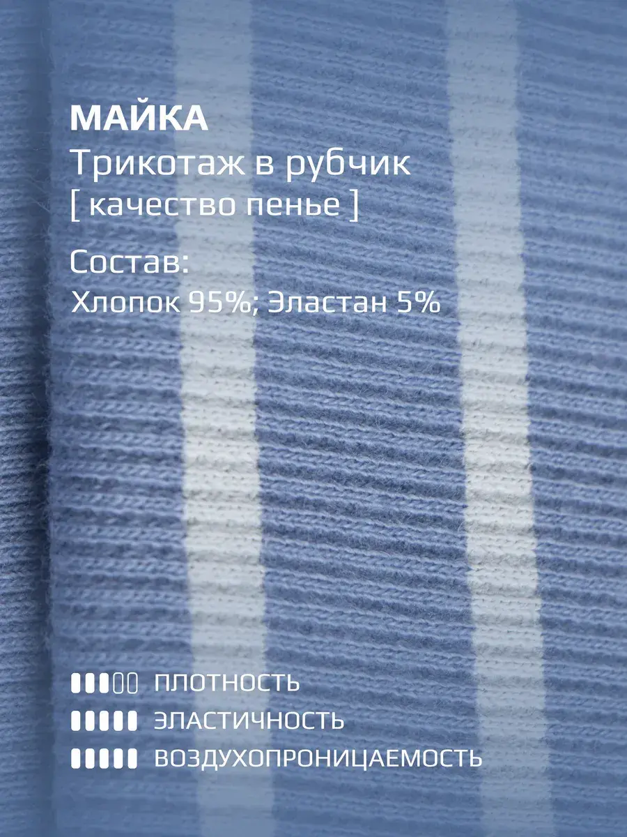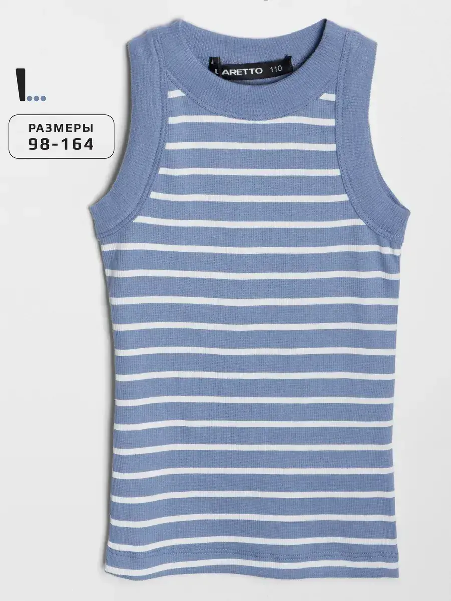 Стильный топ для девочки - идеальный выбор для теплых дней и создания модных повседневных образов. Голубой цвет с тонкими белыми полосками придает майке элегантный вид, подходящий для прогулок, занятий спортом и ношения в детском саду или школе. Удобный крой и мягкая ткань обеспечивают максимальный комфорт даже при активных движениях.