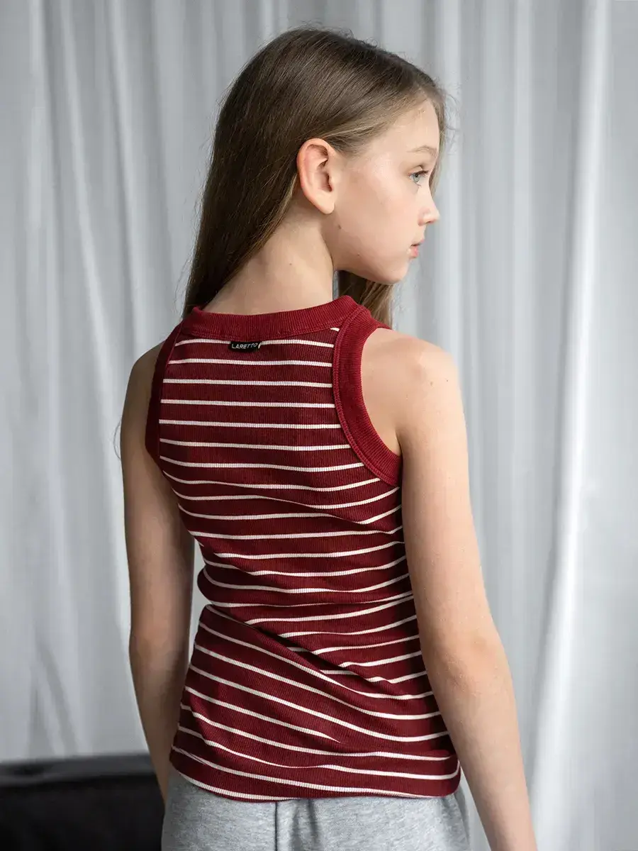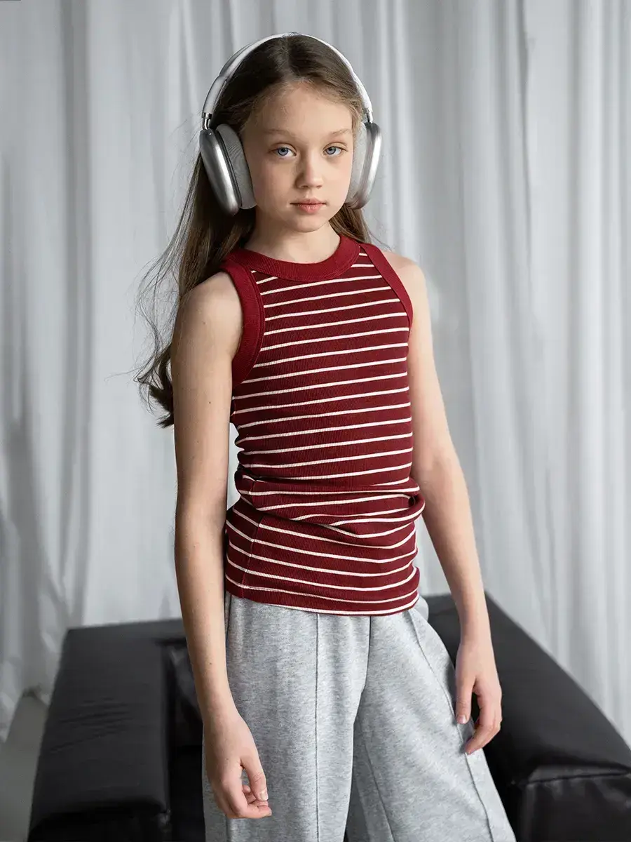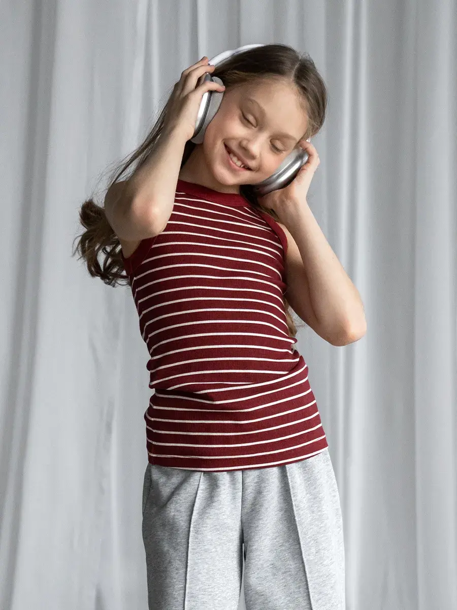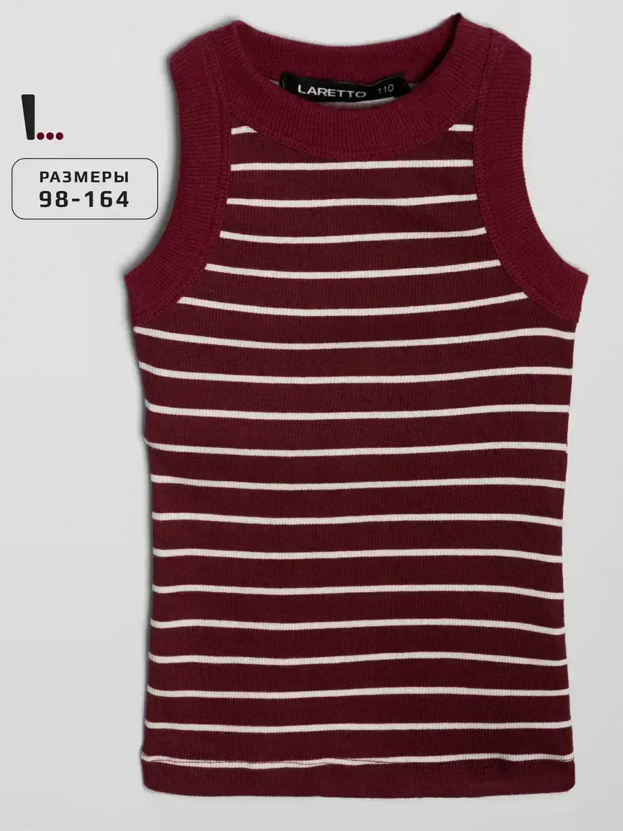 Стильный топ для девочки подростка - идеальный выбор для теплых дней и создания модных повседневных образов. Бордовый цвет с тонкими белыми полосками придает майке элегантный вид, подходящий для прогулок, занятий спортом и ношения в детском саду или школе. Удобный крой и мягкая ткань обеспечивают максимальный комфорт даже при активных движениях.