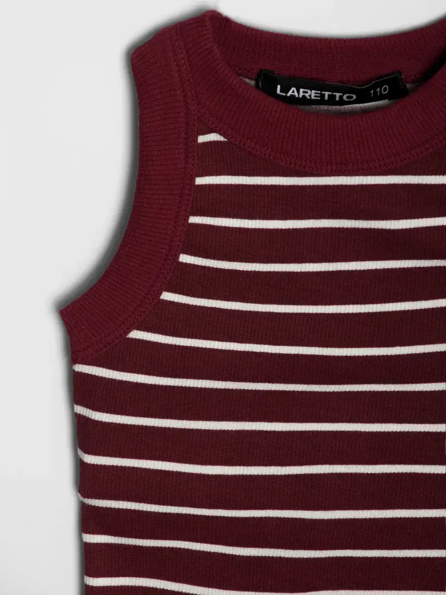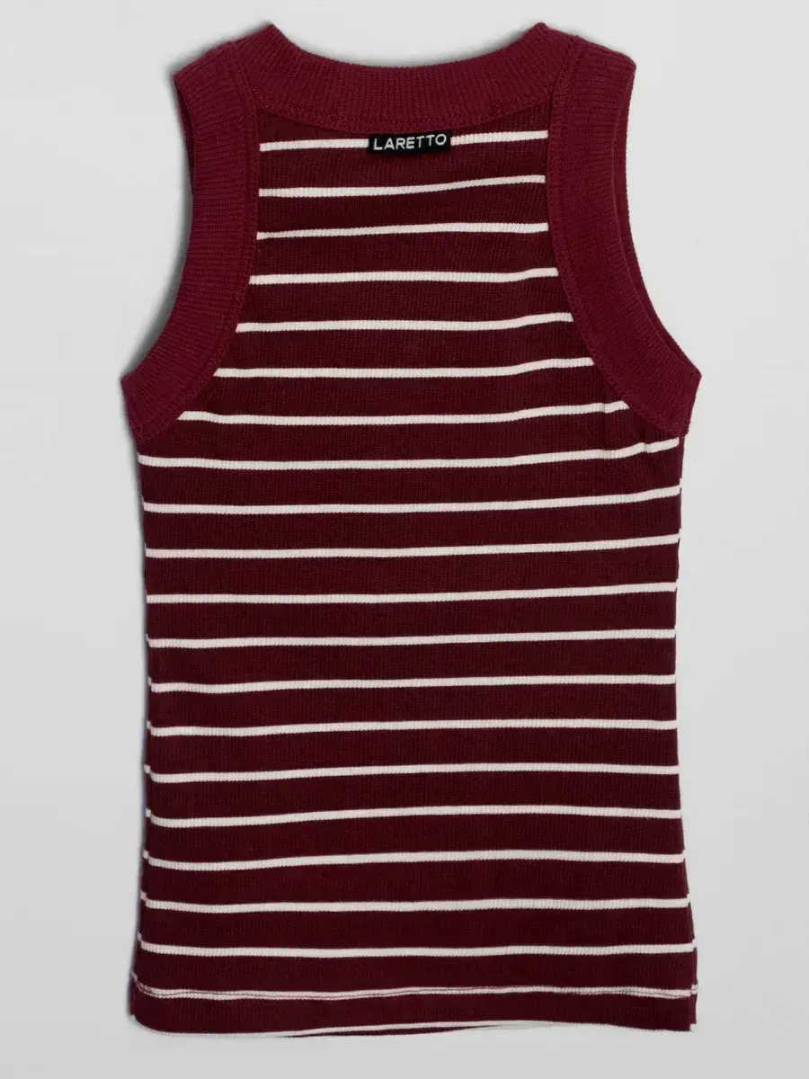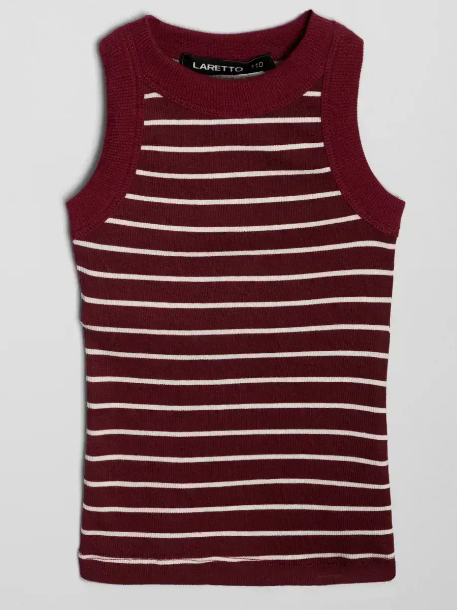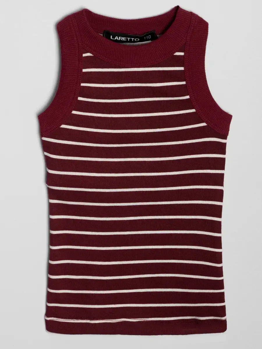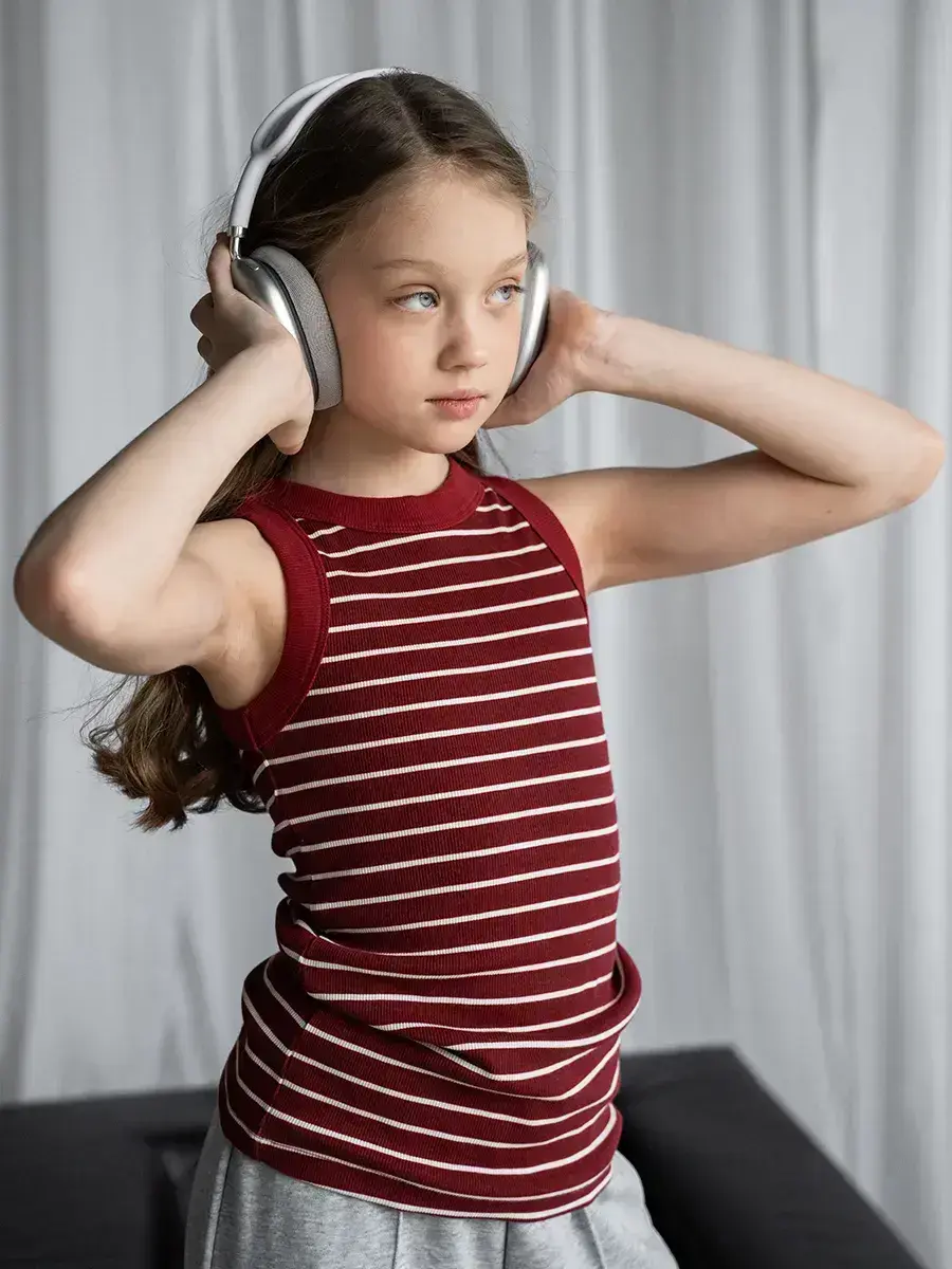 Стильный топ для девочки подростка - идеальный выбор для теплых дней и создания модных повседневных образов. Бордовый цвет с тонкими белыми полосками придает майке элегантный вид, подходящий для прогулок, занятий спортом и ношения в детском саду или школе. Удобный крой и мягкая ткань обеспечивают максимальный комфорт даже при активных движениях.