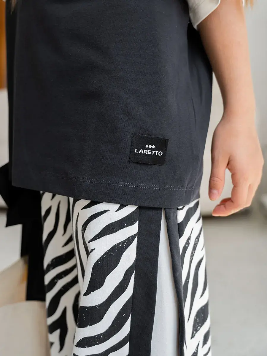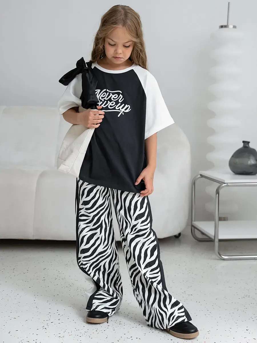Осенний костюм для девочки футболка и брюки с принтом. Этот костюм для девочки сшит из мягкого и приятного к телу хлопка с добавлением лайкры, что обеспечивает свободу движений и комфорт в течение всего дня. Округлый вырез горловины и прямой покрой делают его универсальным для различных случаев, а отсутствие застежек гарантирует удобство при надевании и снятии. Цвет костюма детский легко сочетается с другими вещами, а стильный принт добавляет ему индивидуальности. Этот костюм для девочки станет отличным выбором для прогулок в парке, встреч с друзьями или просто для активных игр дома. Он прекрасно подойдет для повседневной носки в любое время года. LARETTO заботится о комфорте и стиле ваших детей, поэтому этот детский костюм станет любимой вещью вашей дочери.