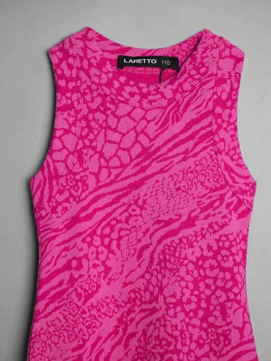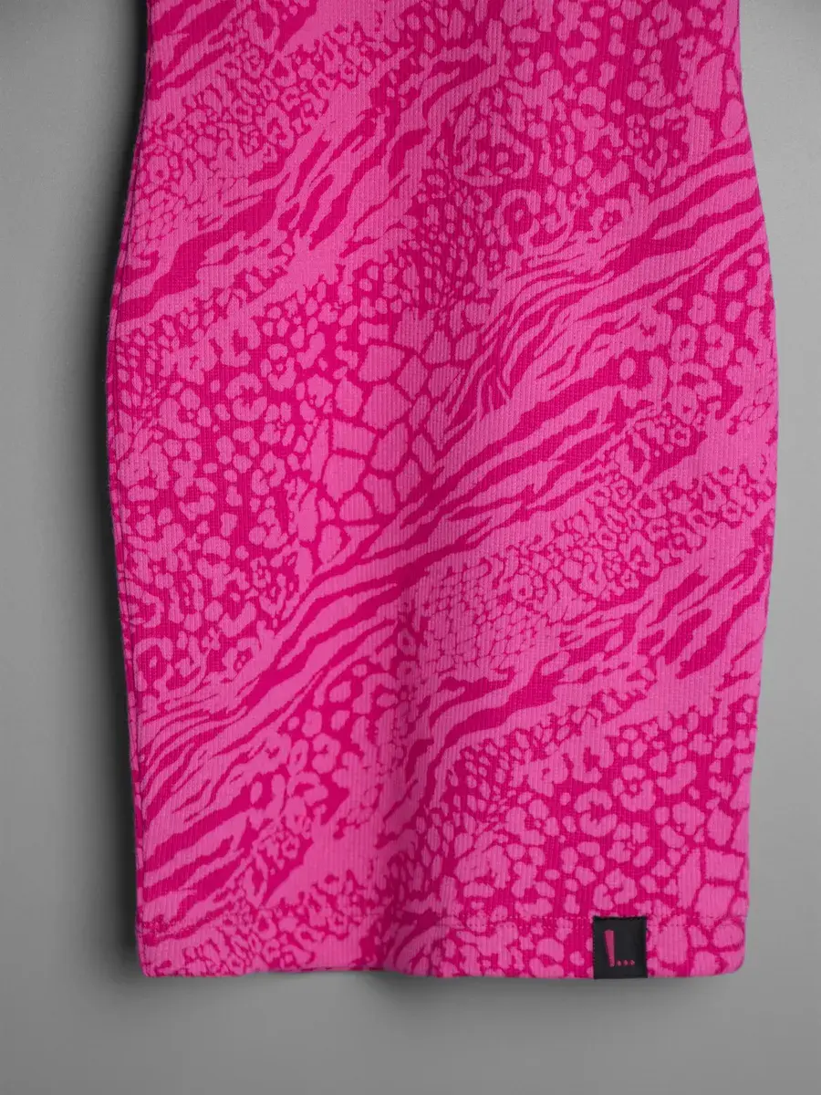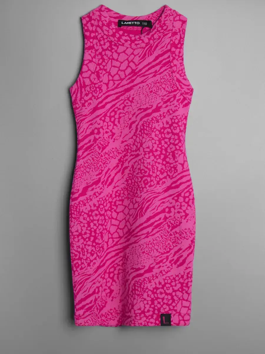 Смелый ярко-розовый узор с анималистическими мотивами придает модели современный и дерзкий вид. Это платье станет настоящим акцентом гардероба, подчеркивая индивидуальность и стиль вашей девочки. Универсальный дизайн делает его идеальным для любого времени года – оно будет гармонично сочетаться с различными аксессуарами и обувью.
