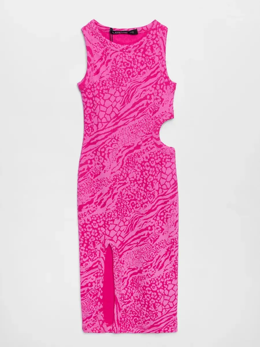 Особенность этого платья для девочки — эффектные вырезы сбоку, придают платью современный и модный вид, подчеркивающие индивидуальность вашей юной модницы.