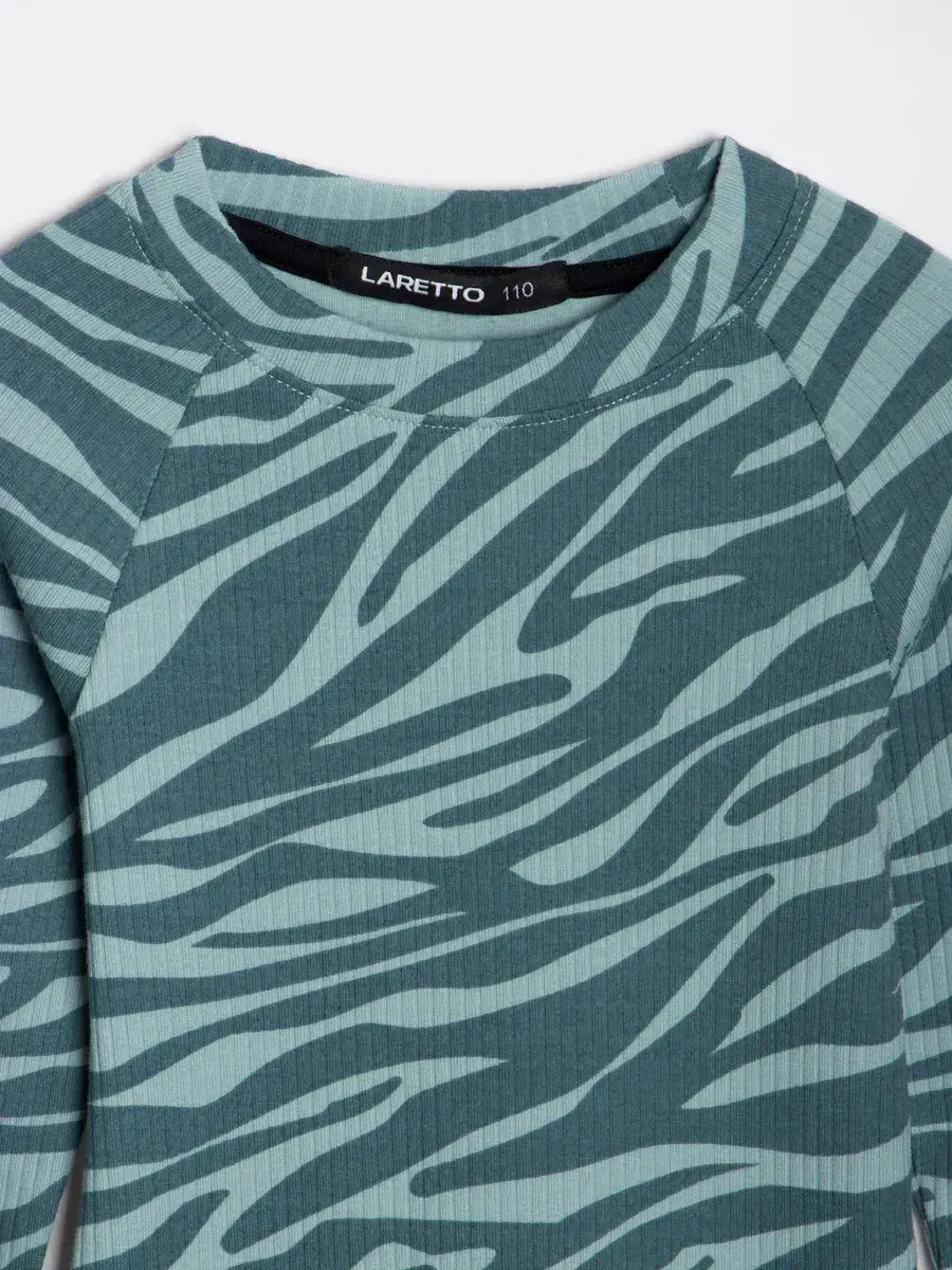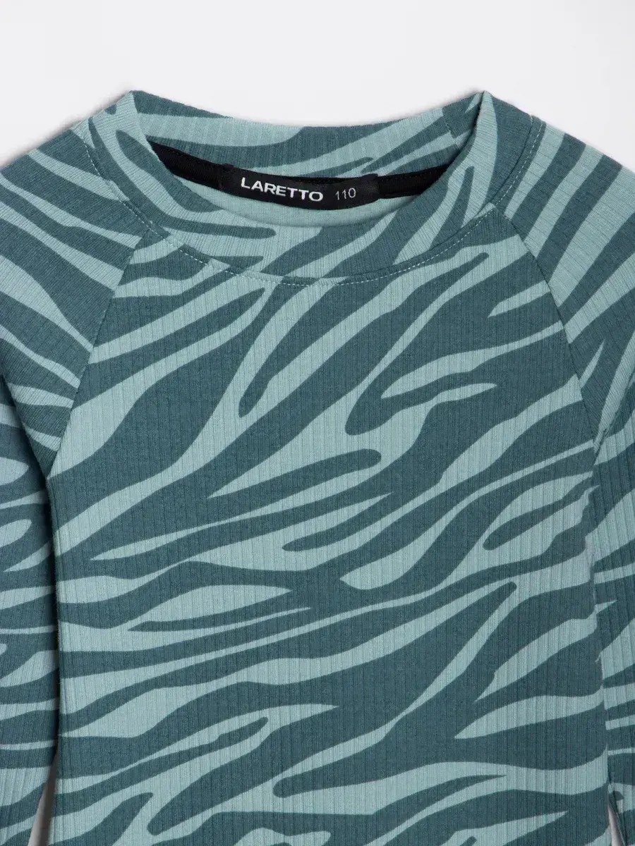 Модель платья идеально подходит для подростков, благодаря своему яркому и модному дизайну с эффектной зебровой расцветкой. Голубое платье для девочки станет не только удобным, но и стильным выбором для школы, прогулок или праздничных мероприятий.