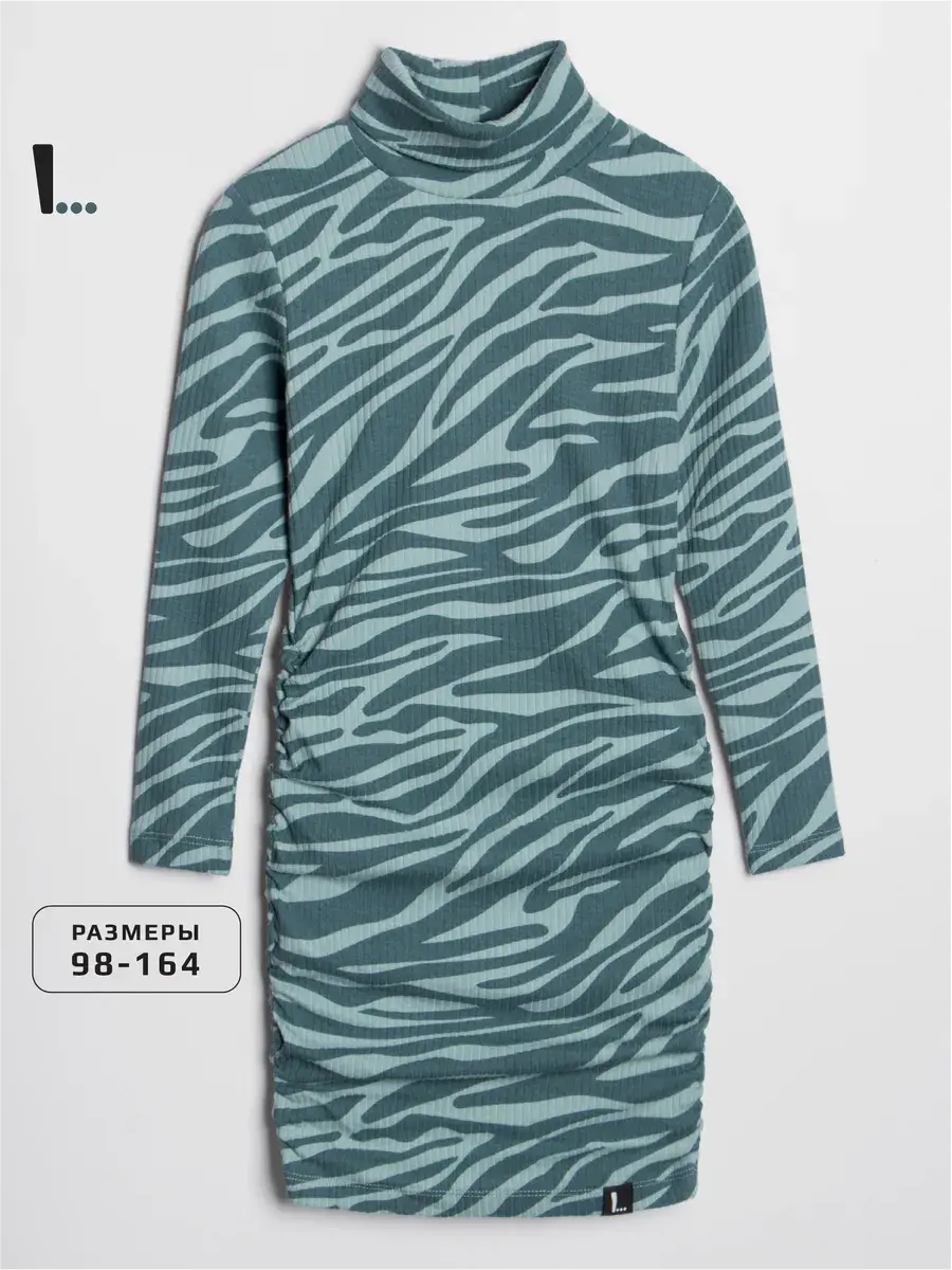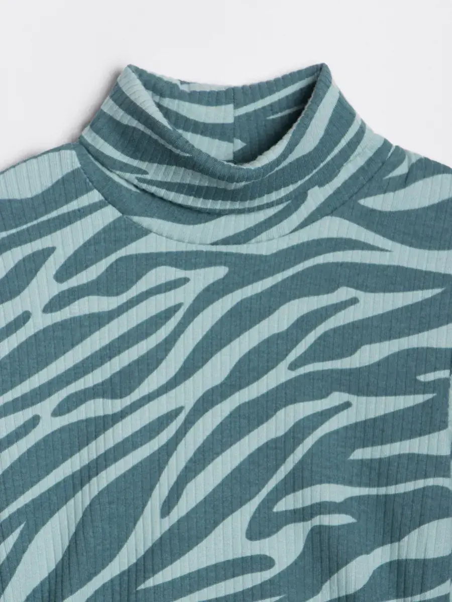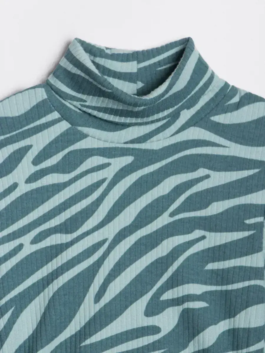Эффектная зебровая расцветка в мягких голубых тонах привлекает внимание и добавляет образу яркости, выделяет его среди повседневных вещей. Приятная текстура ткани в рубчик обеспечивает хорошую посадку и эстетичный внешний вид.