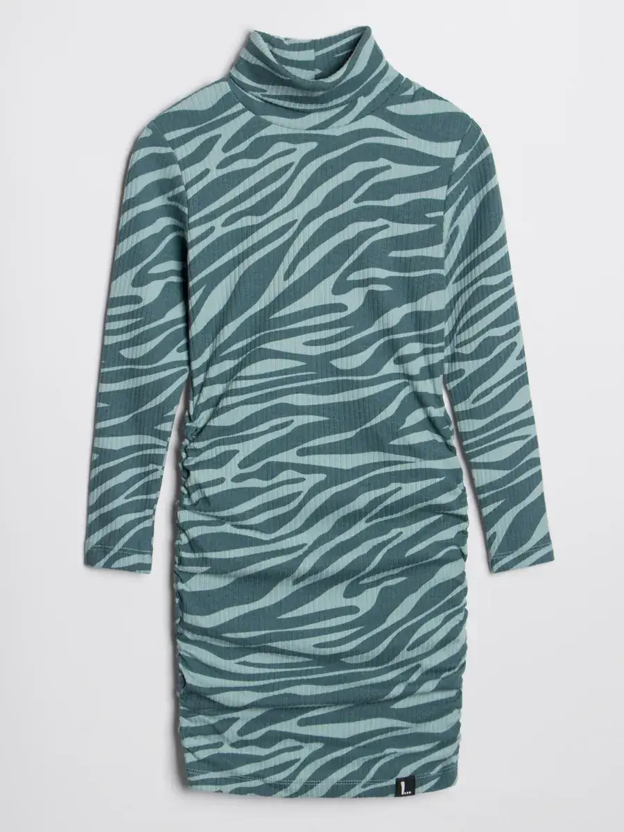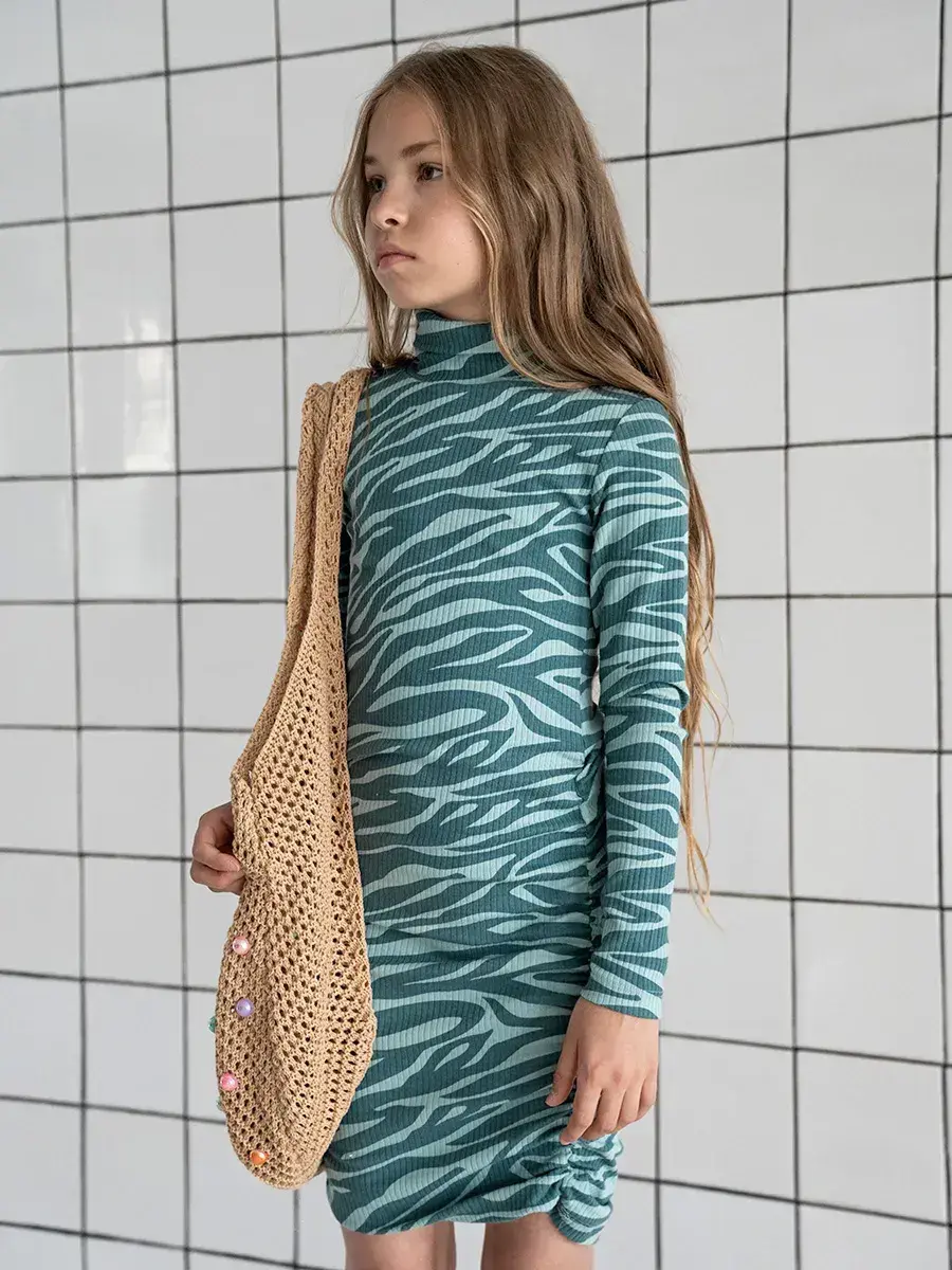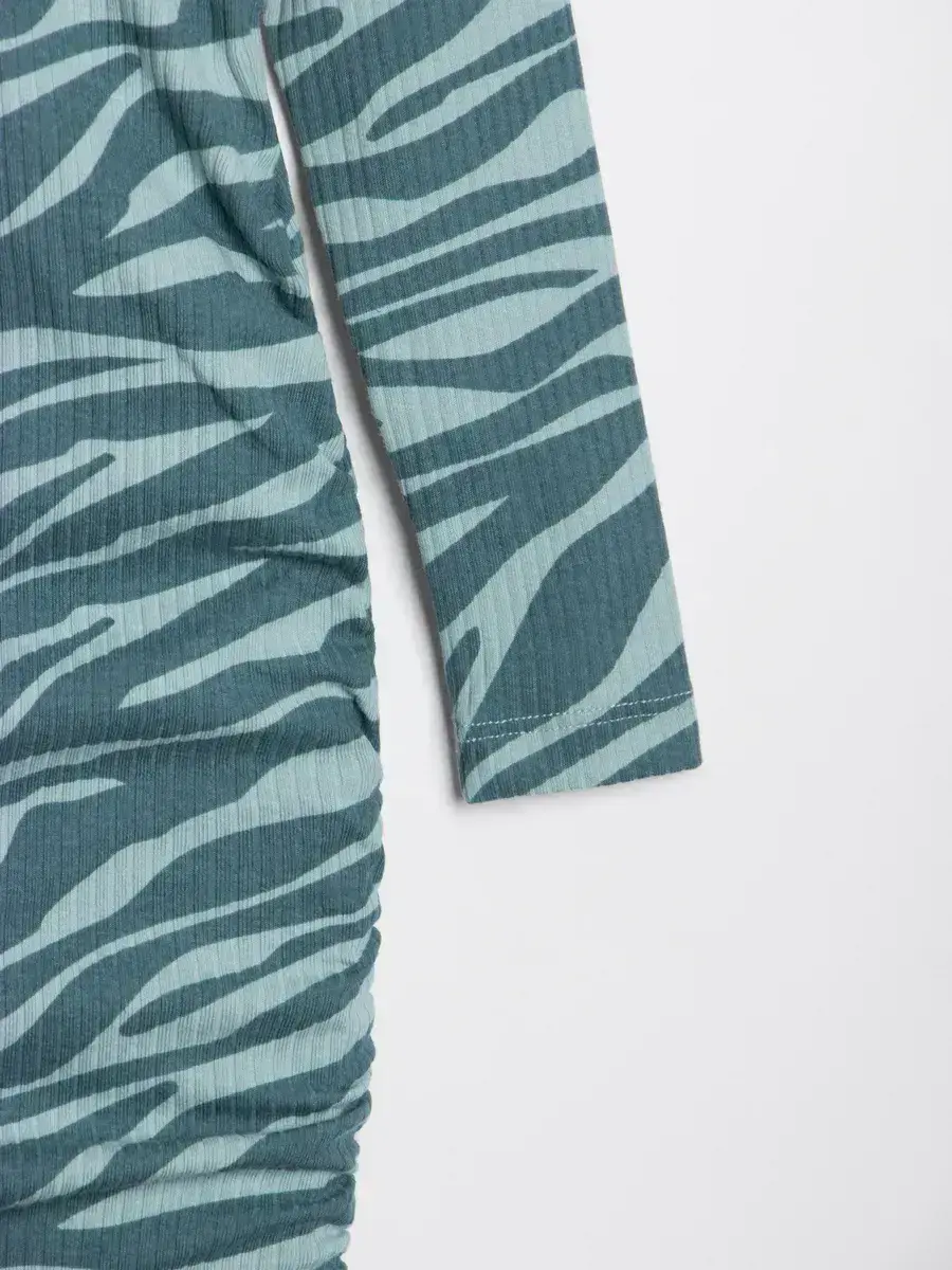 Эффектная зебровая расцветка в мягких голубых тонах привлекает внимание и добавляет образу яркости, выделяет его среди повседневных вещей. Приятная текстура ткани в рубчик обеспечивает хорошую посадку и эстетичный внешний вид.