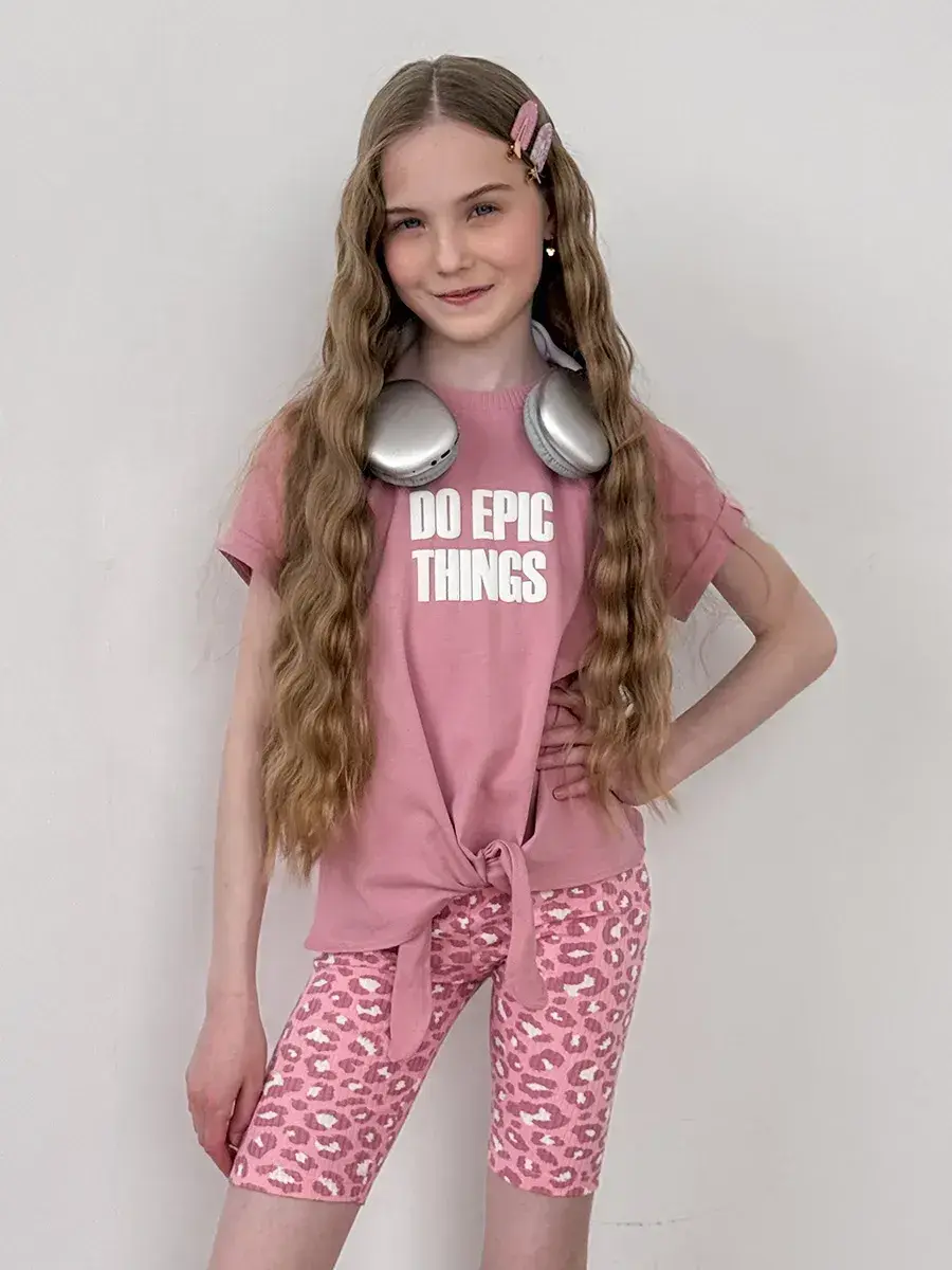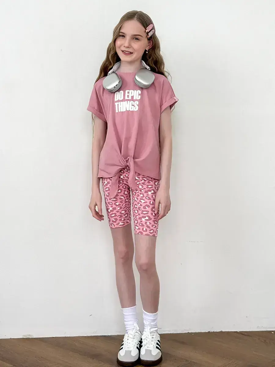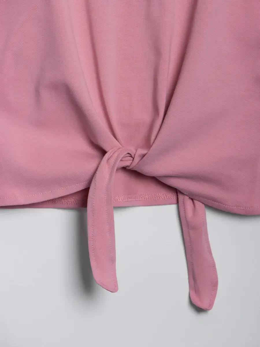 Розовая футболка с завязками и велосипедки станут самым практичным повседневным вариантом.
