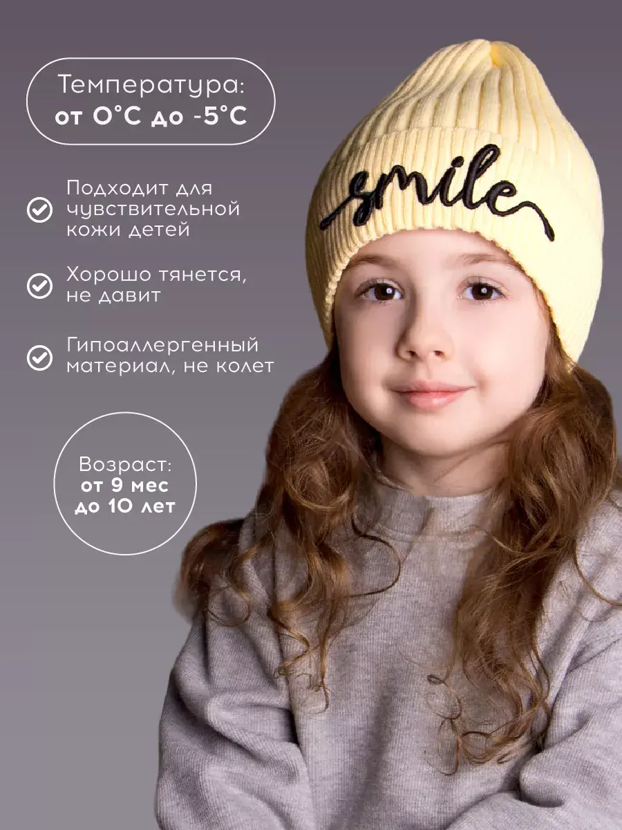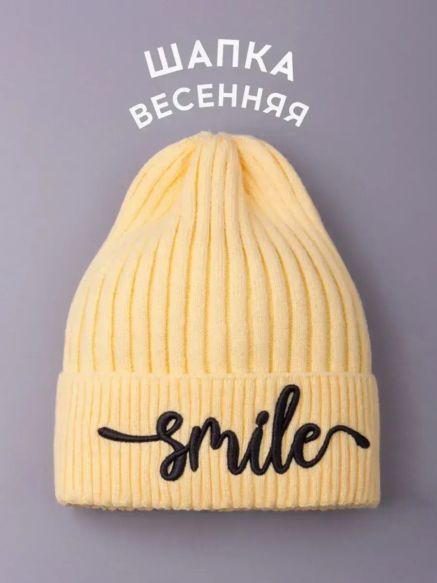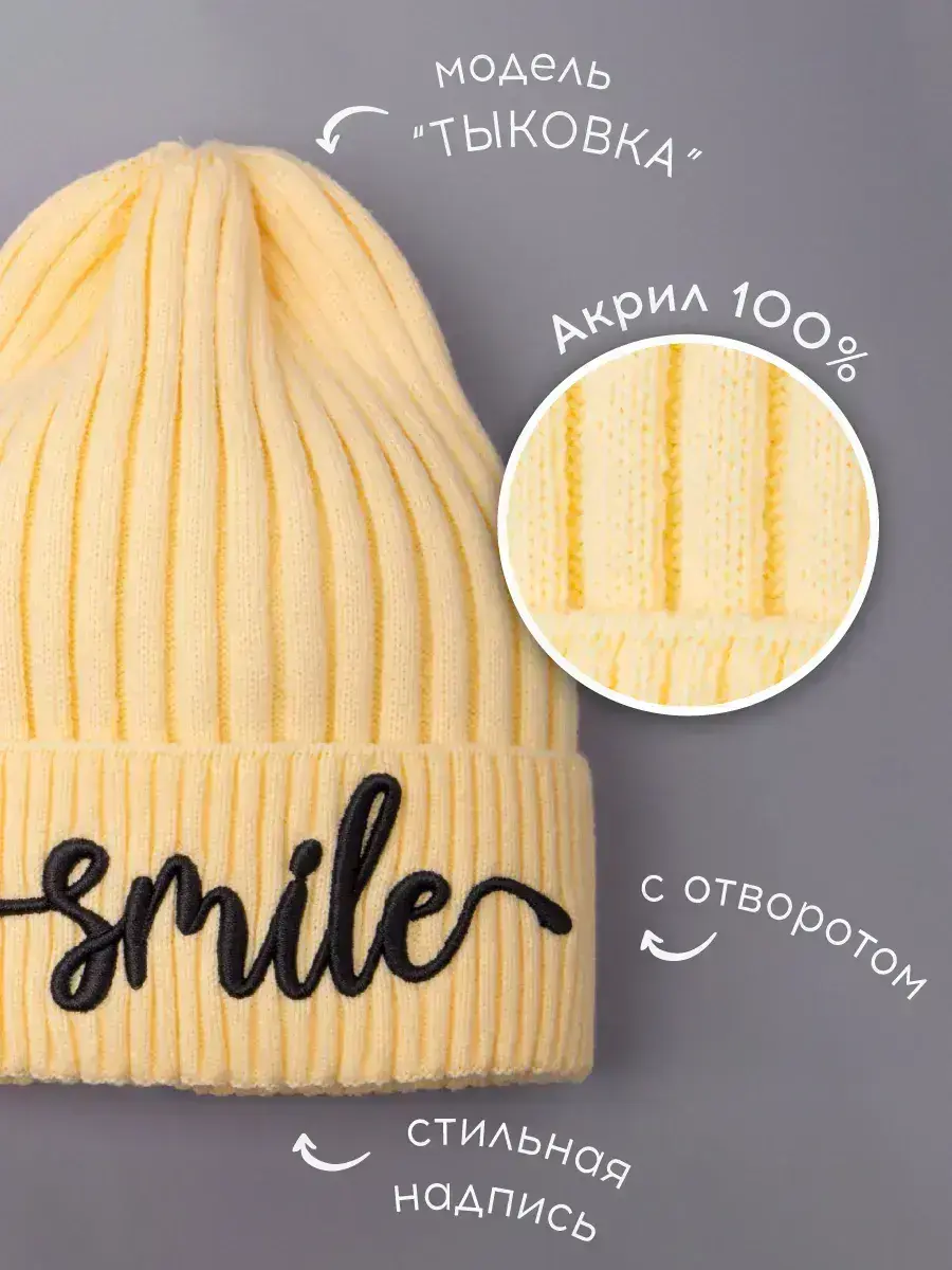 Шапка для девочки вязаная с модным дизайном станет прекрасным дополнением к стильному образу на эту осень. Головной убор для девочки в форме тыковки - хит этого сезона! Благодаря большому разнообразию цветов детская шапка хорошо сочетается с любым стилем и отлично впишется в гардероб каждой модницы! Модель хорошо сидит на голове и защищает ее от холода и ветра. Шапочка осенняя выполнена без подкладки, но не смотря на на это она очень мягкая и находиться в ней длительное время очень комфортно. Изделие выполнено из пряжи высокого качества (вязка лапша), поэтому сохранит отличный внешний вид даже после длительной носки. Декорирована тонкая шапка для девочки вышитой надписью "SMILE", что добавляет индивидуальности образу малышки. Наш головной убор - идеальное решение для школы, детского садика и прогулок на свежем воздухе.