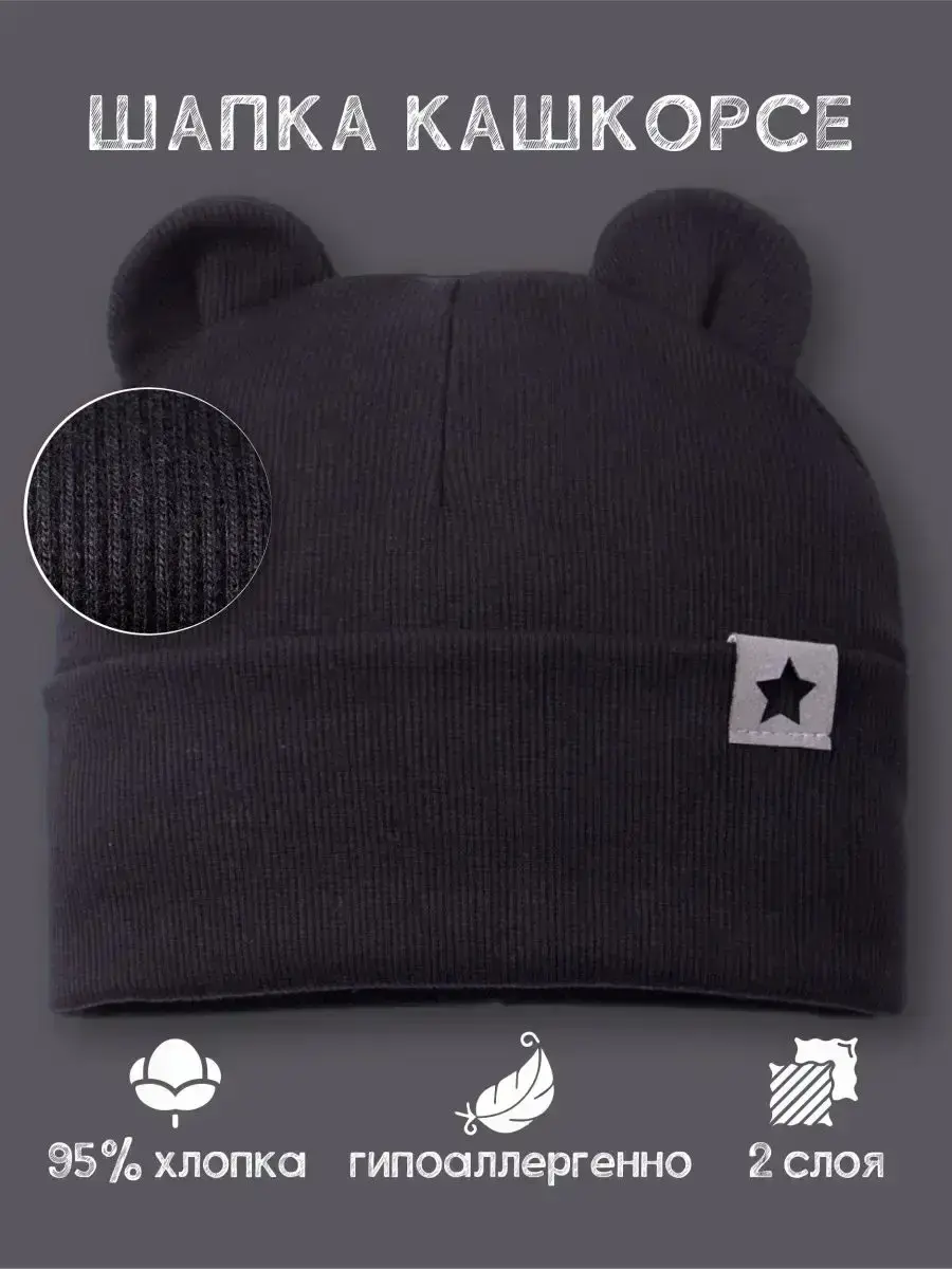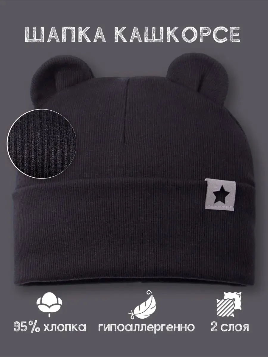 Шапка детская с ушками мишки - это прекрасный базовый вариант для детей на осень и теплую зиму. Детский головной убор без завязок отлично подойдет как для мальчика, так и для девочки. Она выполнена из нежнейшего трикотажа кашкорсе (в рубчик), поэтому малышу будет в ней очень комфортно и удобно. Демисезонная модель имеет широкий размерный ряд для детей от трех месяцев до десяти лет. Изделие также идеально для новорожденных на выписку. Чепчик без завязок декорирован модной нашивкой из искусственной кожи в виде звезды. Качественный пошив и прекрасно обработанные швы делают данную модель очень комфортной в носке, что делает ее идеальной шапкой для школы. Шапочка для малыше хорошо сидит на голове, не оставляет следов на коже и не сползает на лоб во время активных игр. Шапка бини для мальчика незаменима для прогулок на свежем воздухе, походов в детский сад и школу. Благодаря безопасному высококачественному составу (хлопок 95%, лайкра 5%) шапка для девочки демисезонная надолго сохранит свой первоначальный вид.