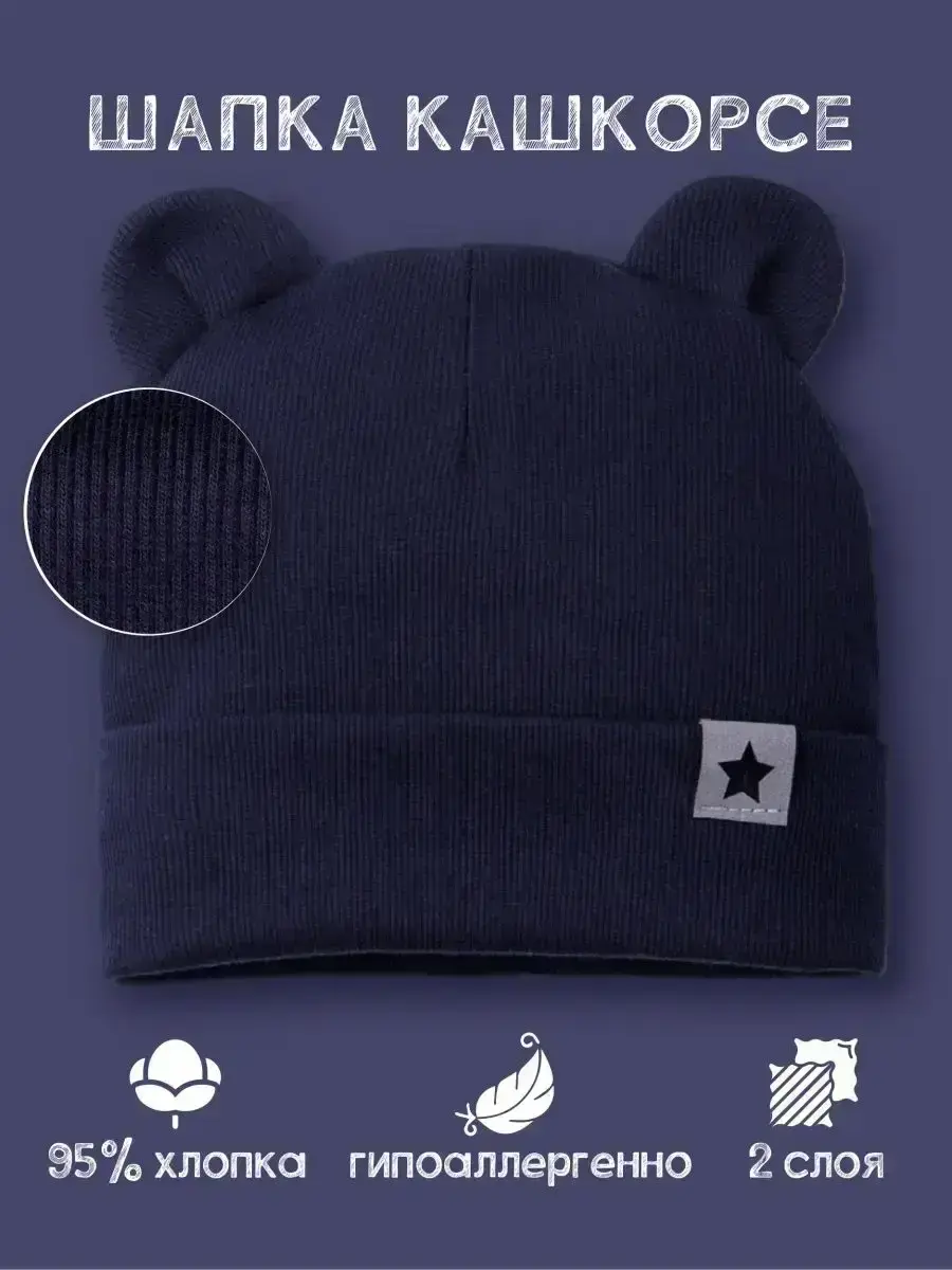 Шапка детская с ушками мишки - это прекрасный базовый вариант для детей на осень и теплую зиму. Детский головной убор без завязок отлично подойдет как для мальчика, так и для девочки. Она выполнена из нежнейшего трикотажа кашкорсе (в рубчик), поэтому малышу будет в ней очень комфортно и удобно. Демисезонная модель имеет широкий размерный ряд для детей от трех месяцев до десяти лет. Изделие также идеально для новорожденных на выписку. Чепчик без завязок декорирован модной нашивкой из искусственной кожи в виде звезды. Качественный пошив и прекрасно обработанные швы делают данную модель очень комфортной в носке, что делает ее идеальной шапкой для школы. Шапочка для малыше хорошо сидит на голове, не оставляет следов на коже и не сползает на лоб во время активных игр. Шапка бини для мальчика незаменима для прогулок на свежем воздухе, походов в детский сад и школу. Благодаря безопасному высококачественному составу (хлопок 95%, лайкра 5%) шапка для девочки демисезонная надолго сохранит свой первоначальный вид.