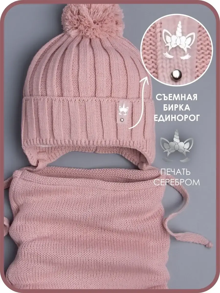 Шапка для девочки вязаная и снуд-это отличный вариант на осень и теплую зиму. Шапочка для девочки с завязками подойдет как для малышей с шести месяцев, так и для детей постарше (подростков). Модель дополнена подкладкой из натурального хлопка, благодаря чему голова не будет потеть, а находиться в ней во время долгих прогулок будет комфортно. Широкий отворот головного убора плотно прилегает, закрывая ушки и лоб. Декорировано изделие стильной кожаной биркой с изображением единорога, которая без труда отстегивается. Снуд для девочки -это удобная альтернатива шарфу или манишке, он хорошо тянется и защищает шею от холода. Благодаря качественной вязке он легко регулируется по ширине, а его длина подходит даже для самого объемного капюшона. Модель выполнена в самых трендовых цветах этого сезона и прекрасно сочетается с любым гардеробом юной модницы. Она изготовлена из пряжи высокого качества, которая не растянется и не потеряет форму даже после длительного использования. Комплект для детей не скатывается, не магнитится, не продувает. Для того, чтобы шапка детская на осень прослужила Вам как можно дольше, мы рекомендуем ручную или машинную бережную стирку при t не более 30 С. Детская осенняя шапка со снудом от российского бренда РусБубон непременно должна быть у Вашего ребенка! Сделано в России.