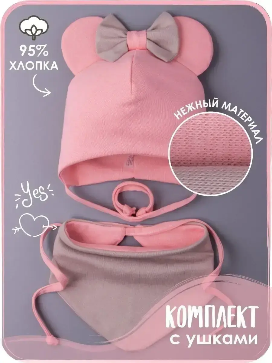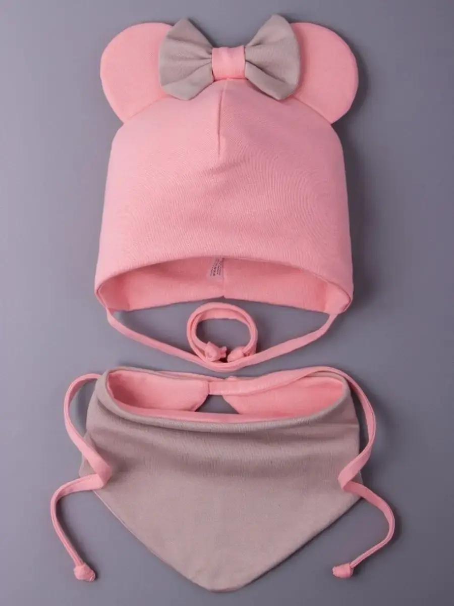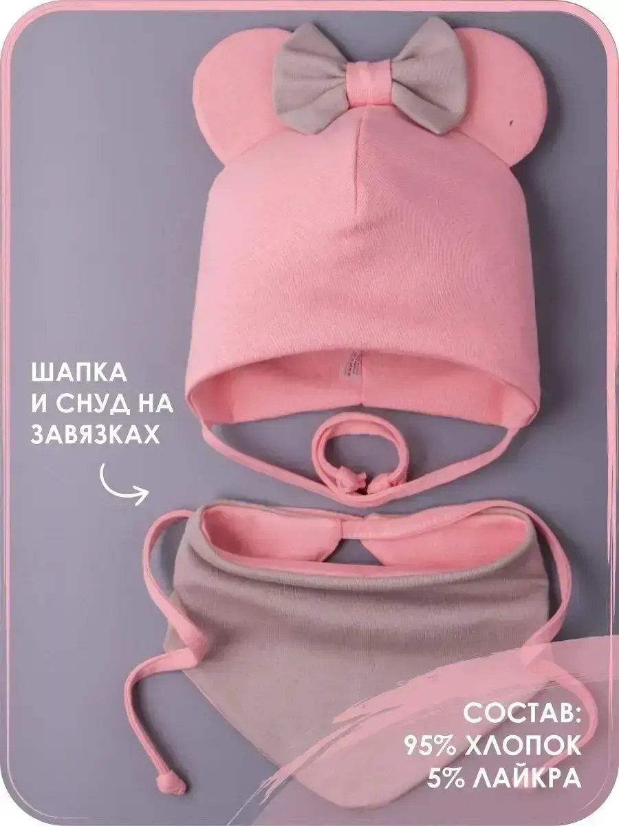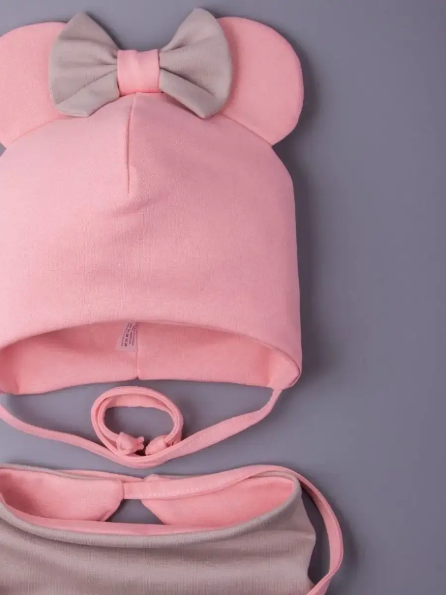 Шапка осенняя для девочки с ушками и снудом – это стильный и уютный вариант на осень и теплую зиму для вашего малыша! Хотите, чтобы ваш ребенок чувствовал себя комфортно и стильно в любую погоду? Тогда этот комплект для девочки - идеальный вариант для вас! Демисезонная шапка с ушками и бантиком для девочки из мягкого и приятного к телу трикотажа отлично защитит от ветра и холода в переходные периоды года. Шапка на завязках закрывает уши и не дает холоду проникнуть, а ушки мики мауса придают образу малыша особую милость и очарование.