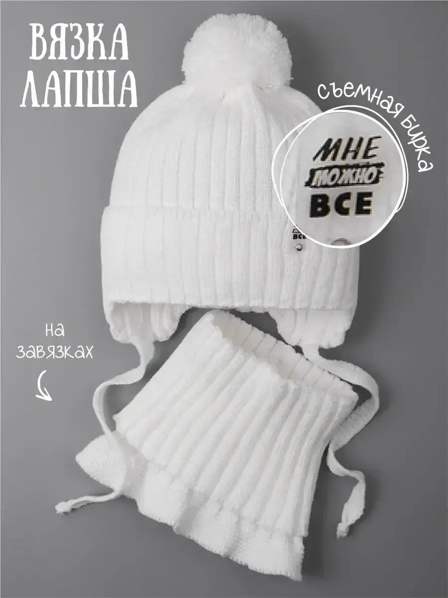 Шапка детская демисезонная со снудом от бренда Ok Top - это идеальный вариант на осень и на теплую зиму. Головной убор подойдет к любому гардеробу девочки. Декорирована осенняя вязаная шапочка съемной биркой с надписью "Мне можно все", которую на время ухода за изделием можно легко отстегнуть. Данная модель сочетается с любым видом верхней одежды и стильно дополняет образ. Шапка на осень снабжена хлопковой подкладкой, которая не дает голове ребенка вспотеть, а значит снижает риск простудиться. Широкие завязки оптимальной длины без труда завязываются в бант. Плотный отворот надежно защищает уши и шею малыша от холода ветра. Вязаный снуд отлично тянется и его без труда можно носить под капюшоном верхней одежды. Шарф детский очень мягкий, не колется и раздражает кожу. Большой размерный ряд позволит Вам выбрать комплект для детей от двух до десяти лет, что делает эту шапку универсальным решением для школы и детского сада.