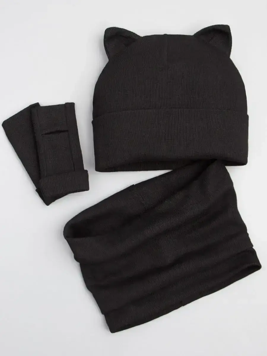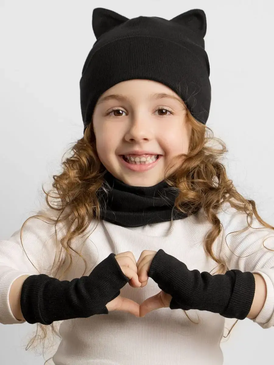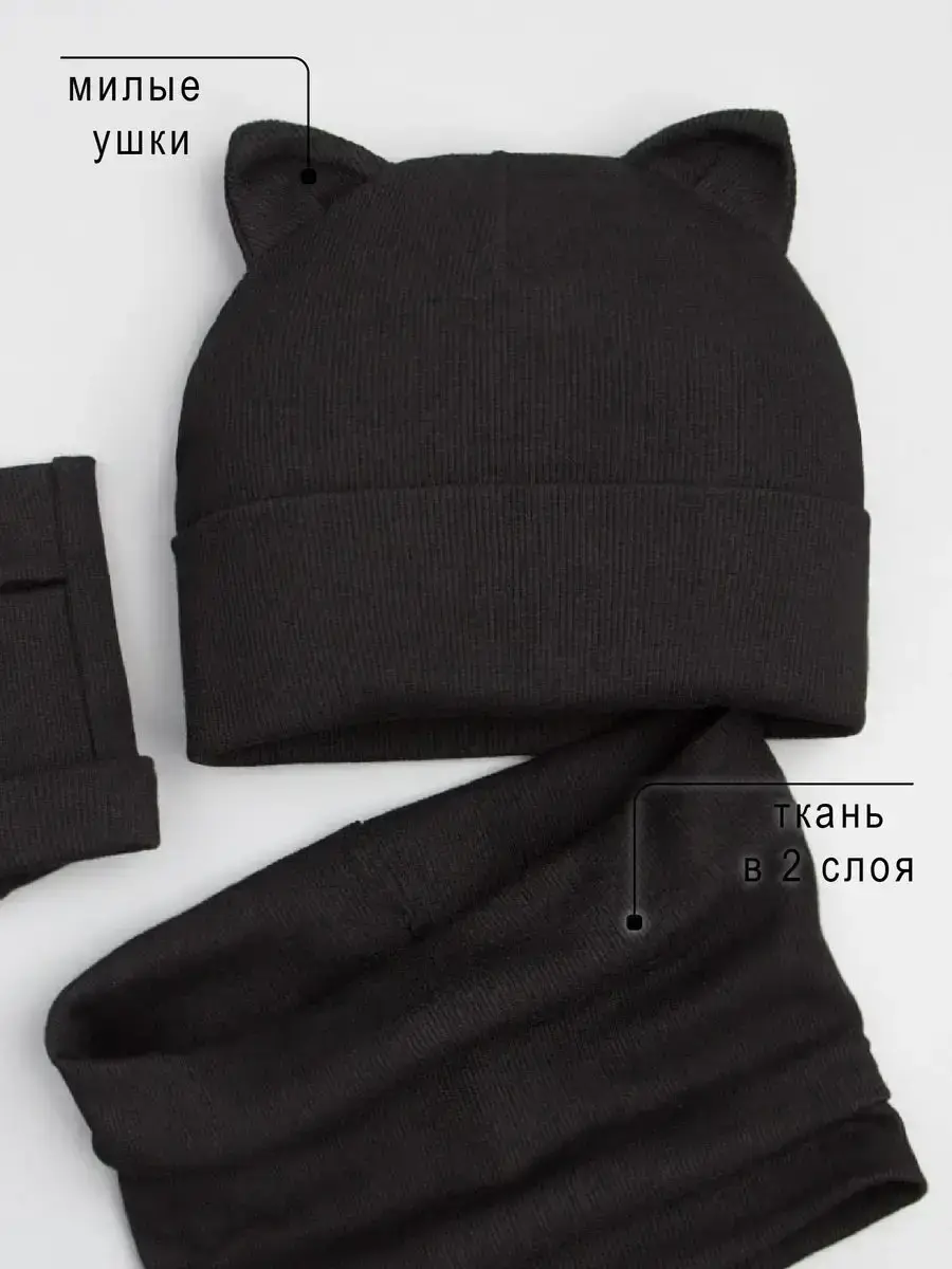 Шапка осенняя для девочки с ушками, снудом и митенками – это стильный и уютный вариант на осень и теплую зиму для вашего малыша! Хотите, чтобы ваш ребенок чувствовал себя комфортно и стильно в любую погоду? Тогда этот комплект шапка с ушками, снуд и митенки - идеальный вариант для вас! Демисезонная шапка с ушками для девочки из мягкого и приятного к телу трикотажа отлично защитит от ветра и холода в переходные периоды года. Широкий отворот закрывает уши и не дает холоду проникнуть, а ушки придают образу малыша особую милость и очарование.