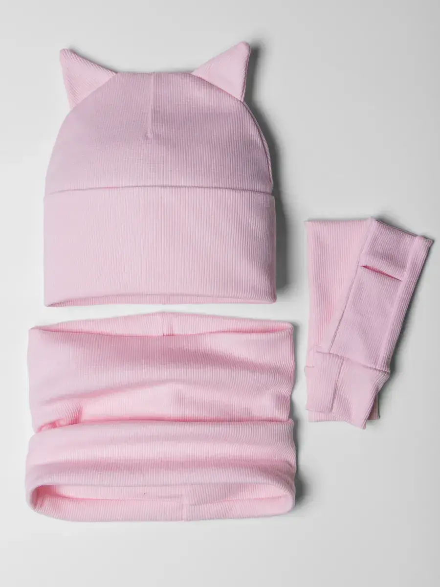 Шапка осенняя для девочки с ушками, снудом и митенками – это стильный и уютный вариант на осень и теплую зиму для вашего малыша! Хотите, чтобы ваш ребенок чувствовал себя комфортно и стильно в любую погоду? Тогда этот комплект шапка с ушками, снуд и митенки - идеальный вариант для вас! Демисезонная шапка с ушками для девочки из мягкого и приятного к телу трикотажа отлично защитит от ветра и холода в переходные периоды года. Широкий отворот закрывает уши и не дает холоду проникнуть, а ушки придают образу малыша особую милость и очарование.