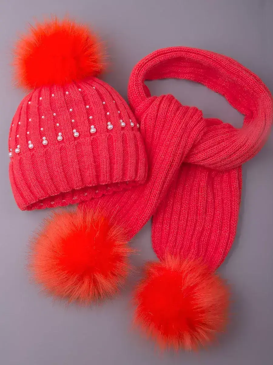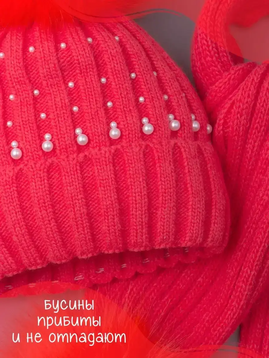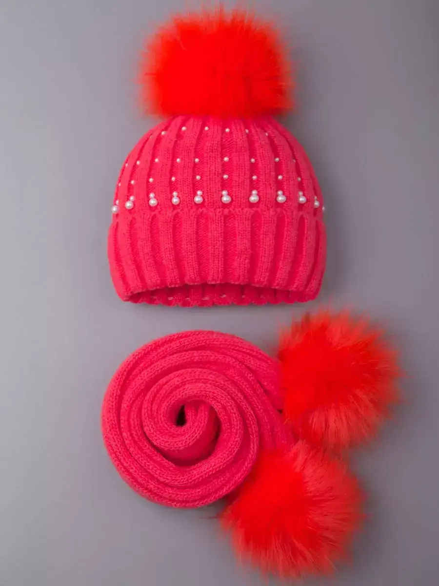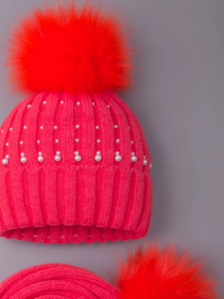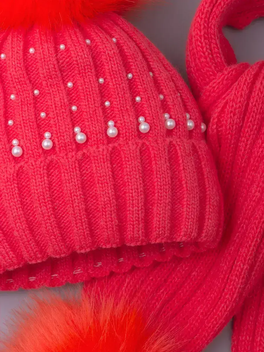 Шапка для девочки в комплекте с шарфом для девочки - это отличное решение для Вашего ребенка на зиму или на холодную осень. Вязаная шапочка с подворотом и шарфик с помпонами настолько теплые и мягкие, что не дадут замерзнуть ребенку даже в сильные морозы. Головной убор демисезонный украшен россыпью из перламутровых бусин, что сделает образ малышки нежным и неповторимым. Шапка для девочки зимняя утеплена подкладкой из флиса, а плотный отворот хорошо закрывает уши и защищает от ветра. Теплая шапка для детей выполнена из высококачественной гипоаллергенной пряжи, за счет чего она не колется и не вызывает раздражения на нежной коже ребёнка. Чтобы меховой помпон быстрее распушился его необходимо подержать над горячим паром 2-3 секунды и встряхнуть. Шарф для девочки отлично закрывает шею ребенка. Снуд идет в тон шапке, что делает образ завершенным и гармоничным.