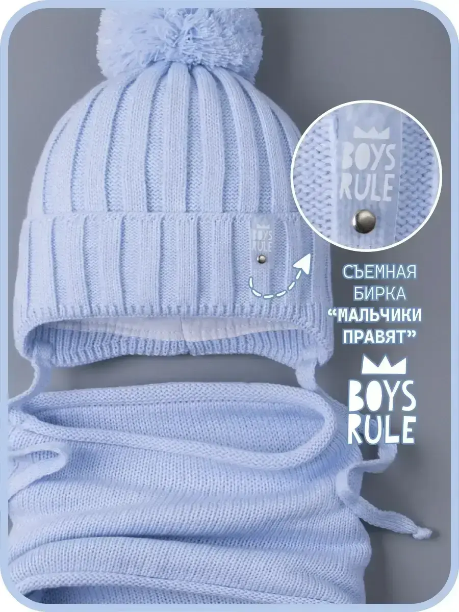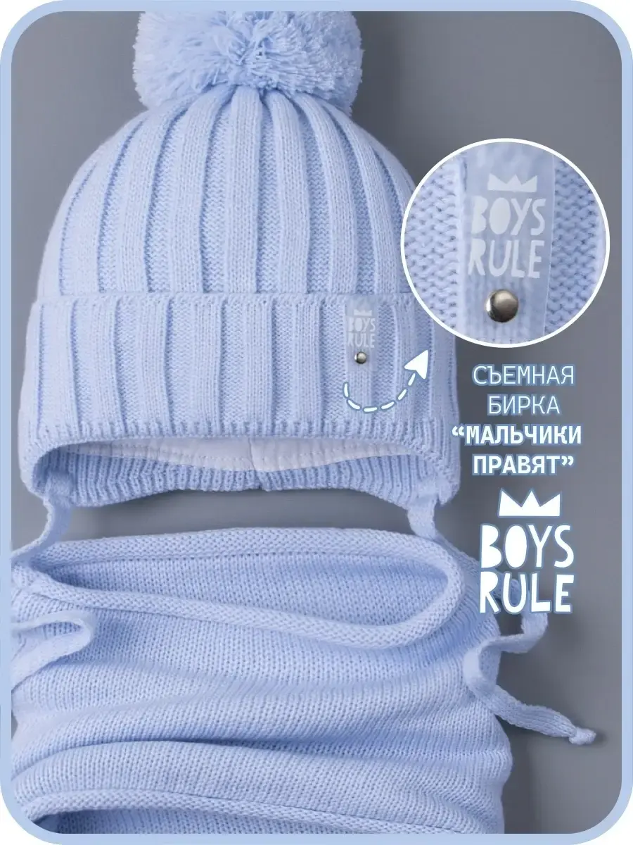 Шапка детская для мальчика и снуд- это отличный вариант холодной погоды на осень и на теплую зиму. Шапка демисезонная с завязками подойдет как для малышей с шести месяцев, так и для детей постарше. Вязаная шапочка дополнена подкладом из натурального хлопка, благодаря чему голова ребенка не будет потеть, а находиться в ней во время долгих прогулок будет комфортно. Широкий отворот теплой плотно прилегает к голове, закрывает уши и защищает от холода. Головной убор декорирован стильной биркой с надписью BOYS RULE. На время ухода за изделием ее можно легко отстегнуть. Снуд детский для мальчика - это удобная альтернатива шарфу или манишке, он хорошо тянется и защищает шею ребенка от холода. Благодаря качественной вязке он легко регулируется по ширине, а его длина подходит даже для самого объемного капюшона. Шапка для малышей выполнена в самых трендовых цветах этого сезона. Комплект отлично впишется в гардероб Вашего ребенка и прекрасно дополнят образ. Рекомендуемый температурный режим от +5 до -10 С. Набор изготовлен из пряжи высокого качества, которая не растянется и не потеряет форму даже после множества стирок. Он не скатывается, не магнитится, не продувает. Для того, чтобы изделие прослужило Вам как можно дольше, мы рекомендуем ручную или машинную бережную стирку при t не более 30 С.