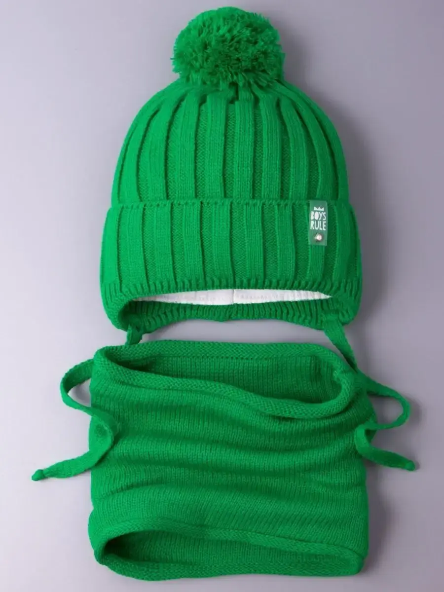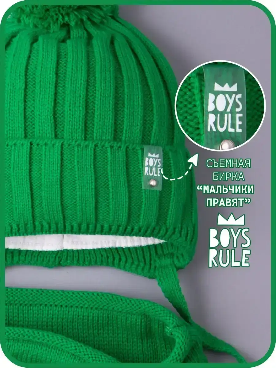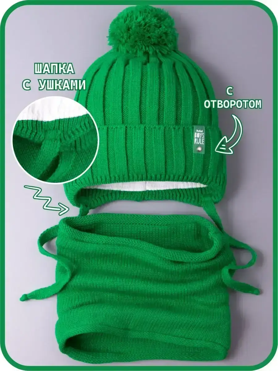 Шапка детская для мальчика и снуд- это отличный вариант холодной погоды на осень и на теплую зиму. Шапка демисезонная с завязками подойдет как для малышей с шести месяцев, так и для детей постарше. Вязаная шапочка дополнена подкладом из натурального хлопка, благодаря чему голова ребенка не будет потеть, а находиться в ней во время долгих прогулок будет комфортно. Широкий отворот теплой плотно прилегает к голове, закрывает уши и защищает от холода. Головной убор декорирован стильной биркой с надписью BOYS RULE. На время ухода за изделием ее можно легко отстегнуть. Снуд детский для мальчика - это удобная альтернатива шарфу или манишке, он хорошо тянется и защищает шею ребенка от холода. Благодаря качественной вязке он легко регулируется по ширине, а его длина подходит даже для самого объемного капюшона. Шапка для малышей выполнена в самых трендовых цветах этого сезона. Комплект отлично впишется в гардероб Вашего ребенка и прекрасно дополнят образ. Рекомендуемый температурный режим от +5 до -10 С. Набор изготовлен из пряжи высокого качества, которая не растянется и не потеряет форму даже после множества стирок. Он не скатывается, не магнитится, не продувает. Для того, чтобы изделие прослужило Вам как можно дольше, мы рекомендуем ручную или машинную бережную стирку при t не более 30 С.