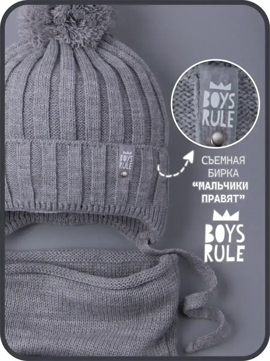 Шапка детская для мальчика и снуд- это отличный вариант холодной погоды на осень и на теплую зиму. Шапка демисезонная с завязками подойдет как для малышей с шести месяцев, так и для детей постарше. Вязаная шапочка дополнена подкладом из натурального хлопка, благодаря чему голова ребенка не будет потеть, а находиться в ней во время долгих прогулок будет комфортно. Широкий отворот теплой плотно прилегает к голове, закрывает уши и защищает от холода. Головной убор декорирован стильной биркой с надписью BOYS RULE. На время ухода за изделием ее можно легко отстегнуть. Снуд детский для мальчика - это удобная альтернатива шарфу или манишке, он хорошо тянется и защищает шею ребенка от холода. Благодаря качественной вязке он легко регулируется по ширине, а его длина подходит даже для самого объемного капюшона. Шапка для малышей выполнена в самых трендовых цветах этого сезона. Комплект отлично впишется в гардероб Вашего ребенка и прекрасно дополнят образ. Рекомендуемый температурный режим от +5 до -10 С. Набор изготовлен из пряжи высокого качества, которая не растянется и не потеряет форму даже после множества стирок. Он не скатывается, не магнитится, не продувает. Для того, чтобы изделие прослужило Вам как можно дольше, мы рекомендуем ручную или машинную бережную стирку при t не более 30 С.