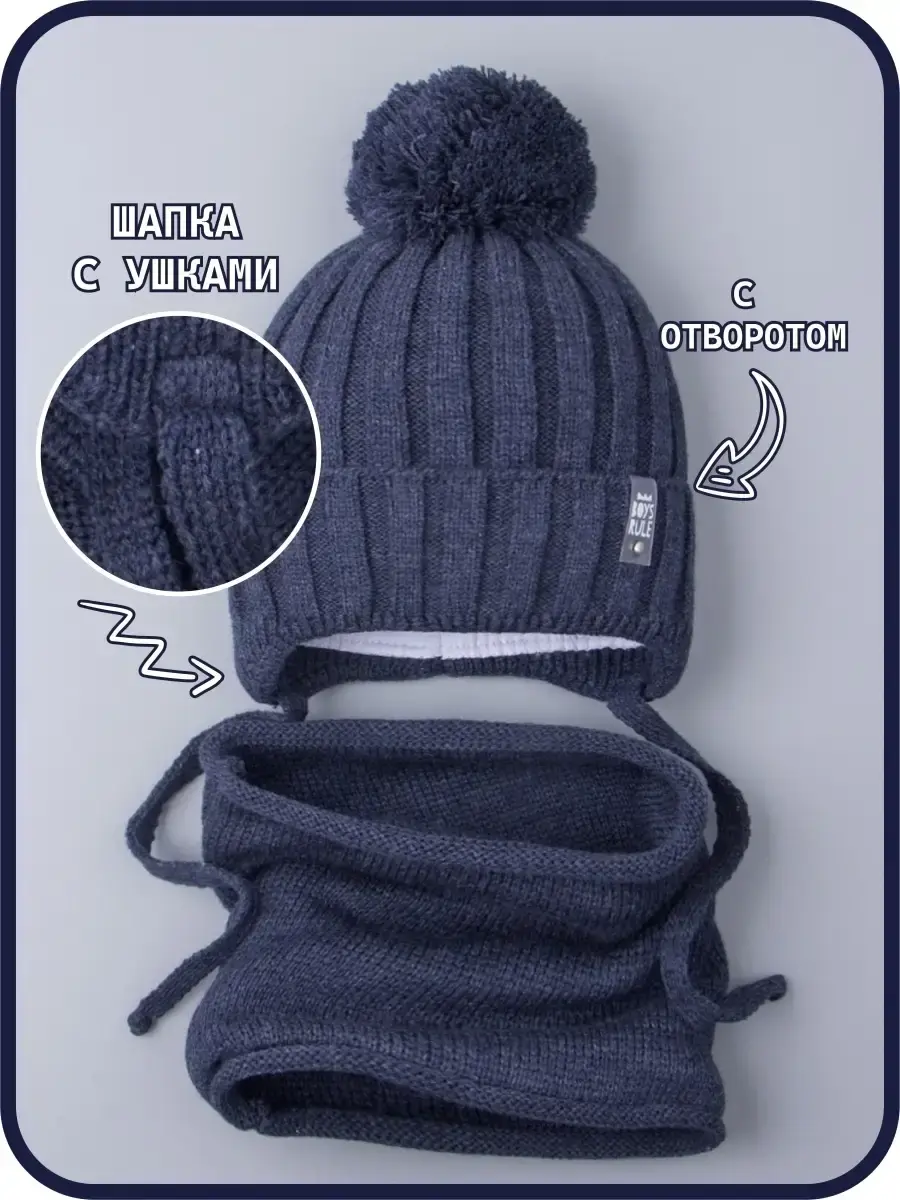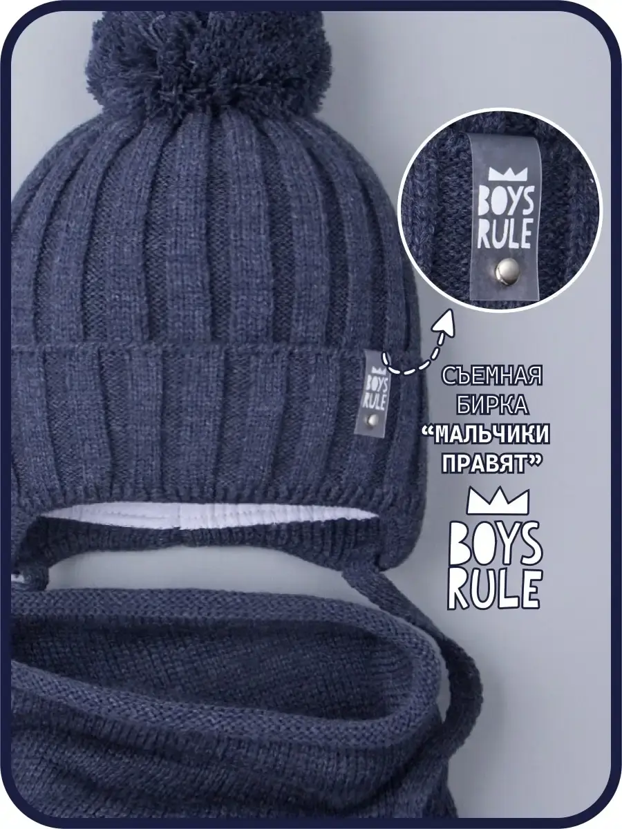 Шапка детская для мальчика и снуд- это отличный вариант холодной погоды на осень, а также на теплую зиму. Шапочка детская демисезонная с завязками подойдет как для малышей с шести месяцев, так и для детей постарше. Вязаная шапочка для мальчика дополнена подкладом из натурального хлопка, благодаря чему голова ребенка не будет потеть, а находиться в ней во время долгих прогулок будет комфортно. Широкий отворот теплой плотно прилегает к голове, закрывает уши и защищает от холода. Головной убор декорирован стильной биркой с надписью BOYS RULE. На время ухода за изделием ее можно легко отстегнуть. Снуд детский для мальчика-это удобная альтернатива шарфу или манишке, он хорошо тянется и защищает шею ребенка от холода. Благодаря качественной вязке он легко регулируется по ширине, а его длина подходит даже для самого объемного капюшона. Шапка для малышей выполнена в самых трендовых цветах этого сезона. Данный детский комплект отлично впишется в гардероб Вашего ребенка и прекрасно дополнят образ. Рекомендуемый температурный режим от +5 до -10 С. Набор изготовлен из пряжи высокого качества, которая не растянется и не потеряет форму даже после множества стирок. Он не скатывается, не магнитится, не продувает. Для того, чтобы изделие прослужило Вам как можно дольше, мы рекомендуем ручную или машинную бережную стирку при t не более 30 С.