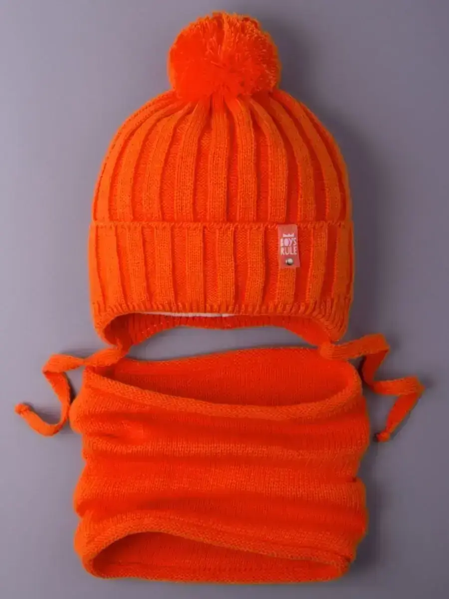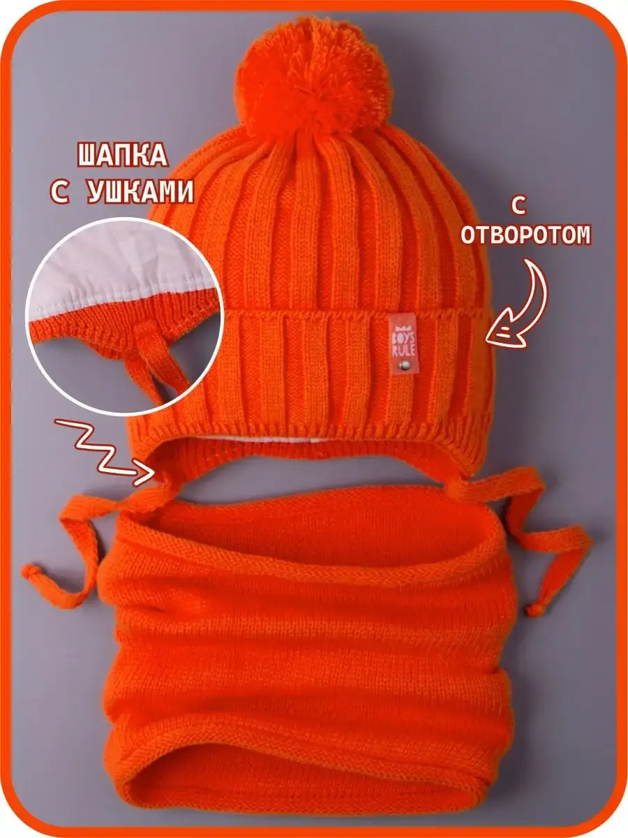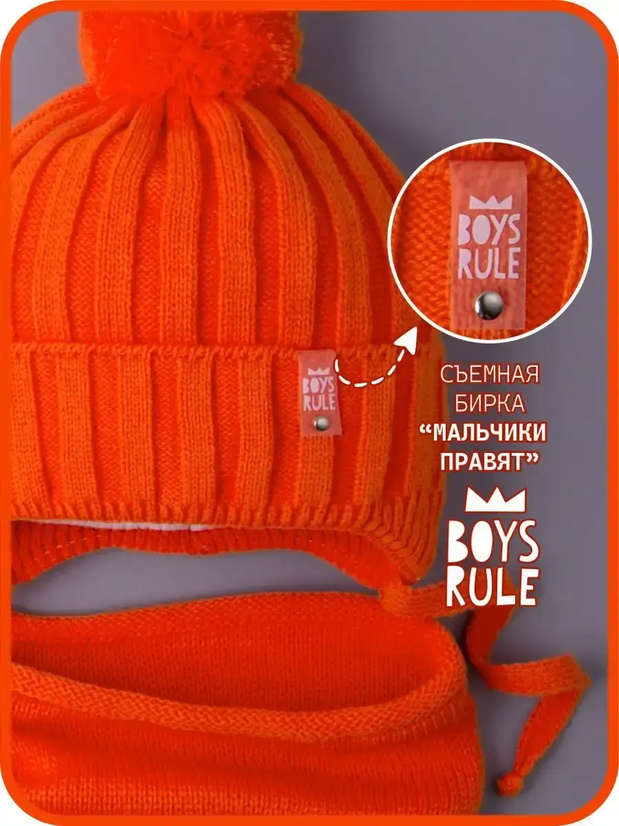 Шапка детская для мальчика и снуд- это отличный вариант холодной погоды на осень и на теплую зиму. Шапка демисезонная с завязками подойдет как для малышей с шести месяцев, так и для детей постарше. Вязаная шапочка дополнена подкладом из натурального хлопка, благодаря чему голова ребенка не будет потеть, а находиться в ней во время долгих прогулок будет комфортно. Широкий отворот теплой плотно прилегает к голове, закрывает уши и защищает от холода. Головной убор декорирован стильной биркой с надписью BOYS RULE. На время ухода за изделием ее можно легко отстегнуть. Снуд детский для мальчика - это удобная альтернатива шарфу или манишке, он хорошо тянется и защищает шею ребенка от холода. Благодаря качественной вязке он легко регулируется по ширине, а его длина подходит даже для самого объемного капюшона. Шапка для малышей выполнена в самых трендовых цветах этого сезона. Комплект отлично впишется в гардероб Вашего ребенка и прекрасно дополнят образ. Рекомендуемый температурный режим от +5 до -10 С. Набор изготовлен из пряжи высокого качества, которая не растянется и не потеряет форму даже после множества стирок. Он не скатывается, не магнитится, не продувает. Для того, чтобы изделие прослужило Вам как можно дольше, мы рекомендуем ручную или машинную бережную стирку при t не более 30 С.