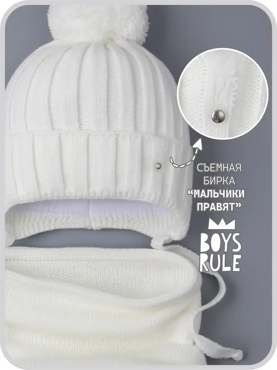 Шапка детская для мальчика и снуд- это отличный вариант холодной погоды на осень и на теплую зиму. Шапка демисезонная с завязками подойдет как для малышей с шести месяцев, так и для детей постарше. Вязаная шапочка дополнена подкладом из натурального хлопка, благодаря чему голова ребенка не будет потеть, а находиться в ней во время долгих прогулок будет комфортно. Широкий отворот теплой плотно прилегает к голове, закрывает уши и защищает от холода. Головной убор декорирован стильной биркой с надписью BOYS RULE. На время ухода за изделием ее можно легко отстегнуть. Снуд детский для мальчика - это удобная альтернатива шарфу или манишке, он хорошо тянется и защищает шею ребенка от холода. Благодаря качественной вязке он легко регулируется по ширине, а его длина подходит даже для самого объемного капюшона. Шапка для малышей выполнена в самых трендовых цветах этого сезона. Комплект отлично впишется в гардероб Вашего ребенка и прекрасно дополнят образ. Рекомендуемый температурный режим от +5 до -10 С. Набор изготовлен из пряжи высокого качества, которая не растянется и не потеряет форму даже после множества стирок. Он не скатывается, не магнитится, не продувает. Для того, чтобы изделие прослужило Вам как можно дольше, мы рекомендуем ручную или машинную бережную стирку при t не более 30 С.