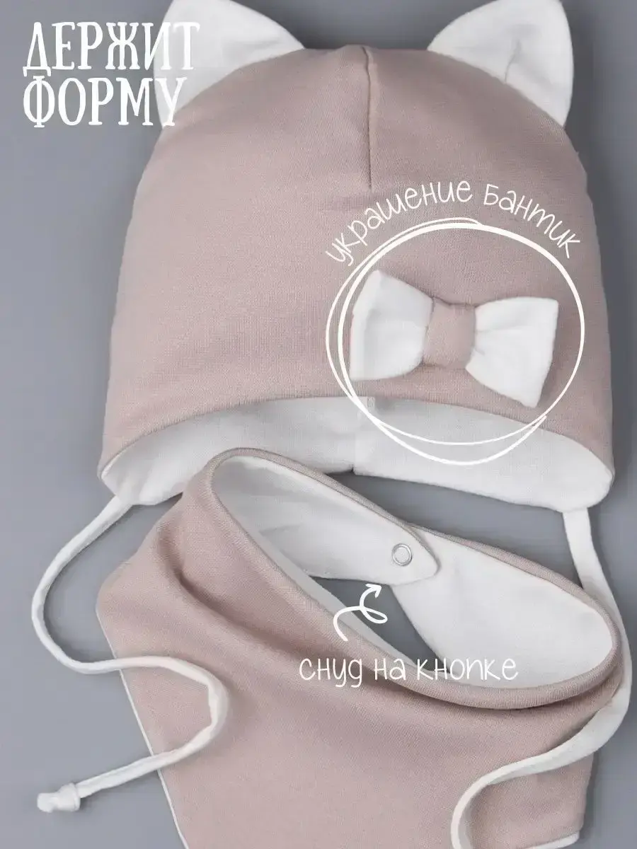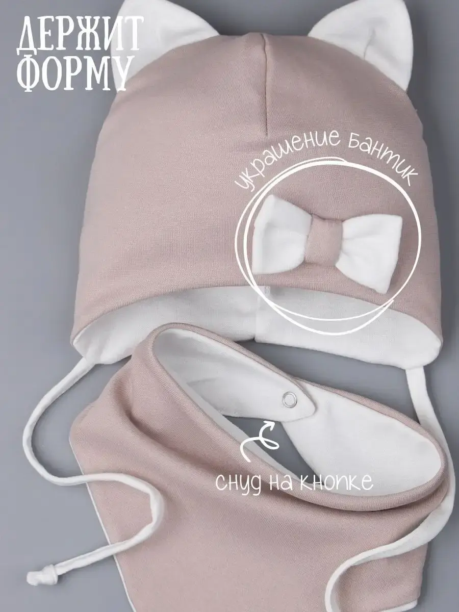 Трикотажный демисезонный комплект для девочек изготовлен из хлопка. Включает в себя снуд и шапку с ушками котика. Идеален на весну и теплую осень. Благодаря двухслойной структуре ткани вашему малышу будет тепло и комфортно даже в ветреную погоду. Шапочка плотно прилегает, не сползает на лоб и прикрывает уши. Нагрудник легко одевать и снимать, он не заворачивается во время носки и не дает шее потеть. Гипоаллергенный материал подойдет для детей с чувствительной кожей. Данный дуэт замечательно дополнит любую легкую курточку или пальто. Модель имеет широкую цветовую палитру. Вы можете заказать несколько наборов и комбинировать их по очереди, создавая новые стильные образы каждый день. Мягкое полотно не потеряет яркость и надолго сохранит первоначальную форму даже после множества стирок. Изделие подходит для активного отдыха на свежем воздухе, прогулок и похода в детский сад. Рекомендуемый температурный режим от +5 до +15 С. Комплект станет великолепным подарком к любому празднику!