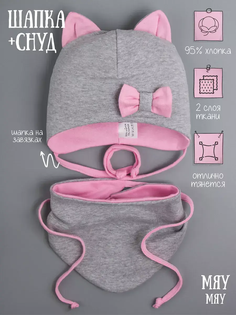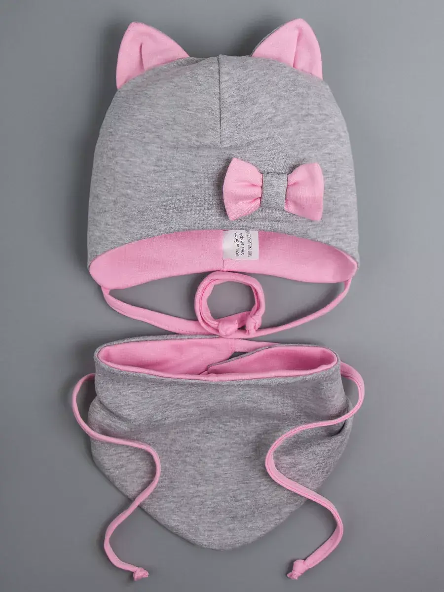 Трикотажный демисезонный комплект для девочек изготовлен из хлопка. Включает в себя снуд и шапку с ушками котика. Идеален на весну и теплую осень. Благодаря двухслойной структуре ткани вашему малышу будет тепло и комфортно даже в ветреную погоду. Шапочка плотно прилегает, не сползает на лоб и прикрывает уши. Нагрудник легко одевать и снимать, он не заворачивается во время носки и не дает шее потеть. Гипоаллергенный материал подойдет для детей с чувствительной кожей. Данный дуэт замечательно дополнит любую легкую курточку или пальто. Модель имеет широкую цветовую палитру. Вы можете заказать несколько наборов и комбинировать их по очереди, создавая новые стильные образы каждый день. Мягкое полотно не потеряет яркость и надолго сохранит первоначальную форму даже после множества стирок. Изделие подходит для активного отдыха на свежем воздухе, прогулок и похода в детский сад. Рекомендуемый температурный режим от +5 до +15 С. Комплект станет великолепным подарком к любому празднику!