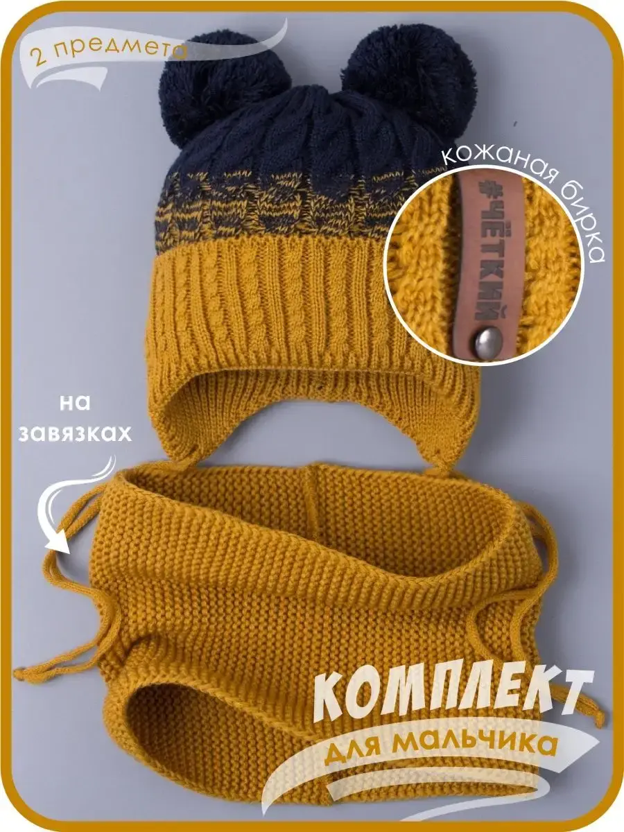Шапка детская для мальчика с двумя помпонами - это самый подходящий вариант для переменчивой погоды на осень и на теплую зиму. Модель представлена в нескольких размерах и подойдет как для малышей, так и для подростков. Головной убор имеет хлопковую подкладку, благодаря чему голова ребенка не будет потеть при смене температур, а значит снижается риск простудиться. Широкий плотный отворот закрывает уши, лоб и шею, защищает от холода. Комплект рассчитан на температурный режим от -5 до -10 С. В качестве декора имеется кожаная съемная бирка с надписью "ЧЕТКИЙ", которая при необходимости легко отстегивается. Большое количество расцветок позволит подобрать демисезонный набор к любому гардеробу. Вязаный снуд прекрасно заменяет шарф или манишку, хорошо растягивается и его можно надевать как под верхнюю одежду, так и на нее (под капюшон). Шапочка и шарфик выполнены из высококачественной пряжи (акрил), поэтому надолго сохранят свой первоначальный внешний вид. Наш демисезонный комплект для мальчика просто незаменим для школы, детского садика и прогулок на свежем воздухе.