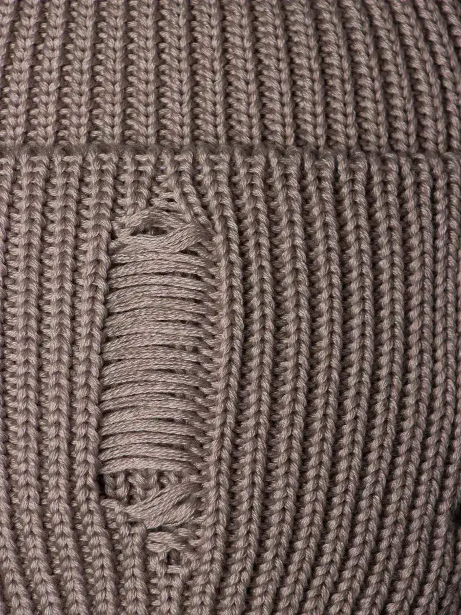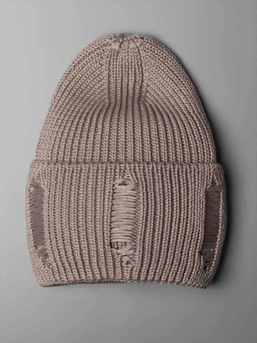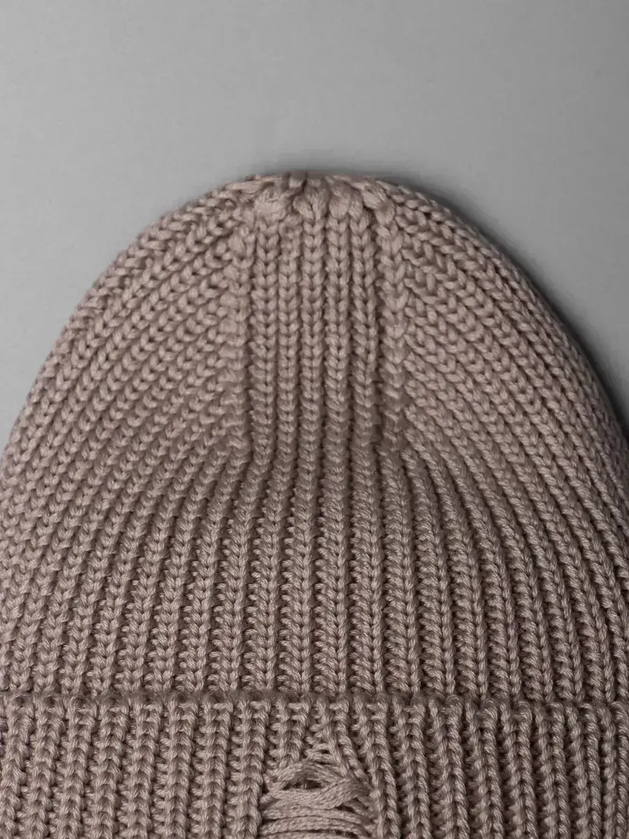 Рваный эффект придаёт шапке дерзкий, уличный характер, подчёркивая индивидуальность и чувство стиля. Она плотно сидит на голове, защищает от ветра и создаёт стильный силуэт. Отлично сочетается с пальто, куртками, худи и джинсами.