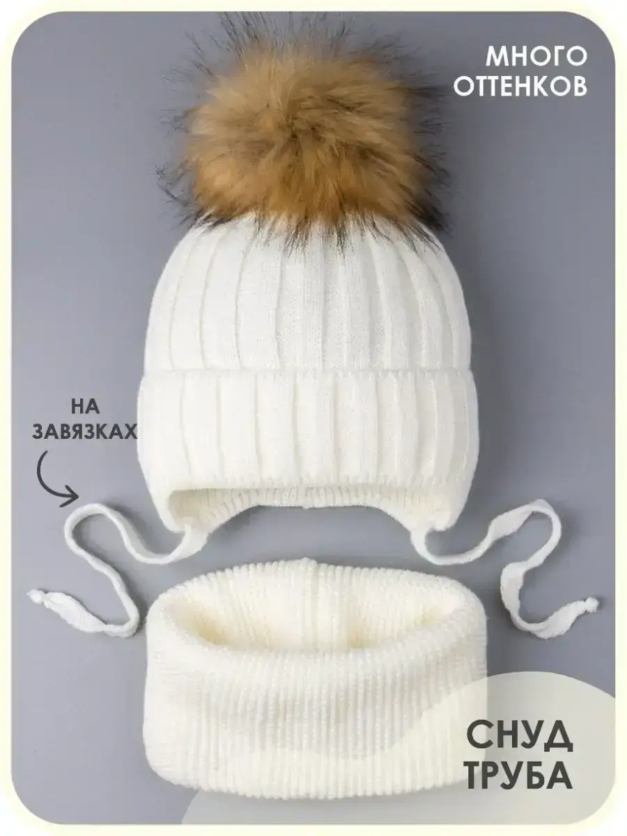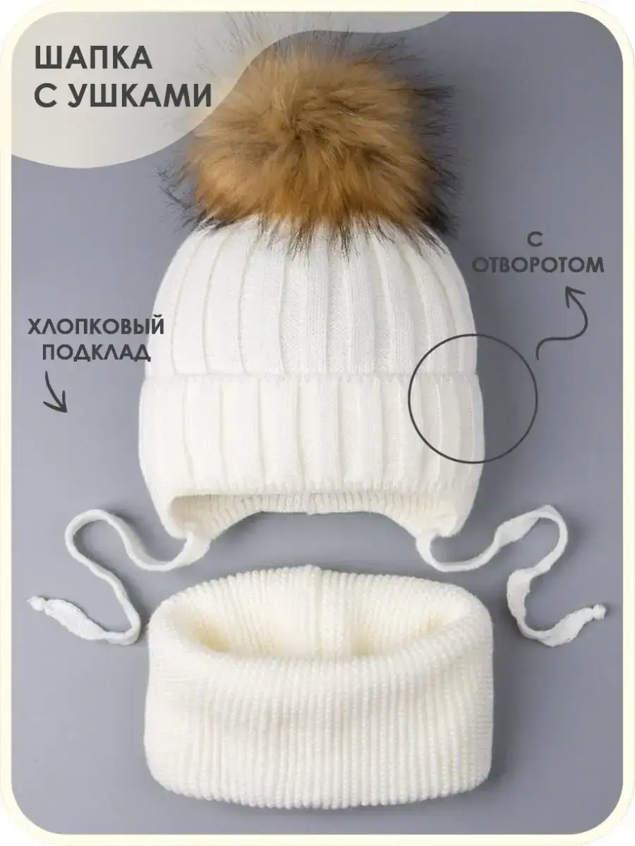 Шапка детская зимняя на завязках и снуд от бренда Ok Top - это лучший вариант на зиму и холодную осень! Благодаря большому количеству расцветок, модель подойдет для мальчиков и девочек. Вязаный комплект выполнен из качественной пряжи (в составе акрил), благодаря чему он хорошо сохраняет тепло и дарит комфорт. Теплая шапочка снабжена подкладкой из натурального хлопка, которая не дает голове вспотеть, а значит снижает риск простудиться. В качестве утеплителя используется синтепон и малышу не будет холодно даже в самый морозный день! Особый шарм придает пышный помпон из искусственного меха, который легко распушить, подержав над феном несколько секунд. Отворот на головном уборе плотно закрывает уши и шею ребенка в ветреную погоду. Мягкие завязки обеспечивают надежную фиксацию, предотвращая смещение во время движения. Классический стиль набора делает его универсальным и подходящим к любому гардеробу. Теплый снуд прекрасно растягивается и складывается вдвое, его можно надевать как под верхнюю одежду, так и под капюшон. Он не колется и не магнитится. Широкий размерный ряд позволит выбрать комплект для деток от шести месяцев до десяти лет. Идеален для прогулок, активного отдыха на свежем воздухе, школы и детского садика.