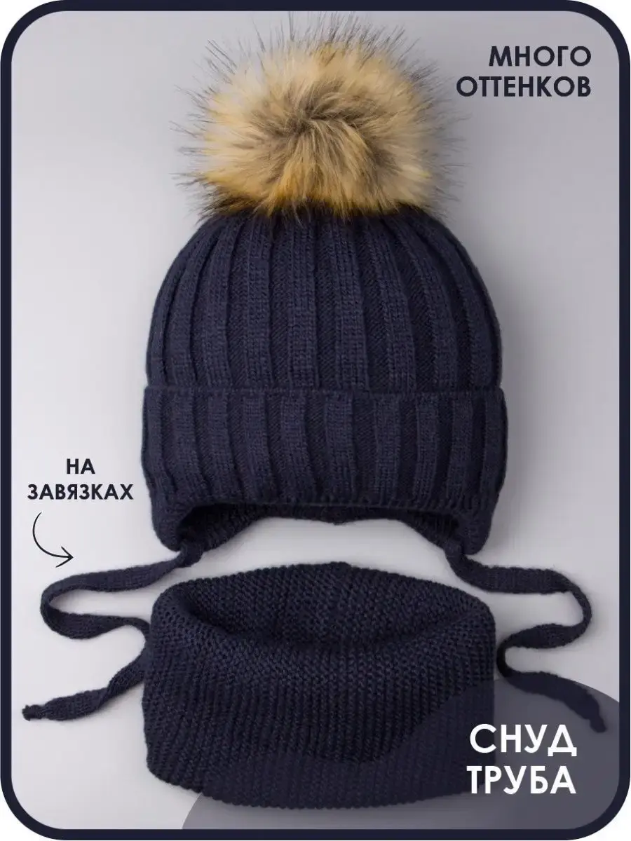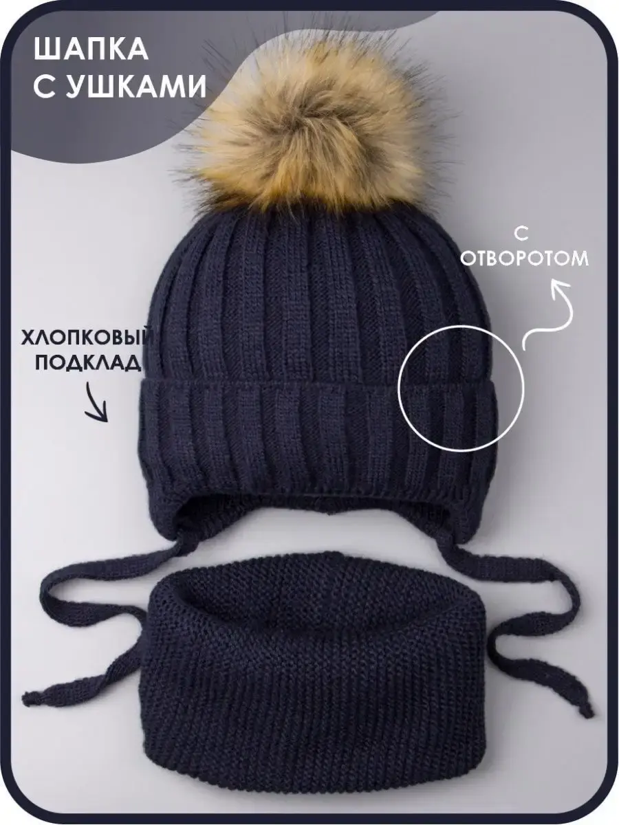Шапка детская зимняя на завязках и снуд от бренда Ok Top - это лучший вариант на зиму и холодную осень! Благодаря большому количеству расцветок, модель подойдет для мальчиков и девочек. Вязаный комплект выполнен из качественной пряжи (в составе акрил), благодаря чему он хорошо сохраняет тепло и дарит комфорт. Теплая шапочка снабжена подкладкой из натурального хлопка, которая не дает голове вспотеть, а значит снижает риск простудиться. В качестве утеплителя используется синтепон и малышу не будет холодно даже в самый морозный день! Особый шарм придает пышный помпон из искусственного меха, который легко распушить, подержав над феном несколько секунд. Отворот на головном уборе плотно закрывает уши и шею ребенка в ветреную погоду. Мягкие завязки обеспечивают надежную фиксацию, предотвращая смещение во время движения. Классический стиль набора делает его универсальным и подходящим к любому гардеробу. Теплый снуд прекрасно растягивается и складывается вдвое, его можно надевать как под верхнюю одежду, так и под капюшон. Он не колется и не магнитится. Широкий размерный ряд позволит выбрать комплект для деток от шести месяцев до десяти лет. Идеален для прогулок, активного отдыха на свежем воздухе, школы и детского садика.