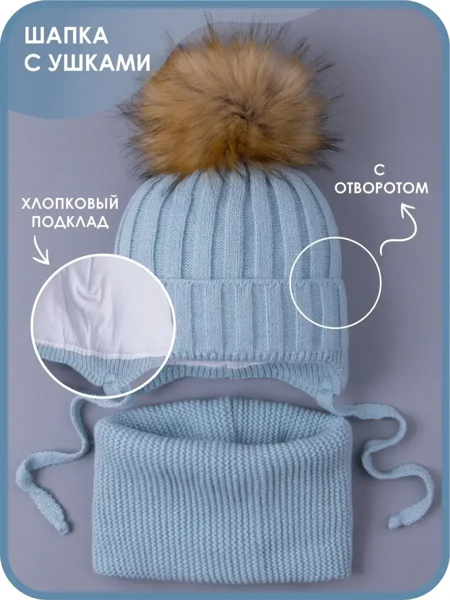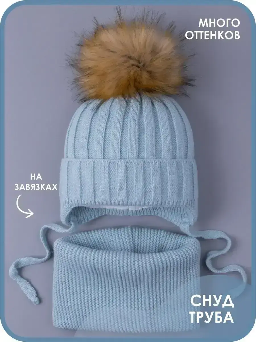 Шапка детская зимняя на завязках и снуд от бренда Ok Top - это лучший вариант на зиму и холодную осень! Благодаря большому количеству расцветок, модель подойдет для мальчиков и девочек. Вязаный комплект выполнен из качественной пряжи (в составе акрил), благодаря чему он хорошо сохраняет тепло и дарит комфорт. Теплая шапочка снабжена подкладкой из натурального хлопка, которая не дает голове вспотеть, а значит снижает риск простудиться. В качестве утеплителя используется синтепон и малышу не будет холодно даже в самый морозный день! Особый шарм придает пышный помпон из искусственного меха, который легко распушить, подержав над феном несколько секунд. Отворот на головном уборе плотно закрывает уши и шею ребенка в ветреную погоду. Мягкие завязки обеспечивают надежную фиксацию, предотвращая смещение во время движения. Классический стиль набора делает его универсальным и подходящим к любому гардеробу. Теплый снуд прекрасно растягивается и складывается вдвое, его можно надевать как под верхнюю одежду, так и под капюшон. Он не колется и не магнитится. Широкий размерный ряд позволит выбрать комплект для деток от шести месяцев до десяти лет. Идеален для прогулок, активного отдыха на свежем воздухе, школы и детского садика.