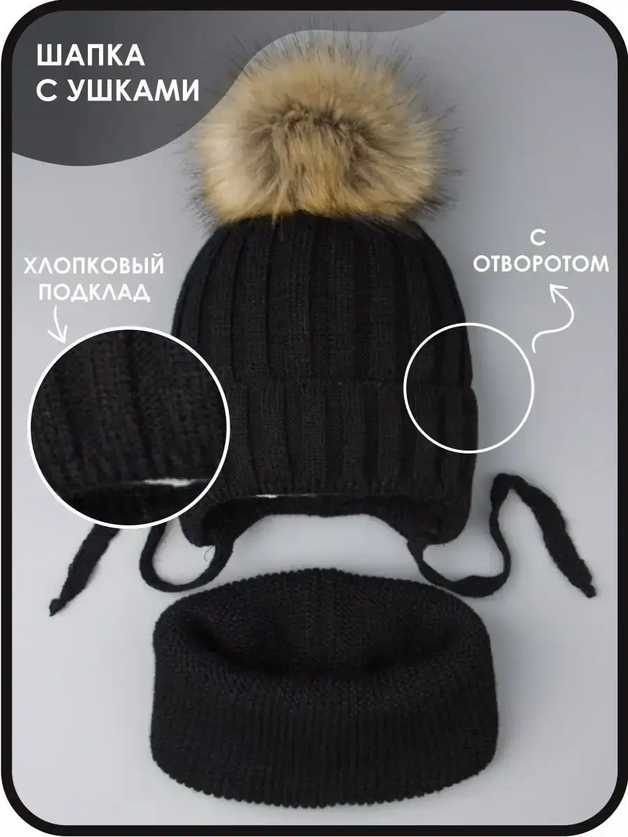 Шапка детская зимняя на завязках и снуд от бренда Ok Top - это лучший вариант на зиму и холодную осень! Благодаря большому количеству расцветок, модель подойдет для мальчиков и девочек. Вязаный комплект выполнен из качественной пряжи (в составе акрил), благодаря чему он хорошо сохраняет тепло и дарит комфорт. Теплая шапочка снабжена подкладкой из натурального хлопка, которая не дает голове вспотеть, а значит снижает риск простудиться. В качестве утеплителя используется синтепон и малышу не будет холодно даже в самый морозный день! Особый шарм придает пышный помпон из искусственного меха, который легко распушить, подержав над феном несколько секунд. Отворот на головном уборе плотно закрывает уши и шею ребенка в ветреную погоду. Мягкие завязки обеспечивают надежную фиксацию, предотвращая смещение во время движения. Классический стиль набора делает его универсальным и подходящим к любому гардеробу. Теплый снуд прекрасно растягивается и складывается вдвое, его можно надевать как под верхнюю одежду, так и под капюшон. Он не колется и не магнитится. Широкий размерный ряд позволит выбрать комплект для деток от шести месяцев до десяти лет. Идеален для прогулок, активного отдыха на свежем воздухе, школы и детского садика.