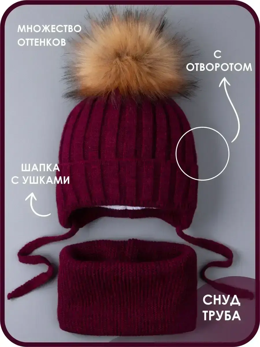 Шапка детская зимняя на завязках и снуд от бренда Ok Top - это лучший вариант на зиму и холодную осень! Благодаря большому количеству расцветок, модель подойдет для мальчиков и девочек. Вязаный комплект выполнен из качественной пряжи (в составе акрил), благодаря чему он хорошо сохраняет тепло и дарит комфорт. Теплая шапочка снабжена подкладкой из натурального хлопка, которая не дает голове вспотеть, а значит снижает риск простудиться. В качестве утеплителя используется синтепон и малышу не будет холодно даже в самый морозный день! Особый шарм придает пышный помпон из искусственного меха, который легко распушить, подержав над феном несколько секунд. Отворот на головном уборе плотно закрывает уши и шею ребенка в ветреную погоду. Мягкие завязки обеспечивают надежную фиксацию, предотвращая смещение во время движения. Классический стиль набора делает его универсальным и подходящим к любому гардеробу. Теплый снуд прекрасно растягивается и складывается вдвое, его можно надевать как под верхнюю одежду, так и под капюшон. Он не колется и не магнитится. Широкий размерный ряд позволит выбрать комплект для деток от шести месяцев до десяти лет. Идеален для прогулок, активного отдыха на свежем воздухе, школы и детского садика.