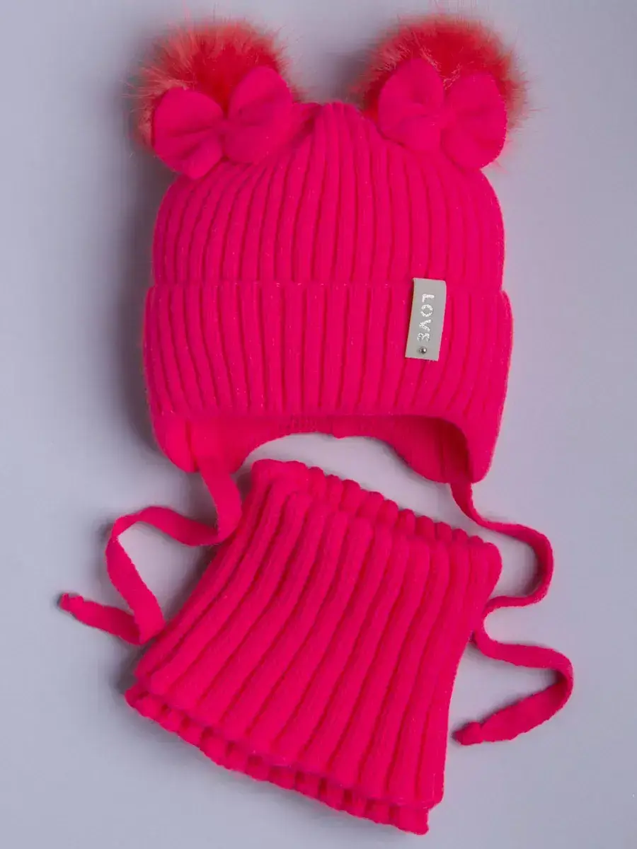 Шапка для девочки на завязках и снуд красиво дополнят образ маленькой принцессы! Детский головной убор отлично подойдет на зиму и холодную осень. Он представлен в нескольких размерах для детей от шести месяцев до десяти лет. Детский комплект выполнен из высококачественной пряжи, поэтому он очень мягкий, теплый и долговечный. Утепленная синтепоном шапочка для девочки не даст замерзнуть вашему ребенку даже при температуре -25 °C. Вязаный зимний детский комплект представлен в широкой линейке самых модных расцветок и прекрасно сочетается с любым гардеробом малыша. Детская шапка с двумя помпонами в виде ушек и милыми бантиками придаст настроение и нежность любому наряду! Стильная съемная брошь с надписью «LOVE» добавляет индивидуальности, при этом ее легко отстегнуть на время ухода за изделием. Снуд детский невероятно мягкий и хорошо защищает шею от холода. Он легко растягивается и складывается вдвое. Манишку можно надевать как под верхнюю одежду, так и на капюшон. Комплект для малыша станет удобным атрибутом для активного отдыха и прогулок на свежем воздухе!